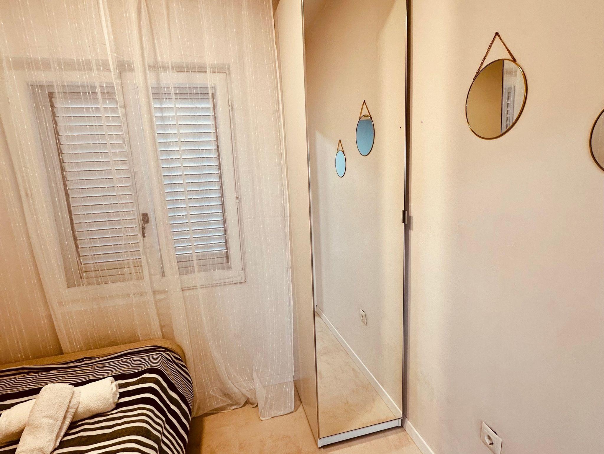 Ferienwohnung bietet Platz für 3 Gäste. Die Betten sind in Schlafzimmern, die es 1 gibt, und in Wohnzimmer, innerhalb einer Gesamtfläche von 22m2, angeordnet. Die Gäste haben eine eigene Terrasse zur Verfügung, auf der sie in warmen Sommernächten genießen können. Das Apartment bietet Meerblick. Es ist erlaubt, Speisen auf dem Gemeinschafts-Grill vorzubereiten. IM PREIS INBEGRIFFEN: Kurtaxe, Endreinigung, Klimatisierung, Internet, Bügeleisen, Föhn. Die Verfügbarkeit zusätzlicher Dienstleistungen in Ihrem reservierten Termin und die Preise derselben (falls nicht aufgeführt) müssen im Voraus überprüft werden. Zusätzliche Dienstleistungen die in der Zahlungsaufforderung nicht aufgeführt sind werden direkt beim Vermieter bezahlt, angenommen der Gast nutzt auch diese.