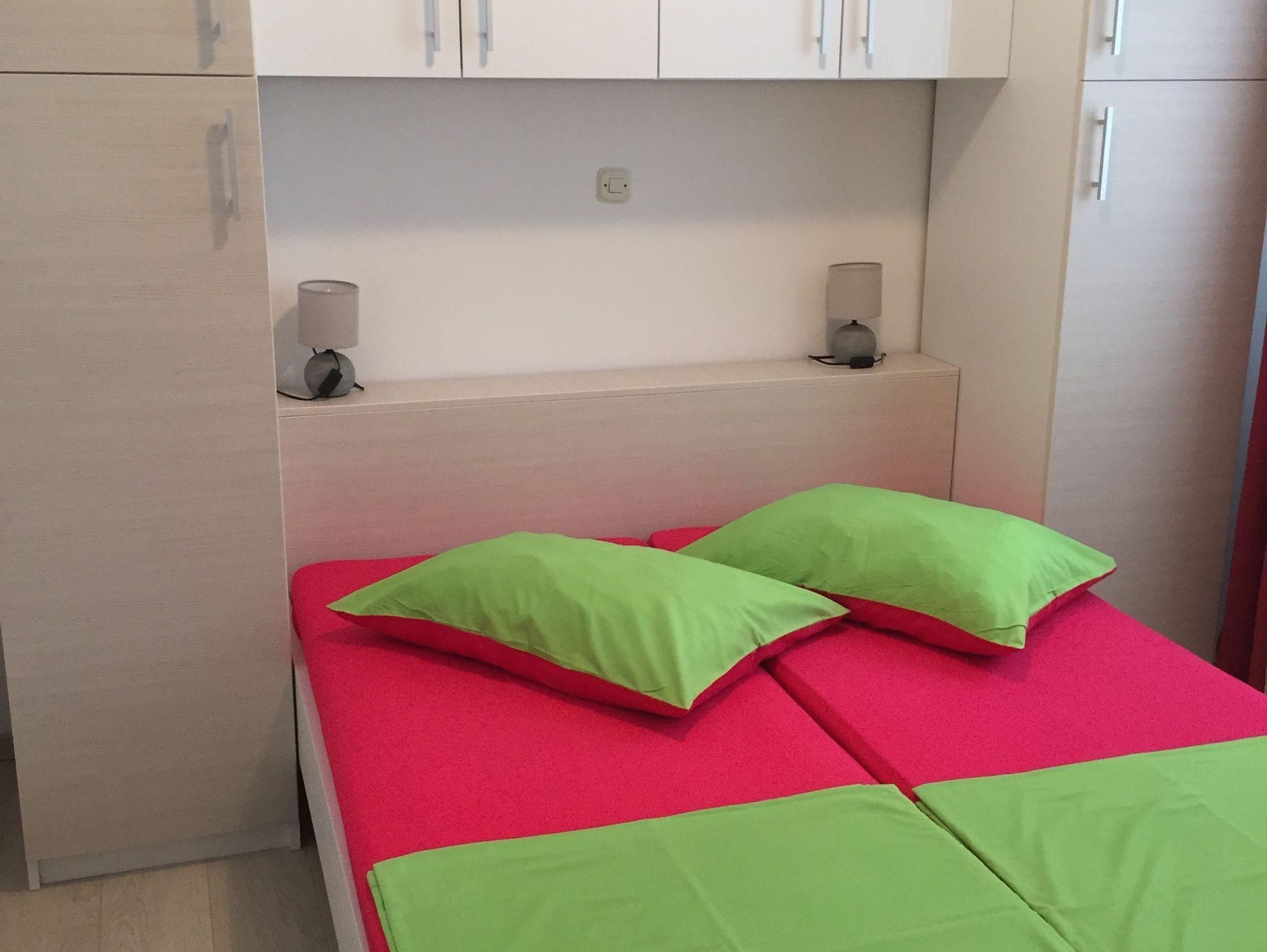 Ferienwohnung bietet Platz für 5 Gäste. Die Betten sind in Schlafzimmern, die es 2 gibt, und in Esszimmer, innerhalb einer Gesamtfläche von 35m2, angeordnet. Die Gäste haben eine eigene Terrasse zur Verfügung, auf der sie in warmen Sommernächten genießen können. Es ist erlaubt, Speisen auf dem Gemeinschafts-Grill vorzubereiten. In der Unterkunftseinheit besteht die Möglichkeit des Mitbringens von Haustieren gegen Aufpreis. IM PREIS INBEGRIFFEN: Kurtaxe, Endreinigung, Parkplatz, Internet, Bootsanlegeplatz, Föhn, Sonnenschirm, Liegestühle. VERBINDLICHE ZUSÄTZLICHE KOSTEN: Aufzahlung für Kurzaufenthalte (prozentualer Zuschlag pro Nächtigungsanzahl: 30% - 1, 20% - 2, 10% - 3). UNVERBINDLICHE ZUSÄTZLICHE KOSTEN: Klimatisierung (5,00 € pro Nacht), Haustiere (5,00 € pro Nacht). Die Verfügbarkeit zusätzlicher Dienstleistungen in Ihrem reservierten Termin und die Preise derselben (falls nicht aufgeführt) müssen im Voraus überprüft werden. Zusätzliche Dienstleistungen die in der Zahlungsaufforderung nicht aufgeführt sind werden direkt beim Vermieter bezahlt, angenommen der Gast nutzt auch diese.