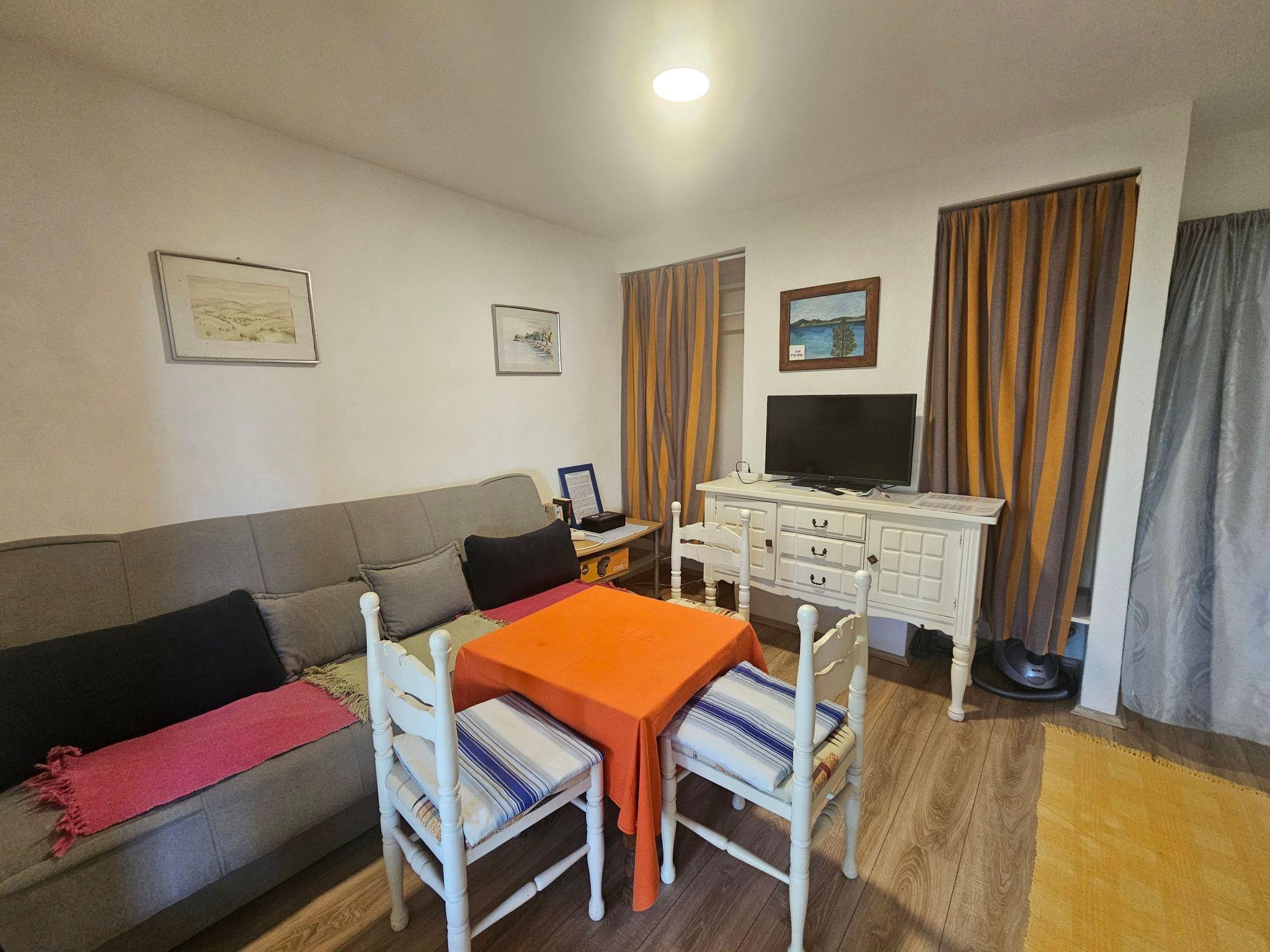 Inside, the flat is thoughtfully equipped to ensure a comfortable and convenient stay. It features a cozy dining-living room where guests can unwind and connect, alongside a well-appointed kitchen for preparing light meals and snacks. With two bedrooms, one with two separate beds and another with a double bed, it caters to a variety of group dynamics, ensuring everyone has a restful night's sleep. The bathroom boasts a modern shower, adding to the comfort of your stay. Essential amenities such as air conditioning (in part), Wi-Fi, and satellite TV are also provided, enhancing your holiday experience.