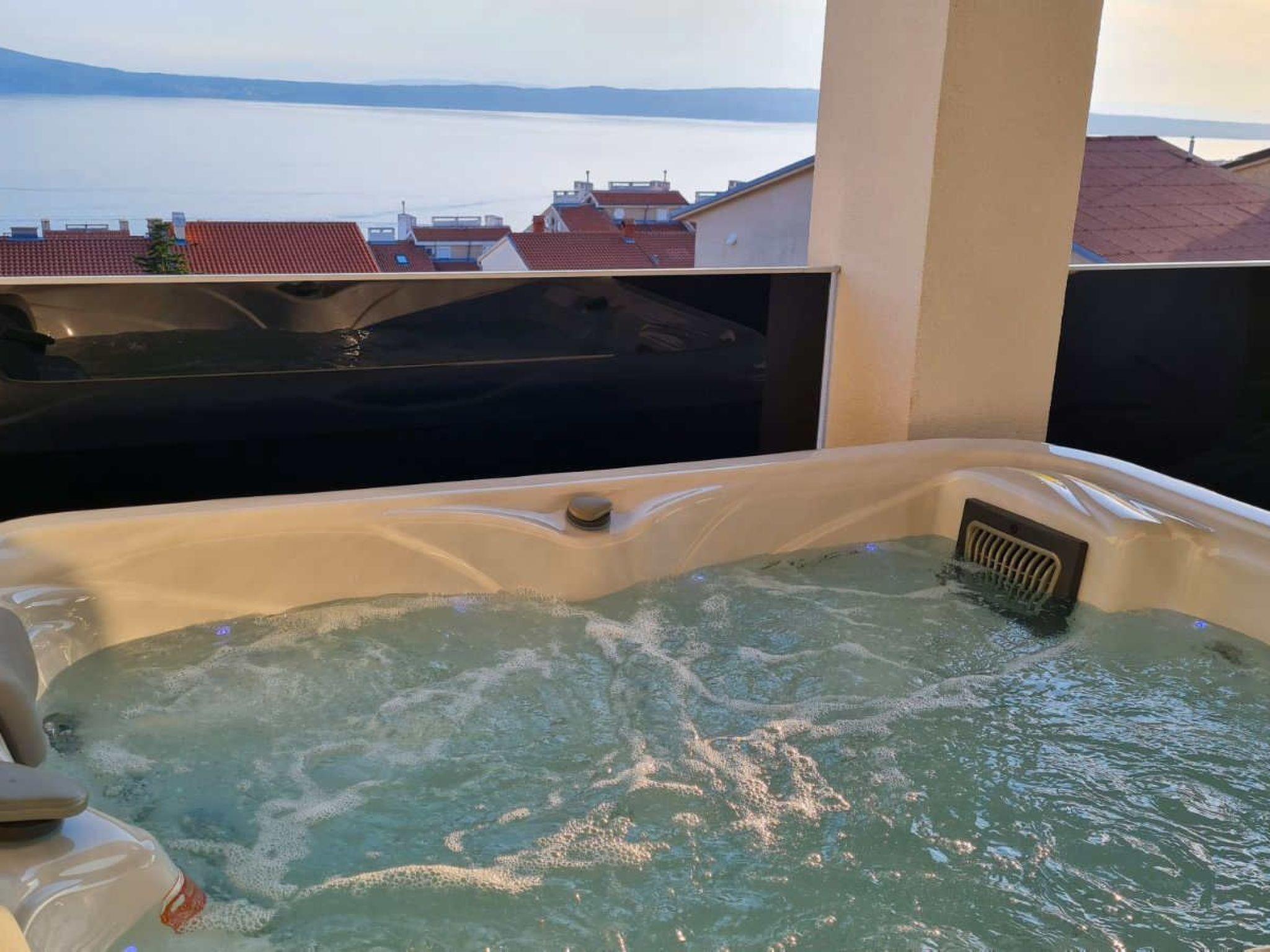Stepping outside, the apartment extends its offerings with two captivating balconies and a spectacular roof terrace. The balconies, perfect for early morning coffees or evening relaxation, offer stunning views of the sea and the island of Krk. The roof terrace, however, is a tranquil haven of its own. It's furnished with a table, chairs, and two comfort loungers and features a private jacuzzi. This exclusive space invites guests to unwind under the sky, whether it's enjoying the whirl of the jacuzzi or simply soaking in the picturesque surrounds.