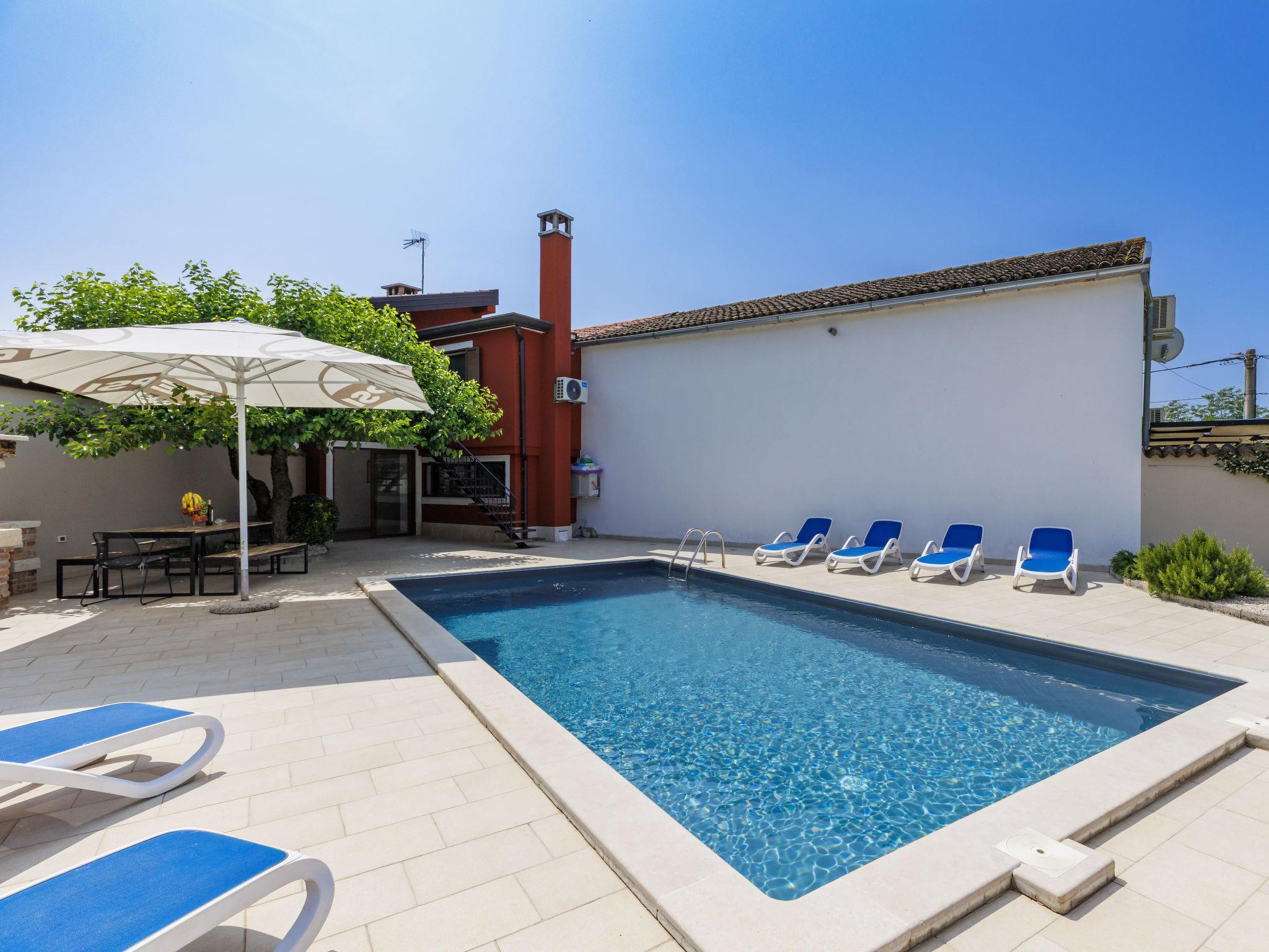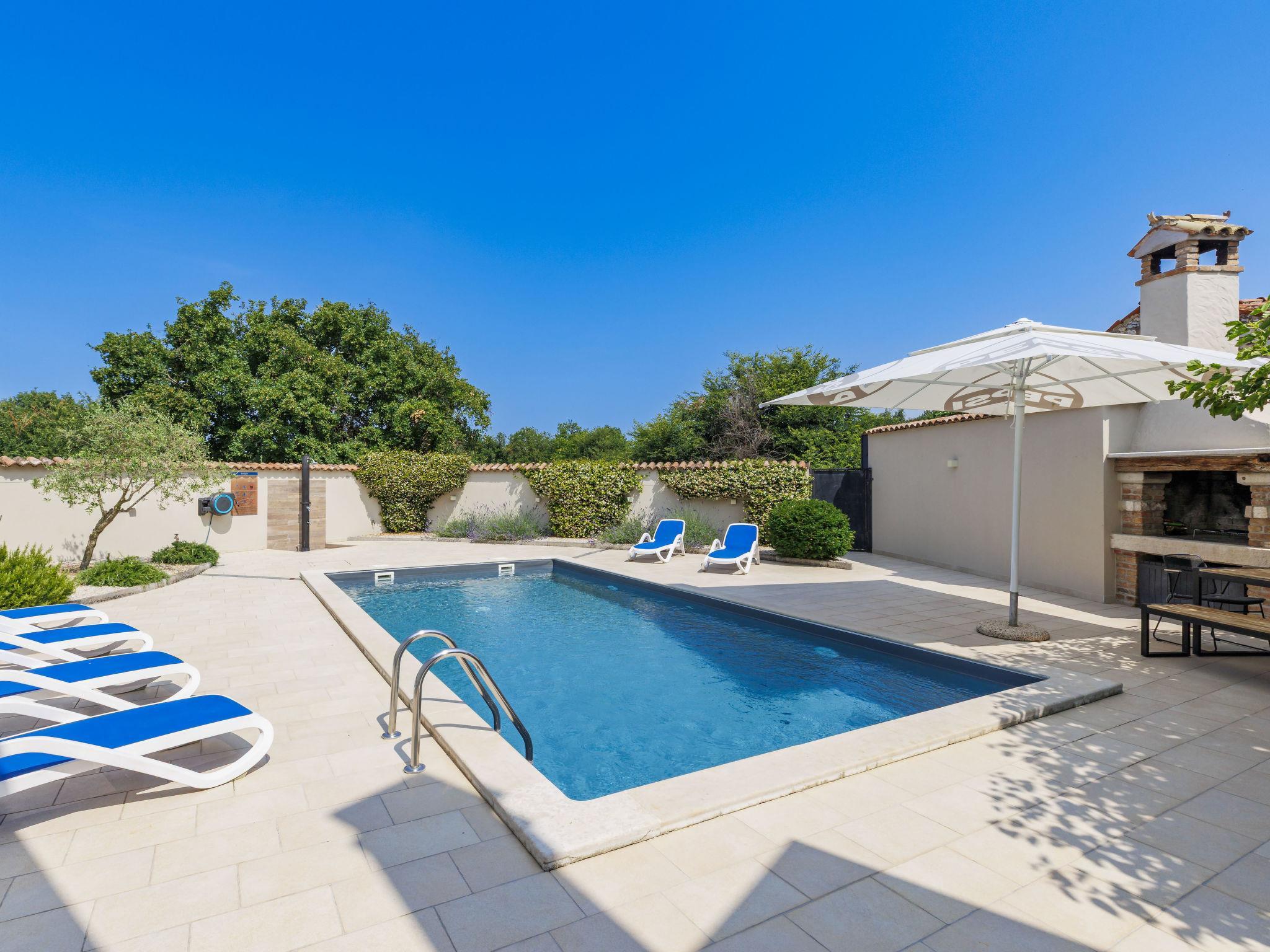 Beautiful semi-detached house "Darija", 2 storeys. In the hamlet Pavici 1 km from the centre of Nova Vas, 3 km from the centre of Brtonigla, 7 km from the centre of Novigrad, in a quiet, sunny position, 8 km from the sea. Private: property 500 m2 (fenced), garden with wildlife garden, swimming pool angular (8 x 4 m, depth 140 cm, seasonal availability: 01.Jun. - 15.Sep.). Outdoor shower, garden furniture, barbecue. In the house: internet access, trampoline, washing machine. Parking on the premises. Shop 1 km, supermarket 8 km, restaurant 1 km, bus stop 3.6 km, pebble beach 8 km, rocky beach 8 km. Walking paths from the house 500 m, cycle lane 550 m. Nearby attractions: Aquapark 2 km. Semi-detached house consists of 2 apartments rented as one unit.