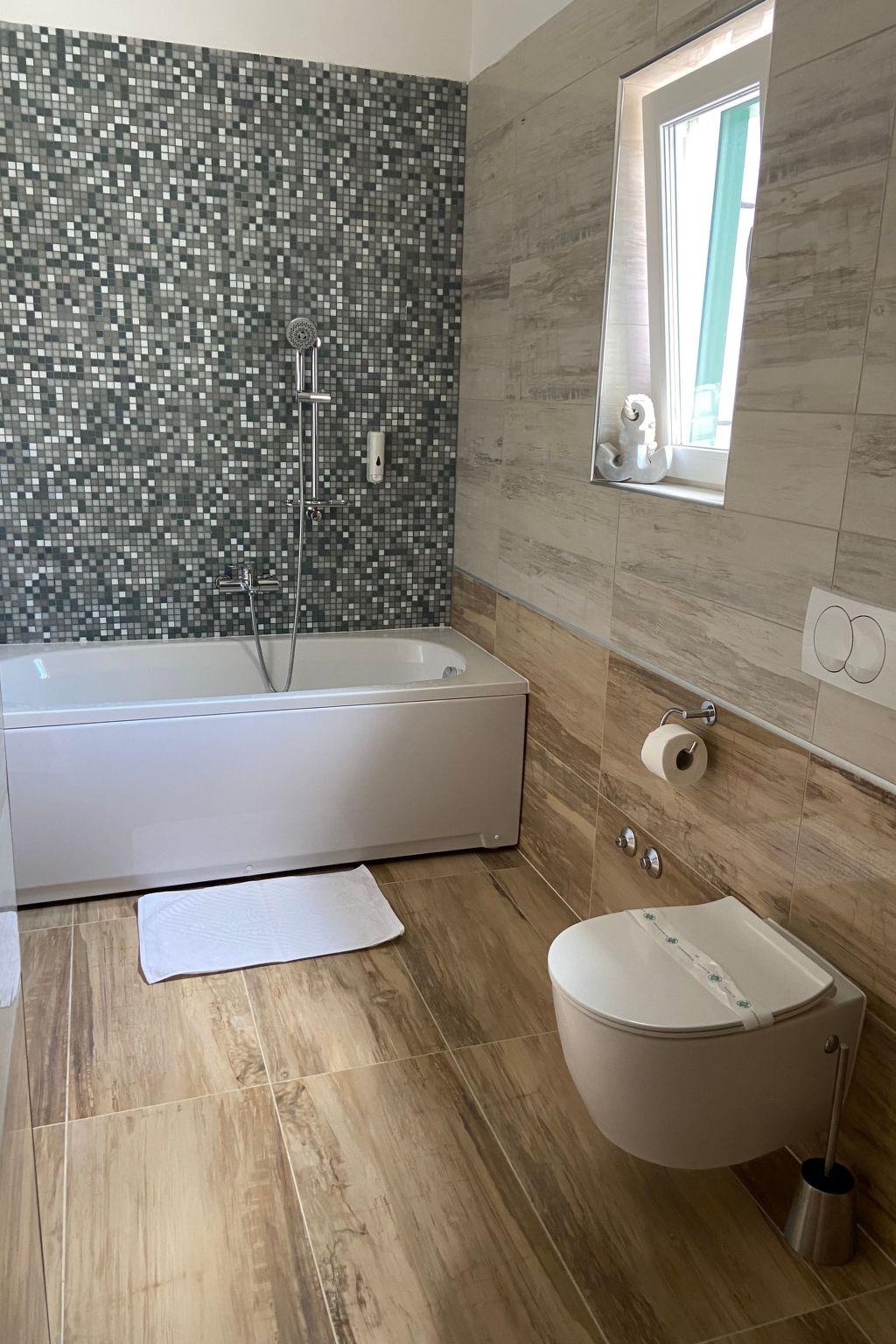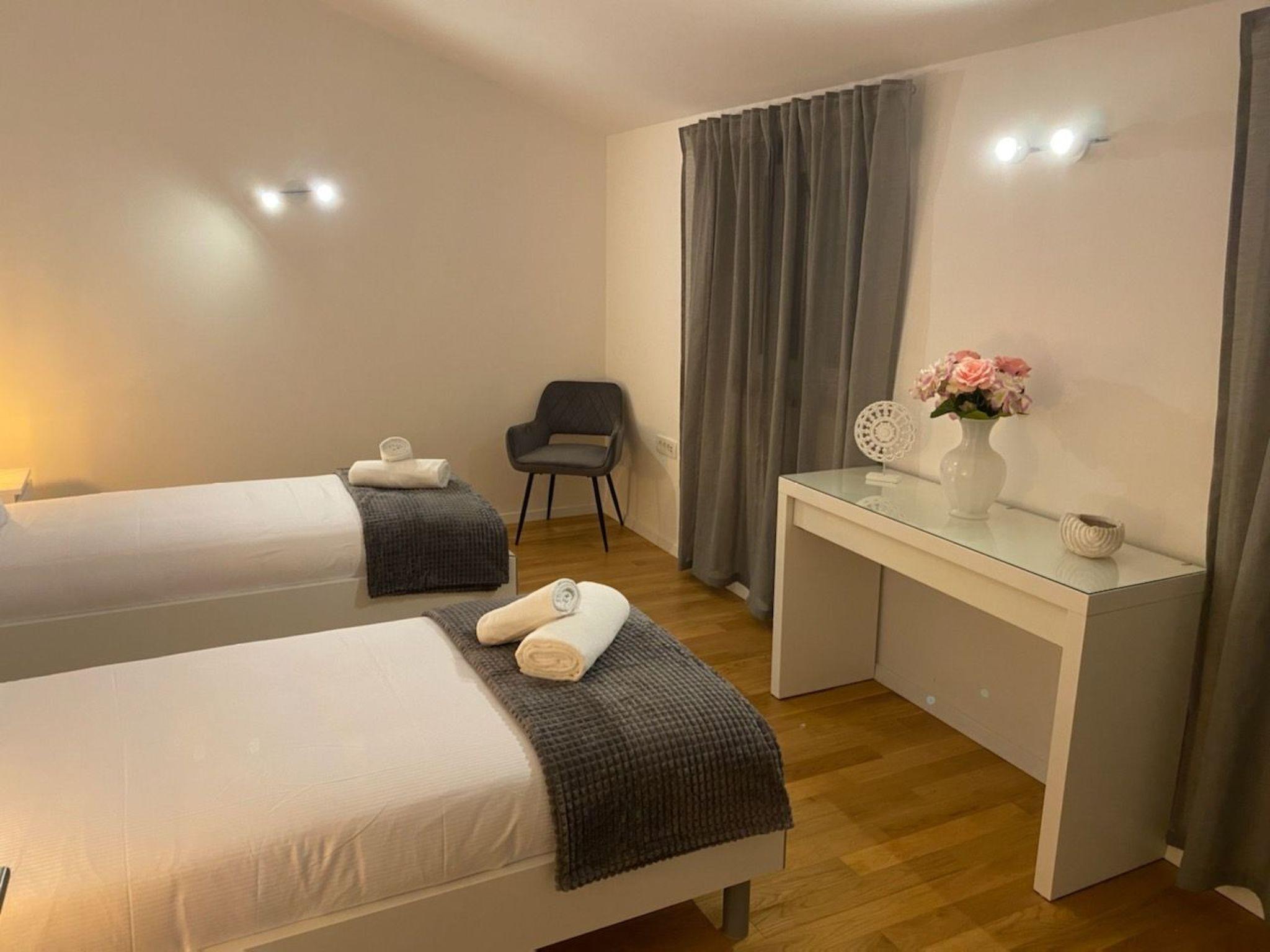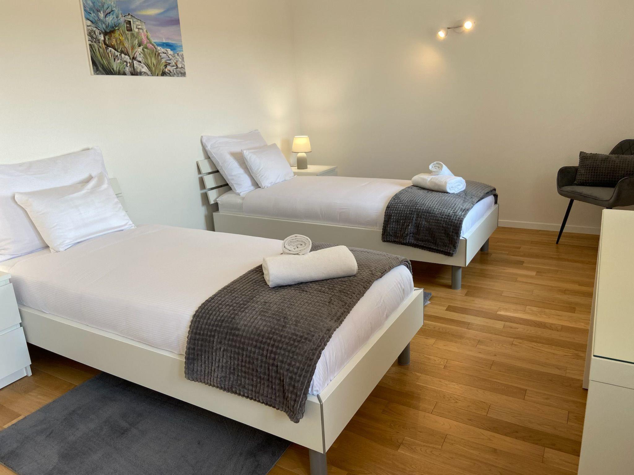 The spacious villa has 4 bedrooms, a living room and a kitchen with a dining room. On the first floor there is a master bedroom with a private bathroom with a bathtub and access to its own terrace, while the other two bedrooms on the floor share a bathroom with a large bathtub. On the ground floor there is another master bedroom with a shower cabin and exit to its own terrace, a toilet, a large equipped kitchen and a living room with a smart TV and a storage room. The villa is air-conditioned and has free high-speed WI-FI internet connection.