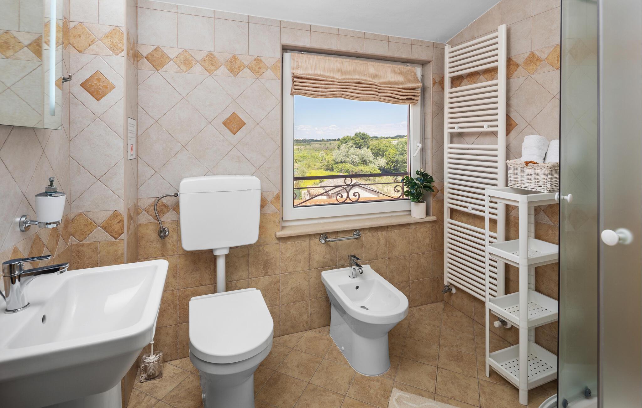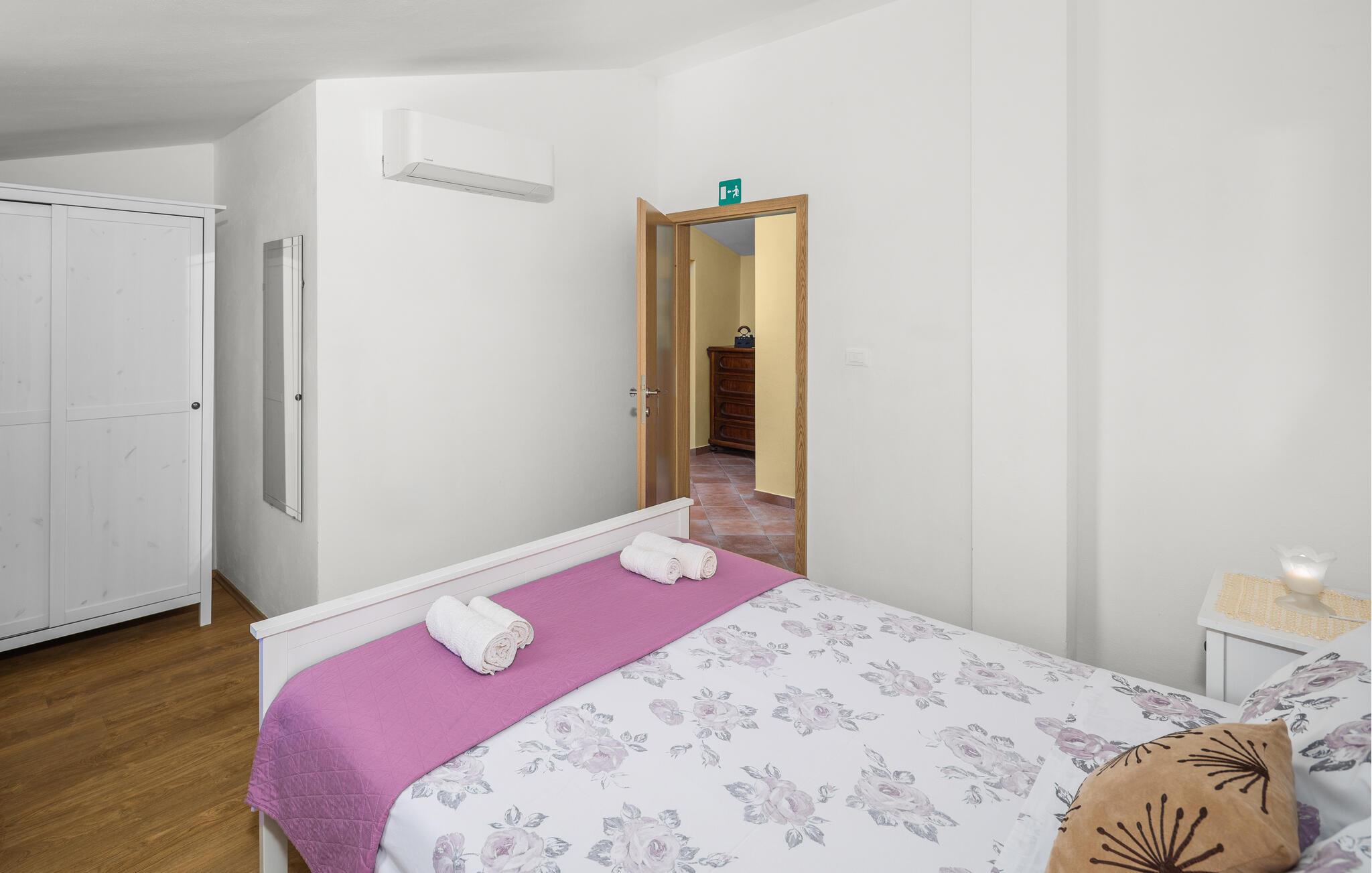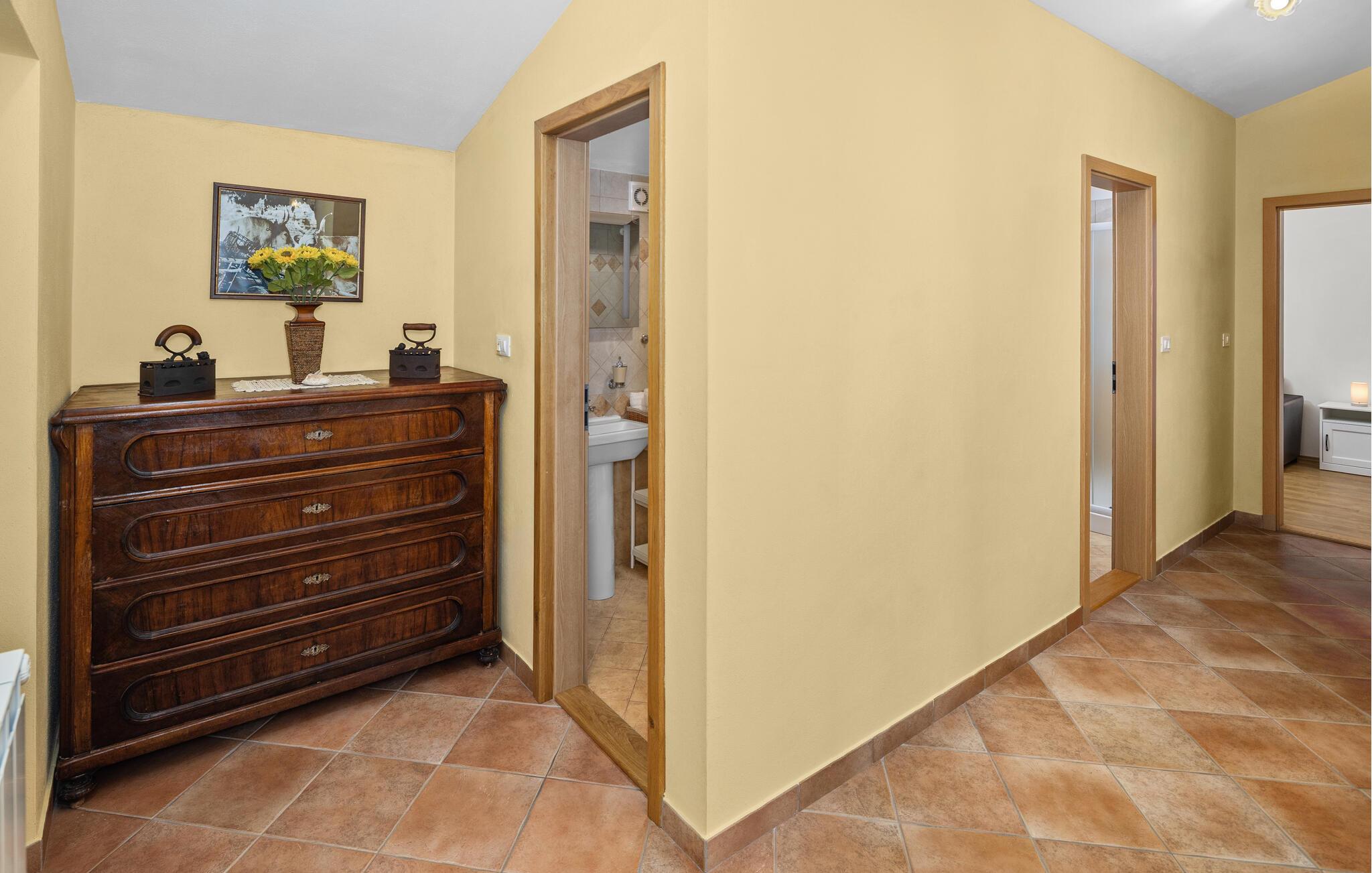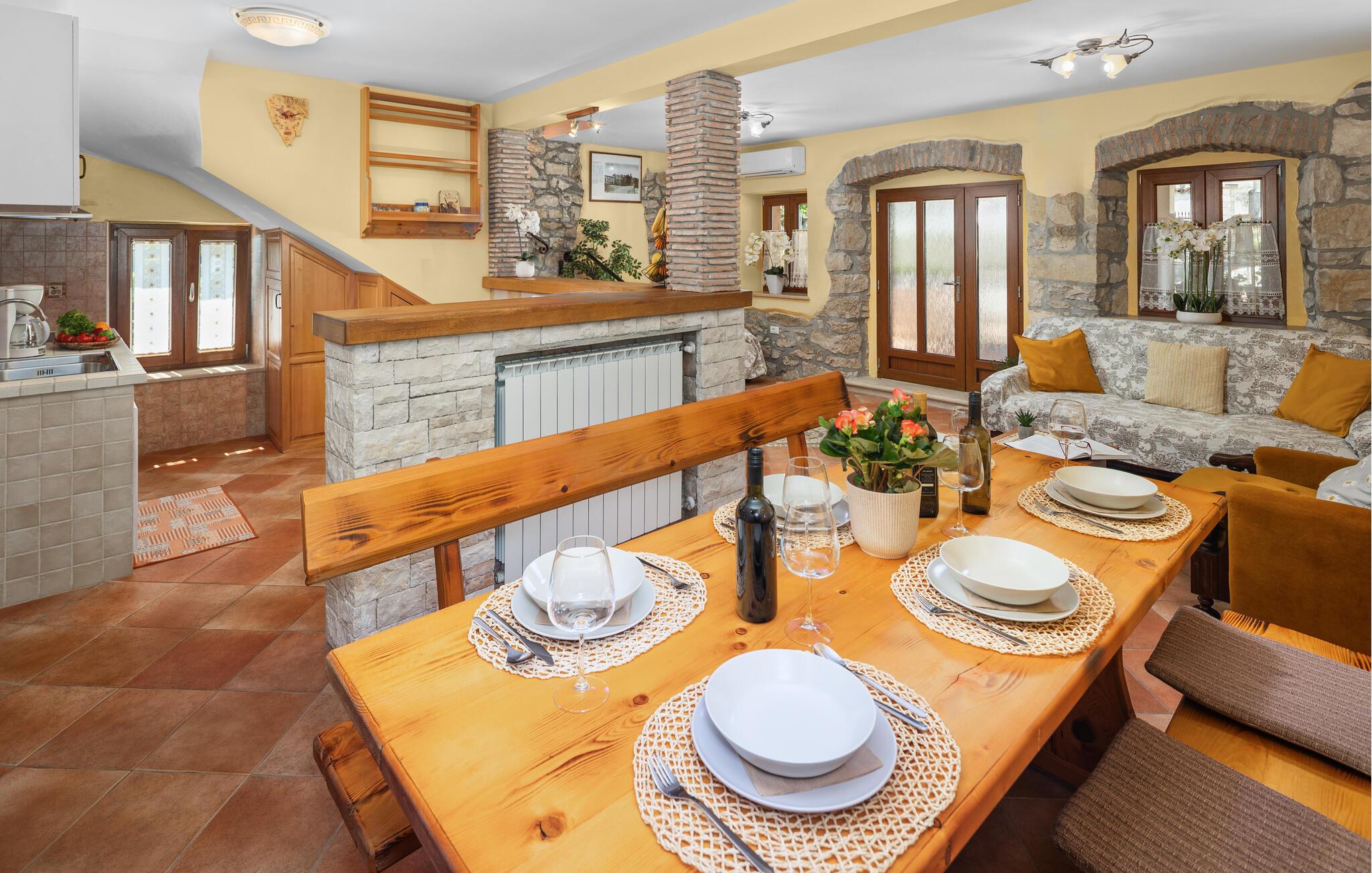 Dette feriehuset ligger i landsbyen Nova Vas, i nærheten av byen Novigrad, og har atmosfæren til en tradisjonell konstruksjon. Interiøret er designet i middelhavsstil og strekker seg over første etasje og første etasje. Hagen inviterer deg til å forfriske deg i utendørsbassenget på varme sommerdager og til å tilberede deilige måltider på den tilgjengelige grillen om kveldene. Vi anbefaler et besøk til kystbyene Porec, Rovinj og Pula, som tilbyr underholdning med forskjellige arrangementer i sommermånedene.