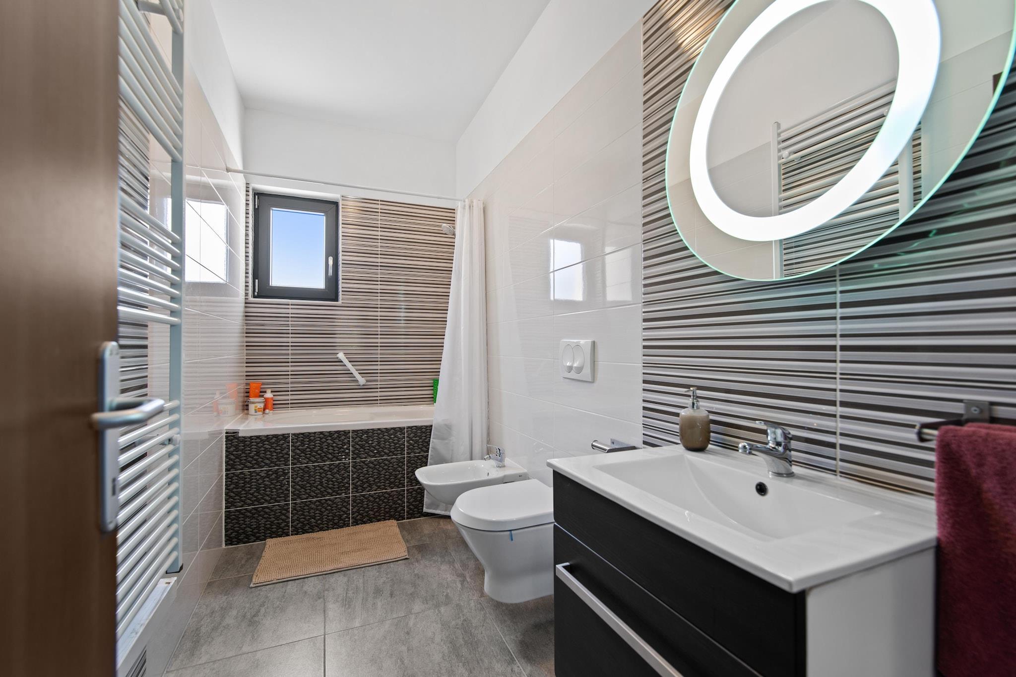 Denne stilige villaen i Novigrad er vert for seks gjester fordelt på tre soverom, hver med sitt eget bad. Stuen har satellitt-TV og en koselig sittegruppe, mens kjøkkenet er fullt utstyrt med moderne apparater som oppvaskmaskin, stekeovn og kaffemaskin. En privat terrasse og uteplass tilbyr sømløs opphold innendørs og utendørs. Slapp av i det oppvarmede private bassenget eller nyt utendørsdusjen etter soling på solsengene. Den inngjerdede hagen inkluderer en grill, parasoll og salongsett, perfekt for utendørs servering. Villaen har klimaanlegg og gratis Wi-Fi, og blander luksus med bekvemmelighet. Villaen ligger 2 km fra Novigrad sentrum og havet, og tilbyr enkel tilgang til butikker, restauranter (bare 500 m unna) og medisinske tjenester. Enten du spaserer til stranden eller utforsker Istrias kystsjarm, er denne villaen en rolig base for ferien.