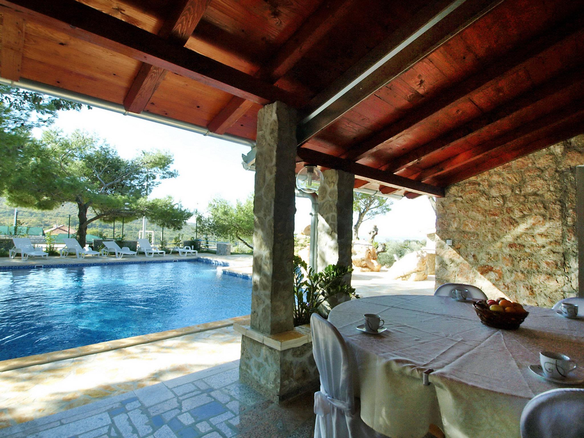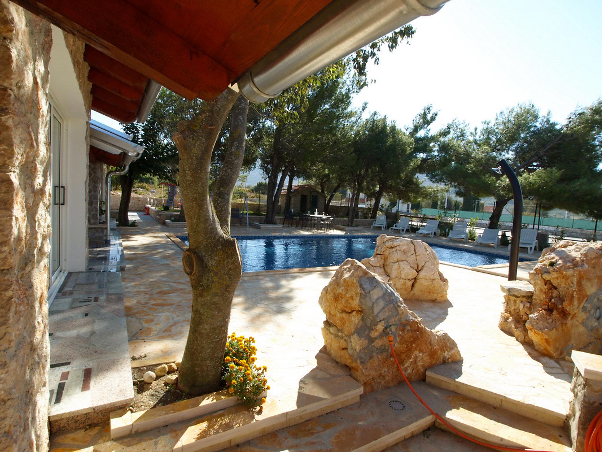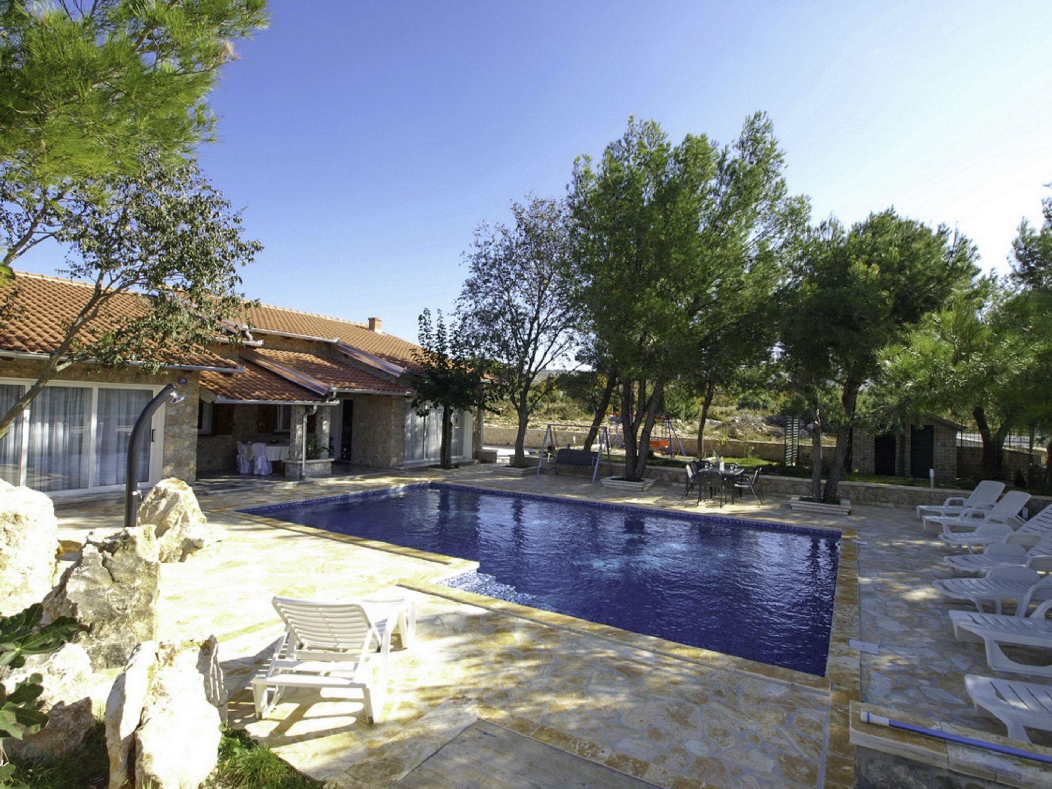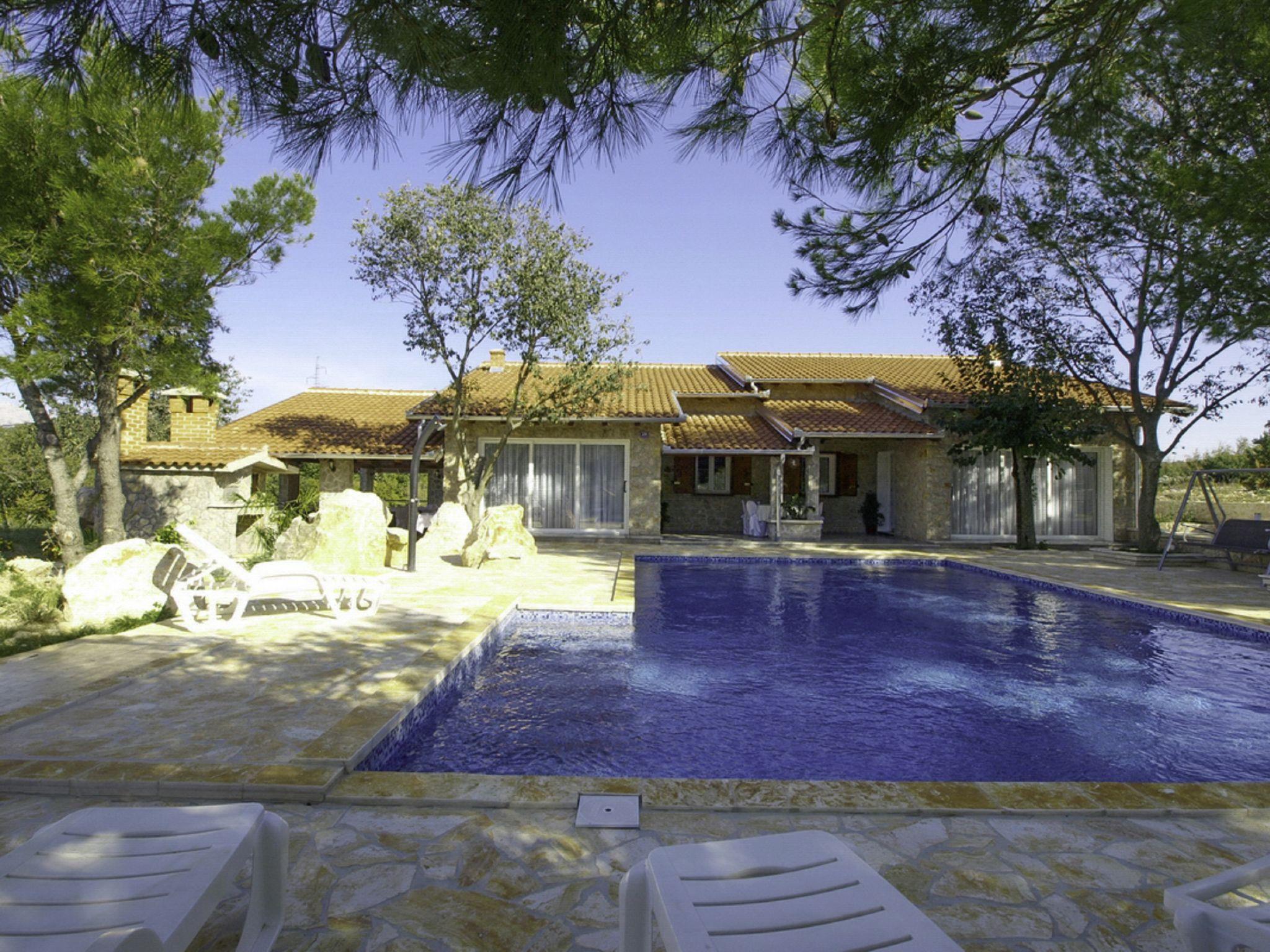 Single-family house "Villa Sandra". In the centre of Kruševo 10 km from the centre of Obrovac, in a sunny position on a slope, 5 km from the sea, in the countryside. Private: property 1'000 m2, garden, swimming pool (10 x 6 m, 63 m2, depth 140 cm, seasonal availability: 09.May. - 19.Sep.) with internal staircase. Outdoor shower, barbecue, children's playground. In the house: internet access, washing machine. Airport transfer (extra). Parking at the house on the premises. Shop 100 m, restaurant 4.5 km, bus stop 23.2 km, pebble beach 5 km. Nearby attractions: Rafting Zrmanja 10 km. Groups of teenagers on request only. The unit consists of 2 apartments rented as one unit. Possibility of daily trips by owner`s mini bus (on request, extra). Mini zoo (8 km).