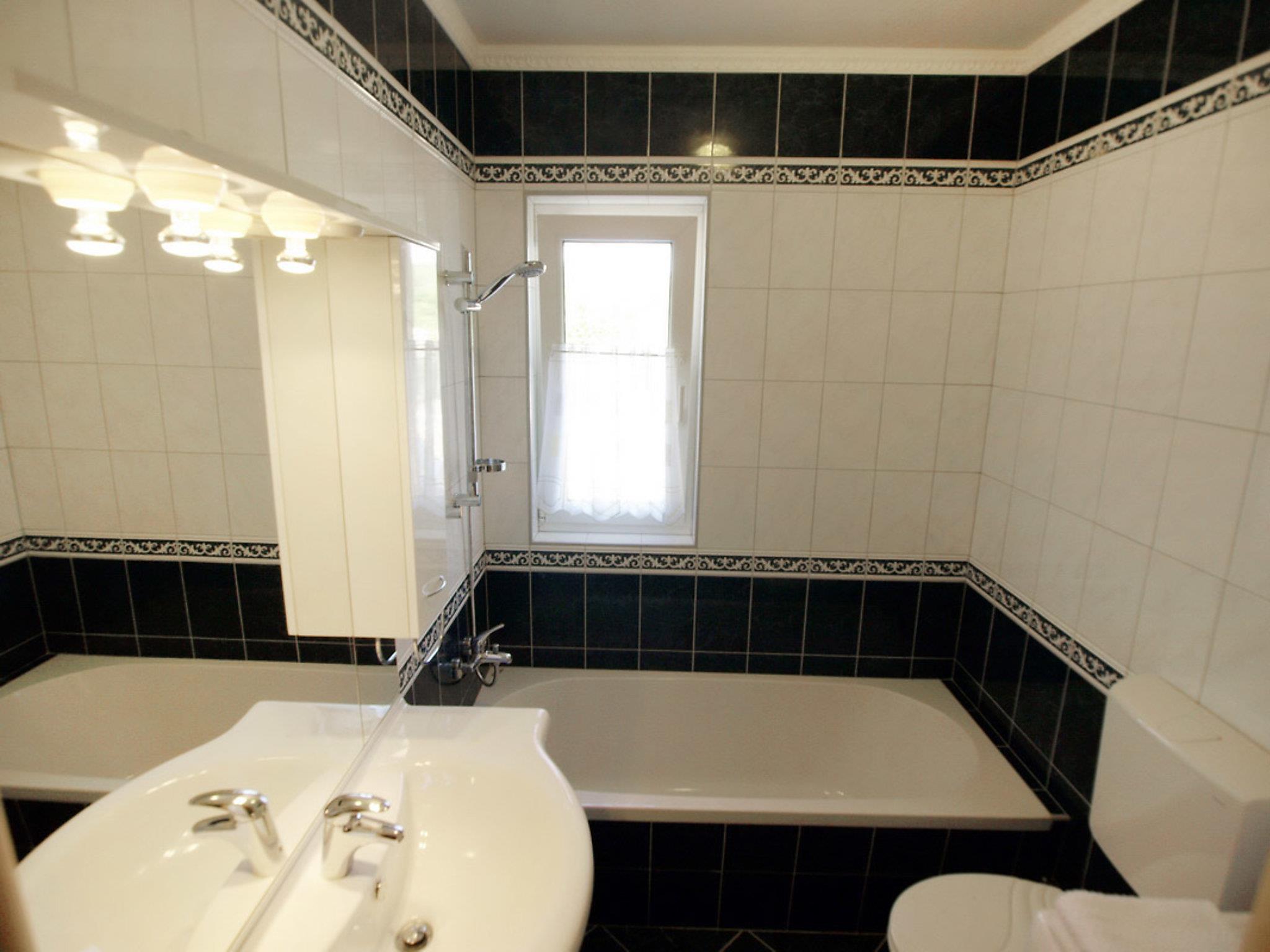 6-room house 120 m2, south-west facing position. Living/dining room with kitchen corner and satellite TV (flat screen), air conditioning. Exit to the terrace. 2 rooms, each room with 1 double bed (2 x 80 cm, length 200 cm). Living/dining room with satellite TV (flat screen), air conditioning. Exit to the terrace. 2 rooms, each room with 1 double bed (2 x 80 cm, length 200 cm). Open kitchen (4 hot plates, oven, dishwasher, microwave, freezer, electric coffee machine). 2 baths/WC. Terrace 15 m2, roofed, terrace 30 m2, roofed. Terrace furniture, deck chairs. View of the countryside. Facilities: washing machine. Internet (WiFi, free). Parking (fenced). Each apartment with living/dining area, open kitchen and 2 bedrooms.