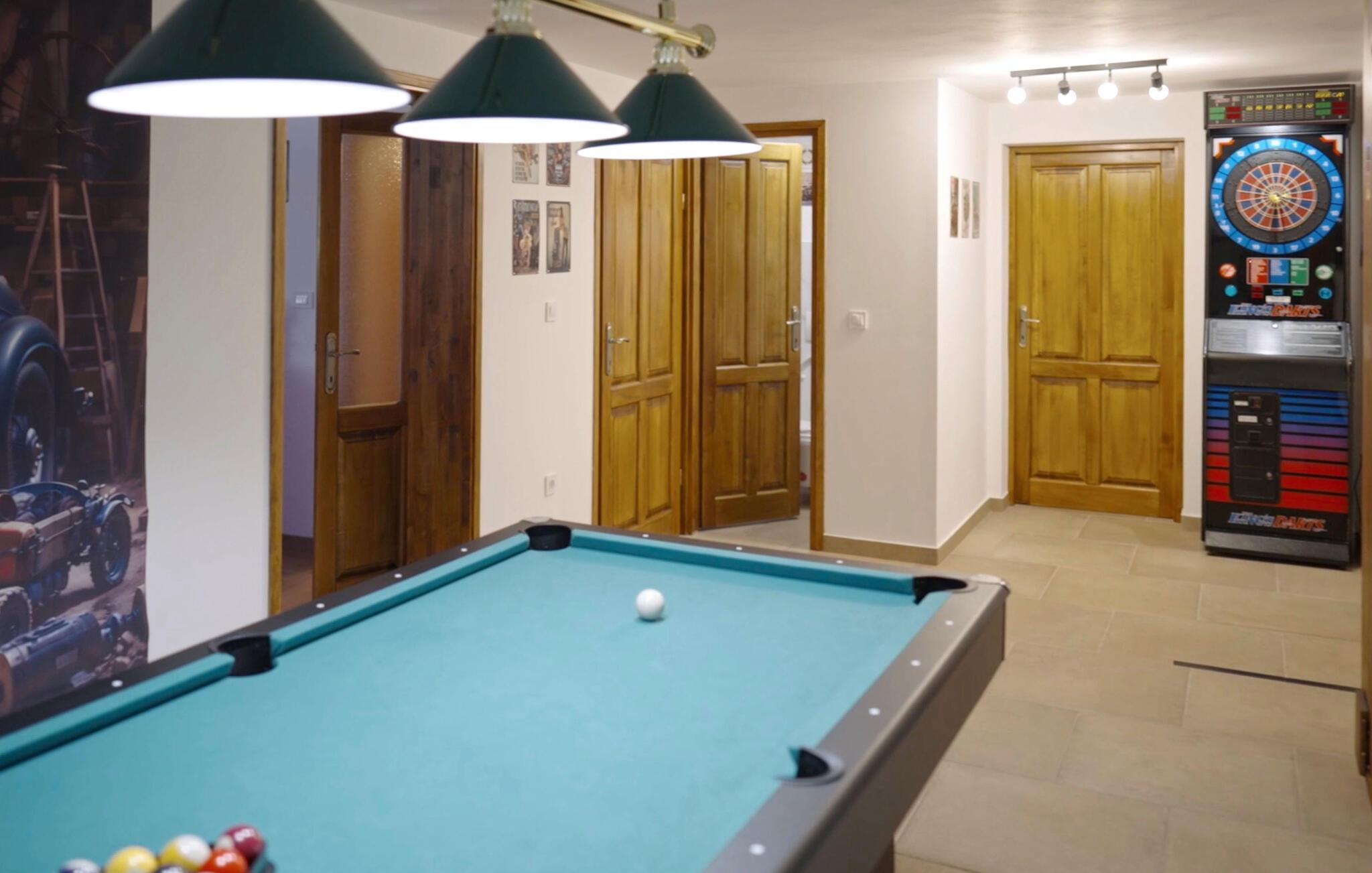 Husets eksteriør er like imponerende som interiøret. Det store svømmebassenget innbyr til forfriskninger og avslapping i det grønne, mens boblebadet sørger for ytterligere avslapning. For de som liker en aktiv ferie, finnes det et spillrom med ulike fasiliteter, blant annet biljard.