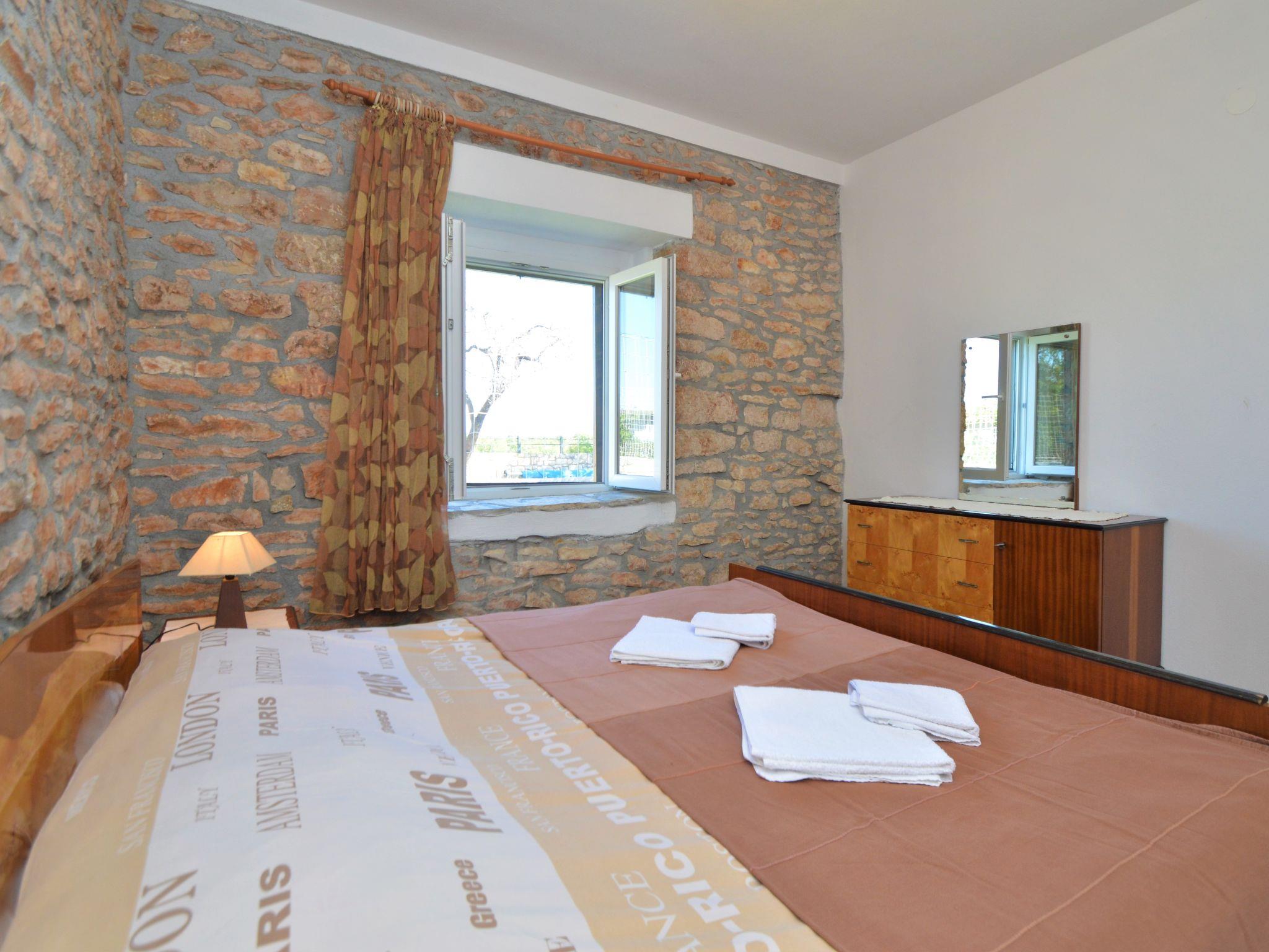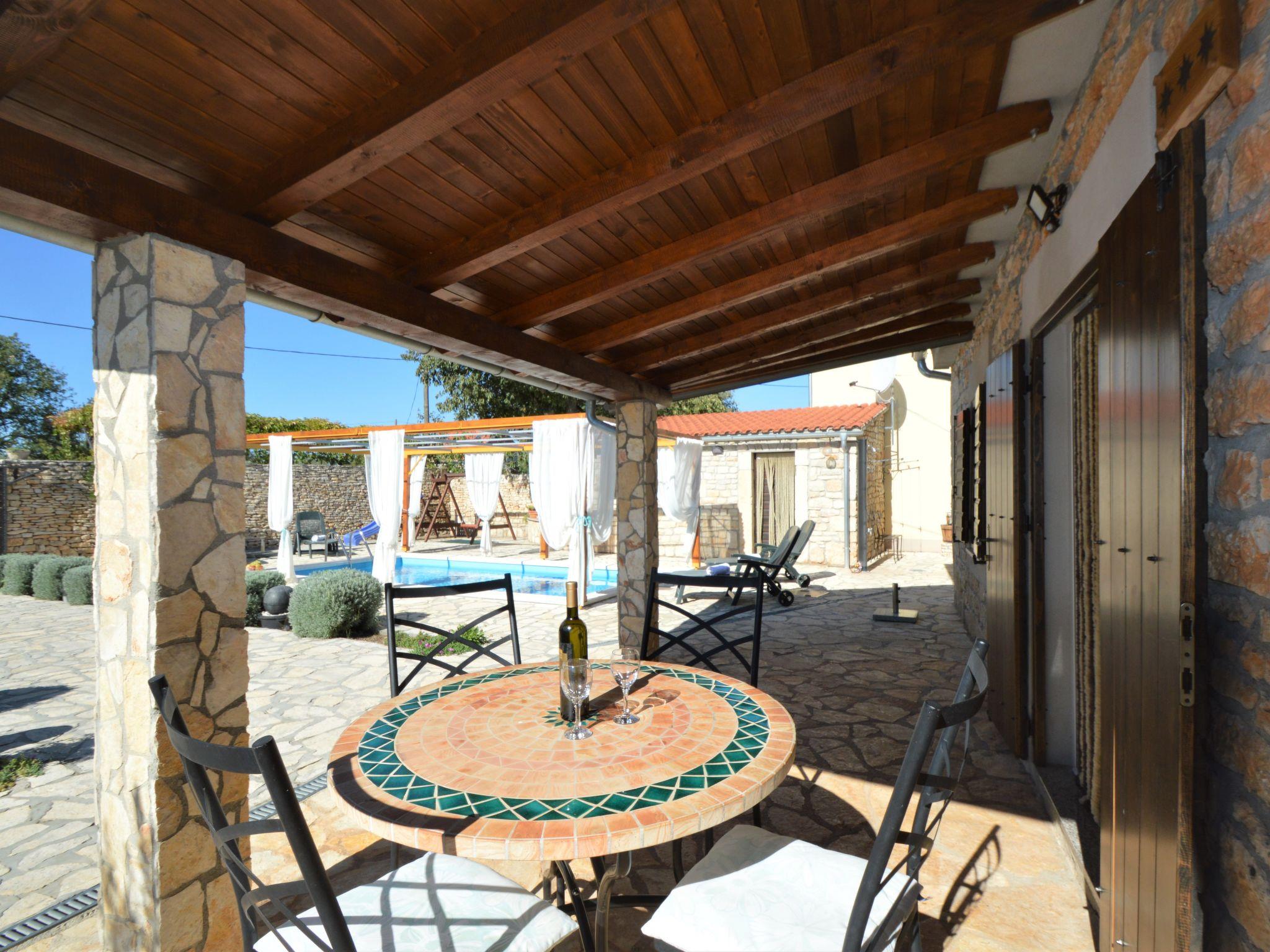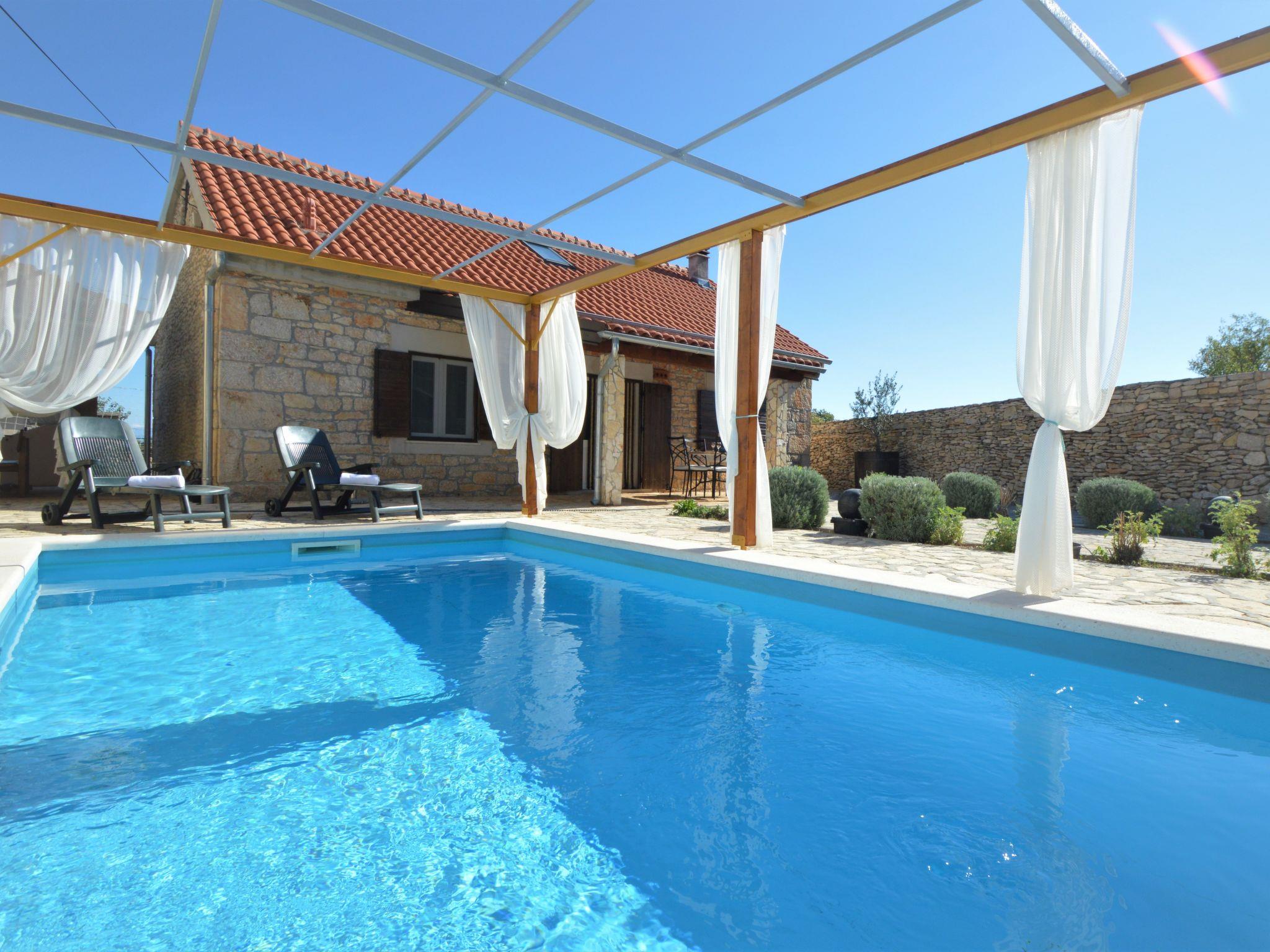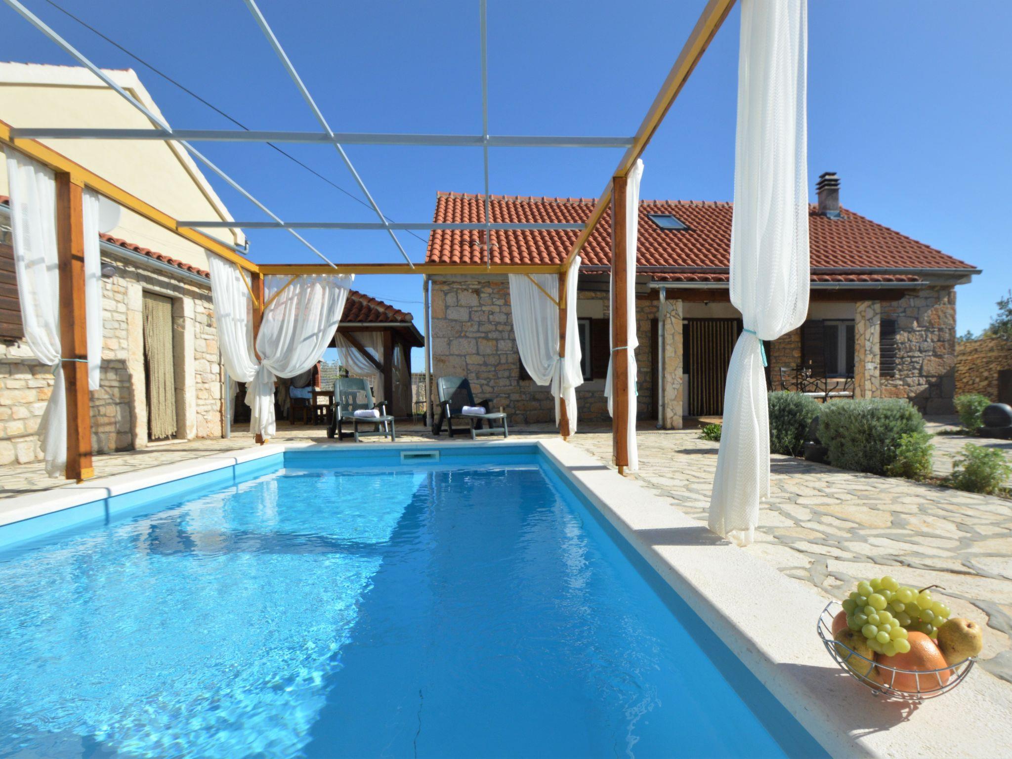 Bogatic 10 km from Oklaj: Child friendly, beautiful single-family house "Marija", 2 storeys. In a quiet, sunny position, 44 km from the sea. Private: property 700 m2 (fenced), swimming pool angular (6 x 3 m, 18 m2, depth 150 cm, seasonal availability: 15.Apr. - 15.Oct.). Outdoor shower, boules, badminton, volleyball court, terrace (6 m2), garden furniture, barbecue, children's playground (slide, swing). In the house: internet access, sauna, billiard table, washing machine. Available: bicycles (2), children's bicycles (1). Motor access to the house (800 m via unmade road). Parking (for 2 cars) at the house on the premises. Shop 10 km, restaurant 6 km, bus stop 22.7 km, pebble beach 44 km. Nearby attractions: NP Krka 6 km. Groups of teenagers on request only. By groups of young people double deposit is requested on arrival. Organizing a party is not allowed. Small house (15 m2) by the pool with sauna and air conditioning.