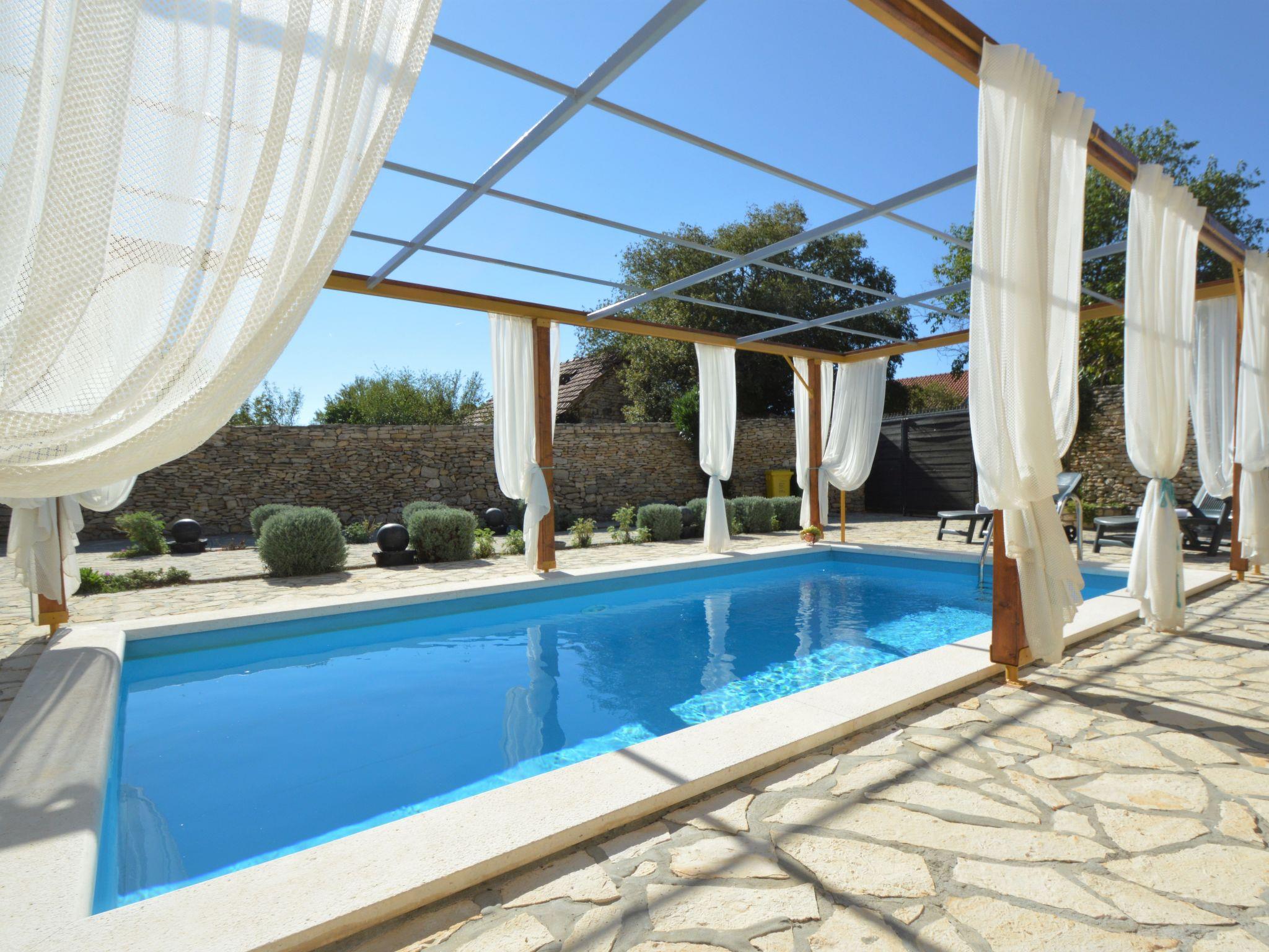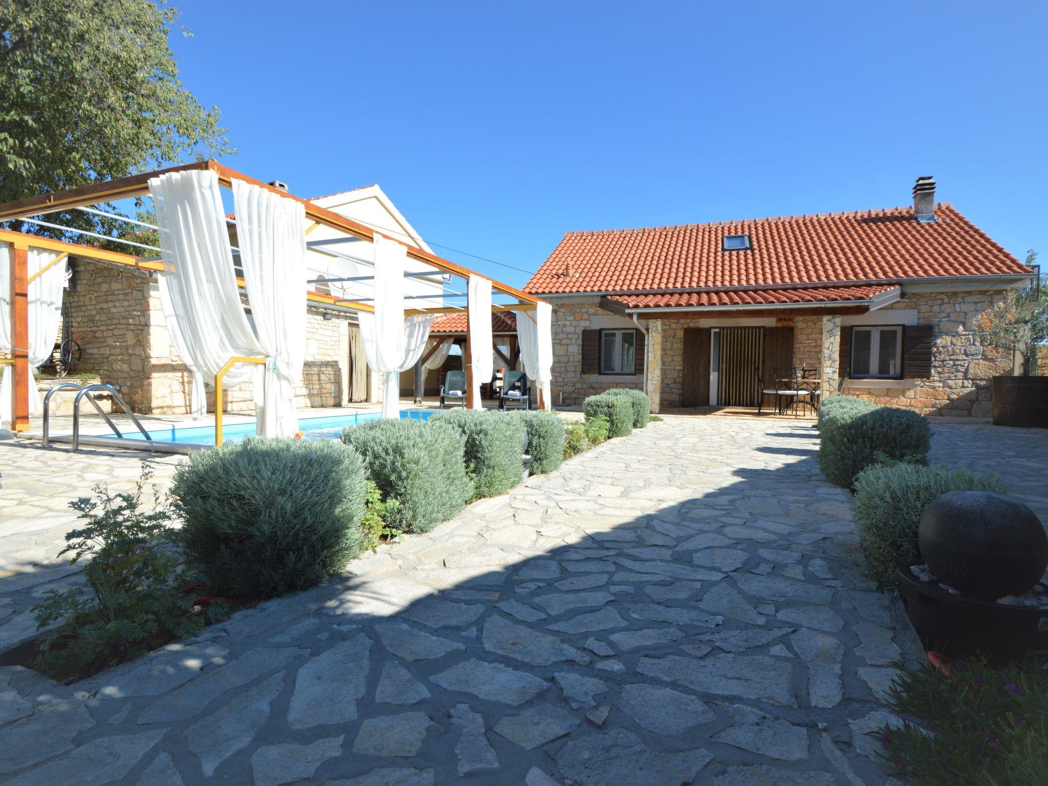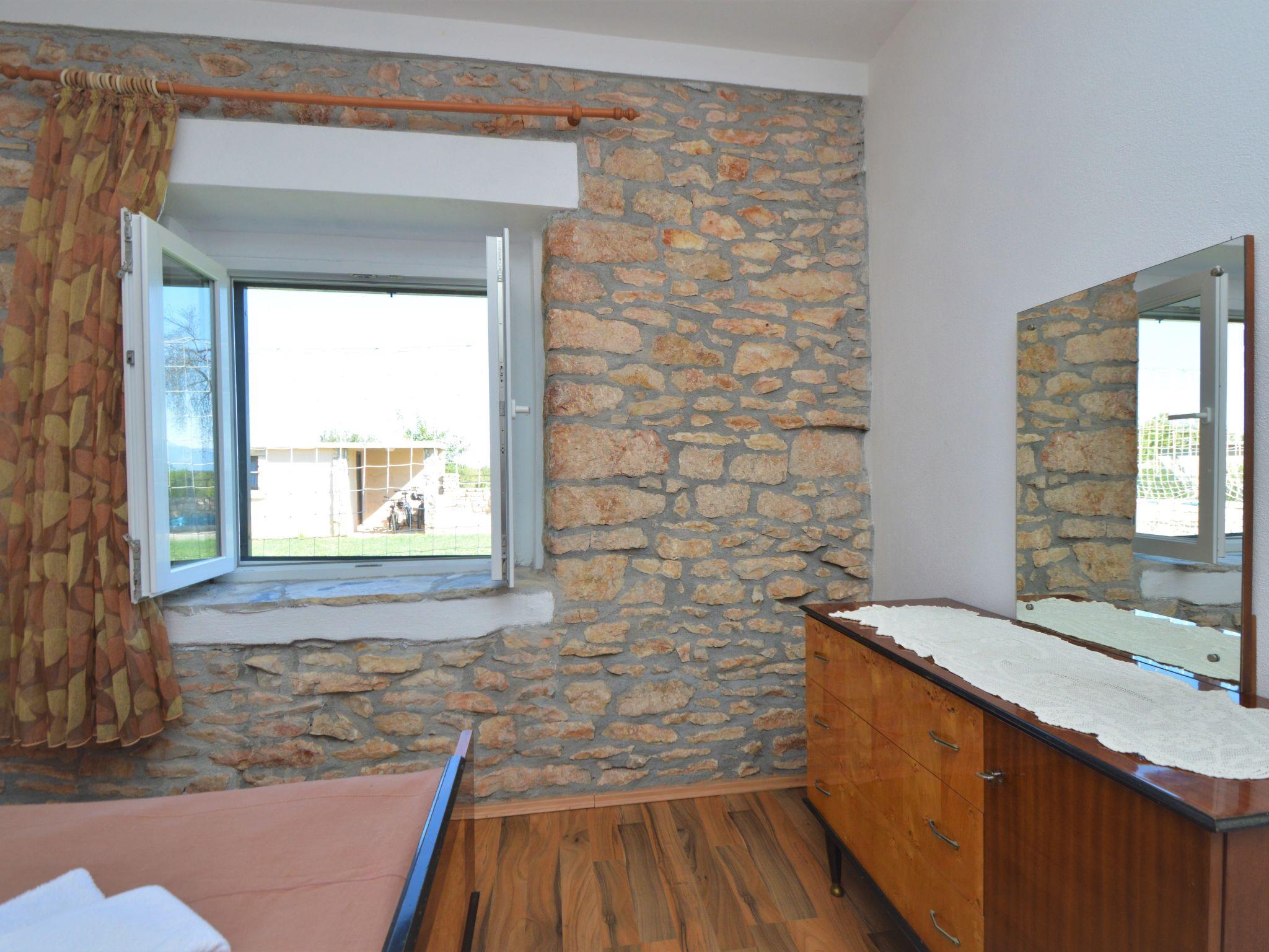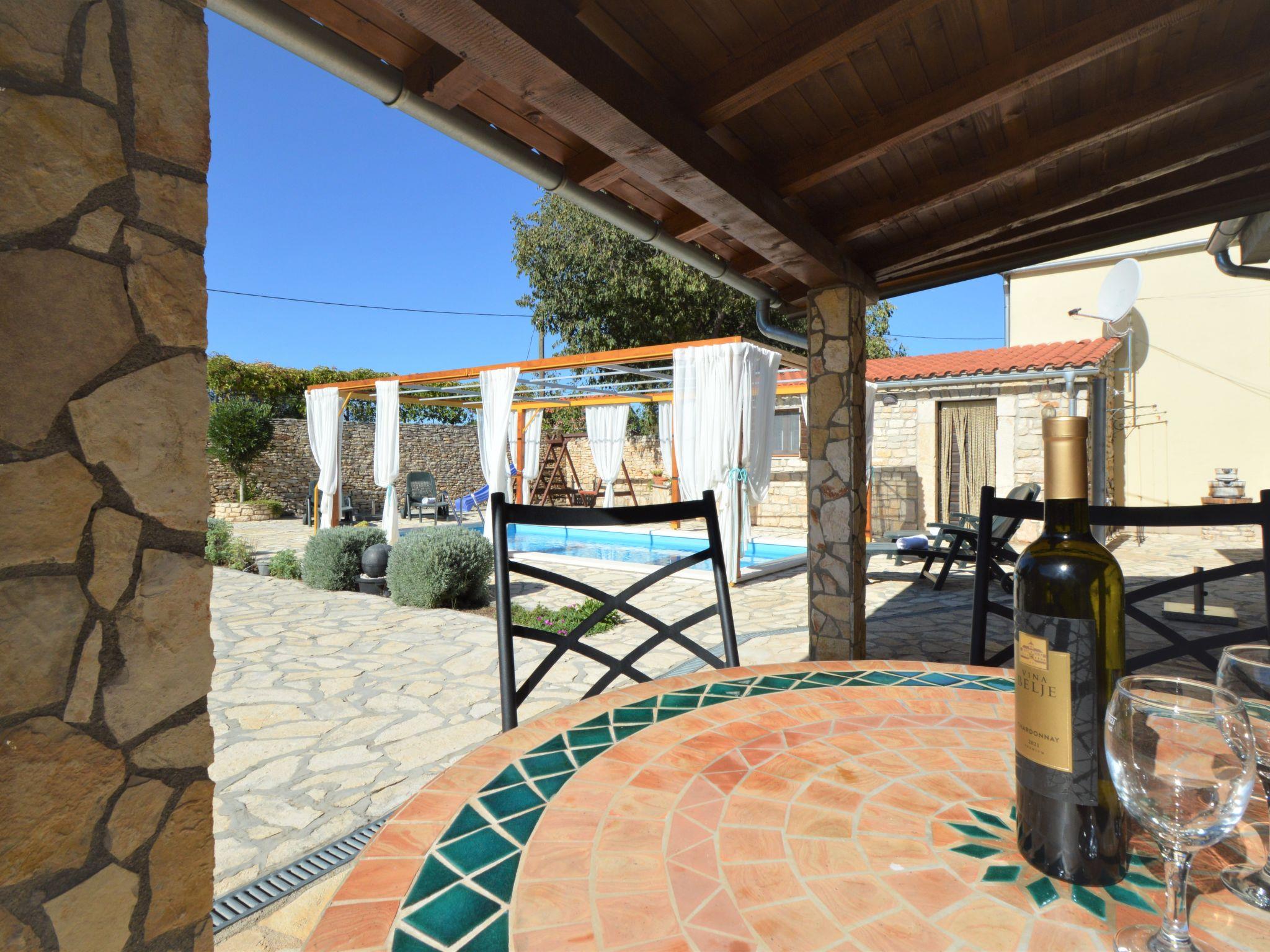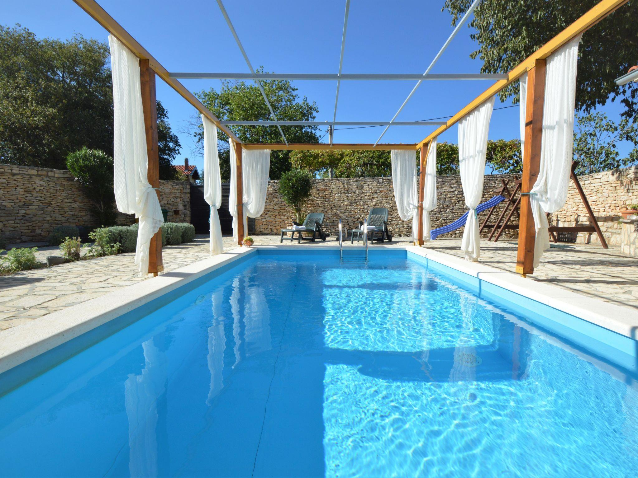 Bogatic 10 km from Oklaj: Child friendly, beautiful single-family house "Marija", 2 storeys. In a quiet, sunny position, 44 km from the sea. Private: property 700 m2 (fenced), swimming pool angular (6 x 3 m, 18 m2, depth 150 cm, seasonal availability: 15.Apr. - 15.Oct.). Outdoor shower, boules, badminton, volleyball court, terrace (6 m2), garden furniture, barbecue, children's playground (slide, swing). In the house: internet access, sauna, billiard table, washing machine. Available: bicycles (2), children's bicycles (1). Motor access to the house (800 m via unmade road). Parking (for 2 cars) at the house on the premises. Shop 10 km, restaurant 6 km, bus stop 22.7 km, pebble beach 44 km. Nearby attractions: NP Krka 6 km. Groups of teenagers on request only. By groups of young people double deposit is requested on arrival. Organizing a party is not allowed. Small house (15 m2) by the pool with sauna and air conditioning.