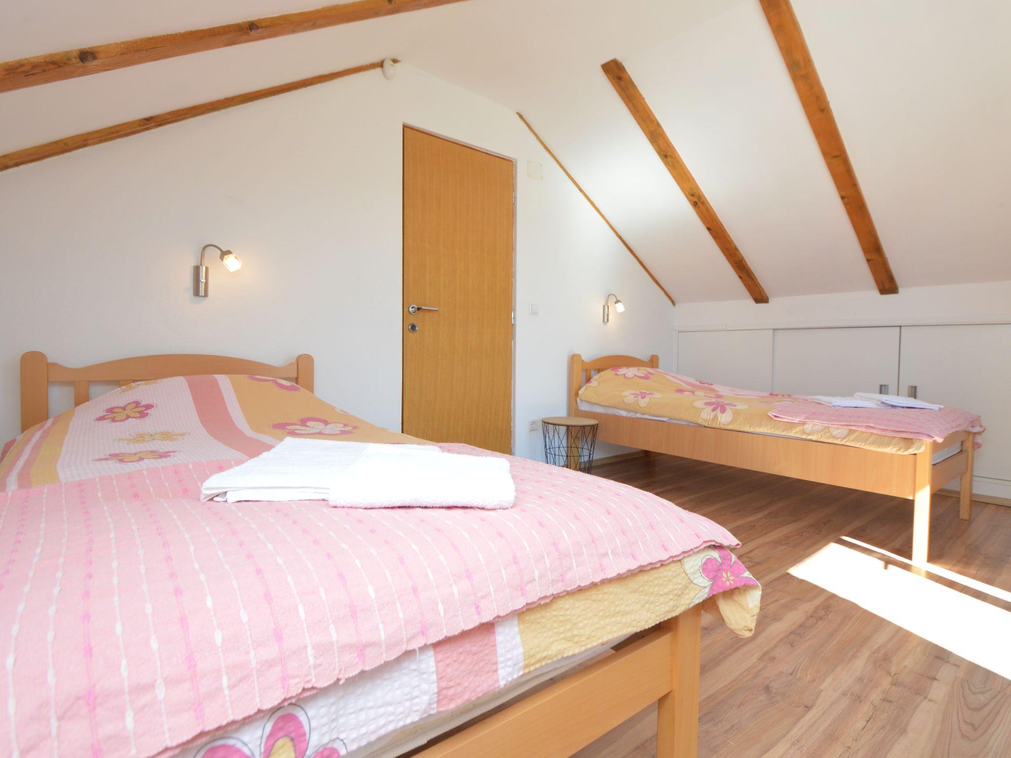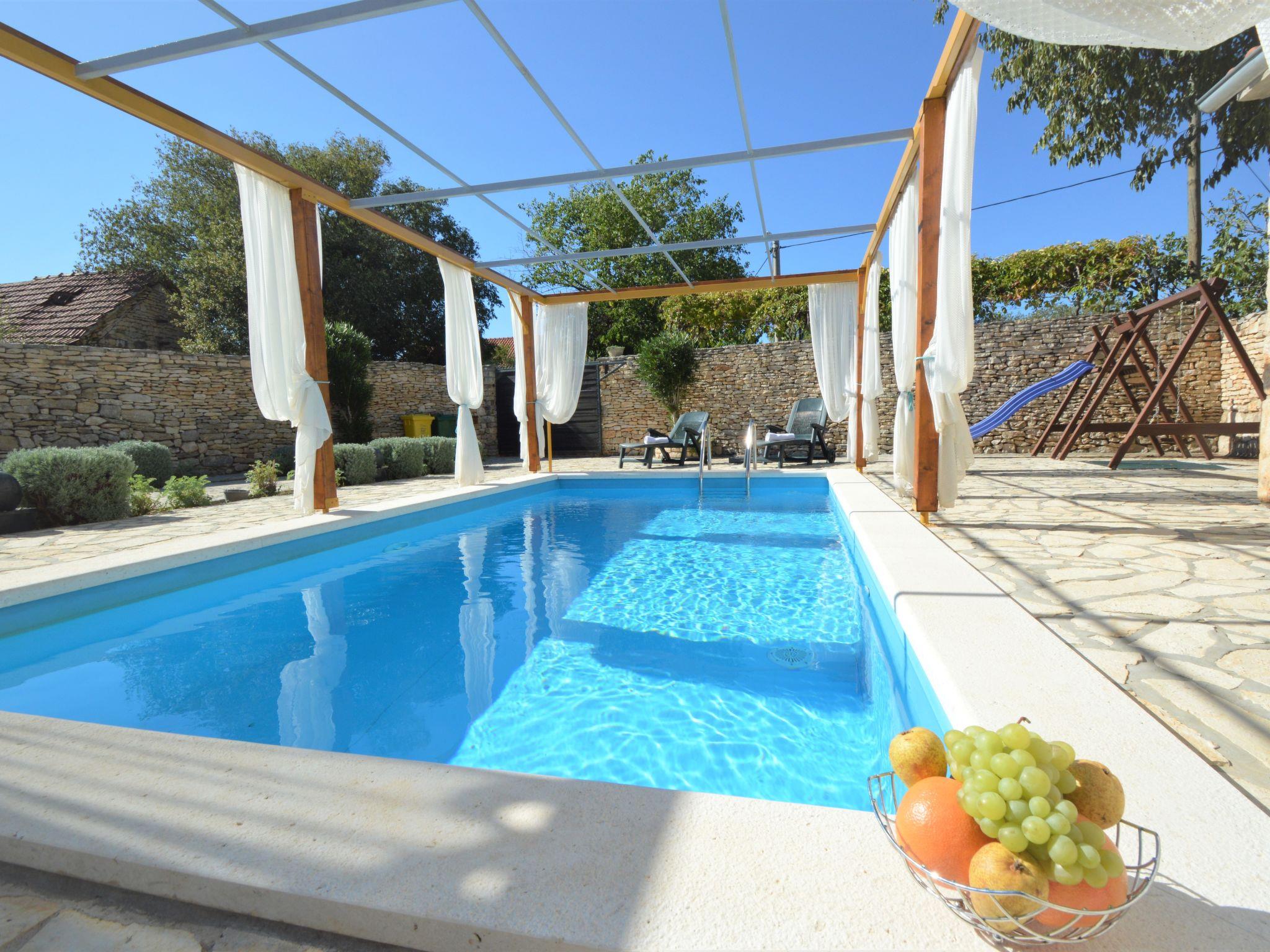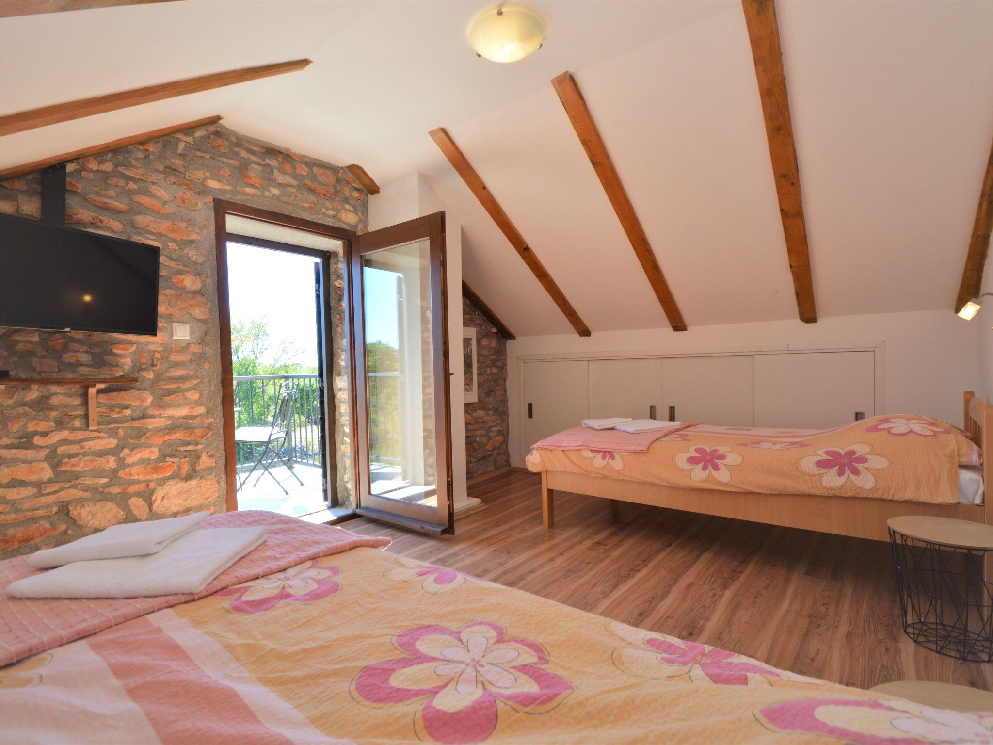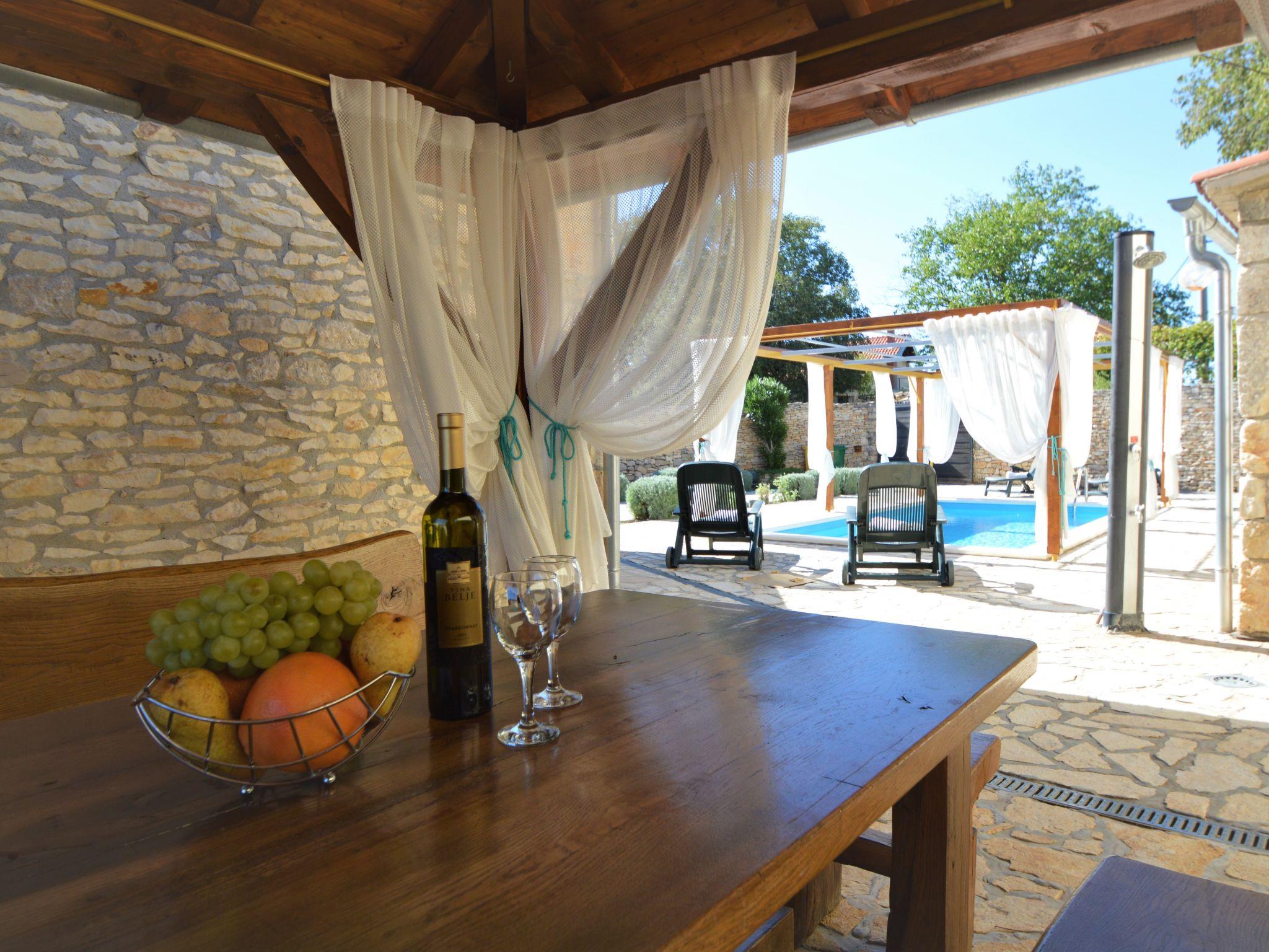 Bogatic 10 km from Oklaj: Child friendly, beautiful single-family house "Marija", 2 storeys. In a quiet, sunny position, 44 km from the sea. Private: property 700 m2 (fenced), swimming pool angular (6 x 3 m, 18 m2, depth 150 cm, seasonal availability: 15.Apr. - 15.Oct.). Outdoor shower, boules, badminton, volleyball court, terrace (6 m2), garden furniture, barbecue, children's playground (slide, swing). In the house: internet access, sauna, billiard table, washing machine. Available: bicycles (2), children's bicycles (1). Motor access to the house (800 m via unmade road). Parking (for 2 cars) at the house on the premises. Shop 10 km, restaurant 6 km, bus stop 22.7 km, pebble beach 44 km. Nearby attractions: NP Krka 6 km. Groups of teenagers on request only. By groups of young people double deposit is requested on arrival. Organizing a party is not allowed. Small house (15 m2) by the pool with sauna and air conditioning.