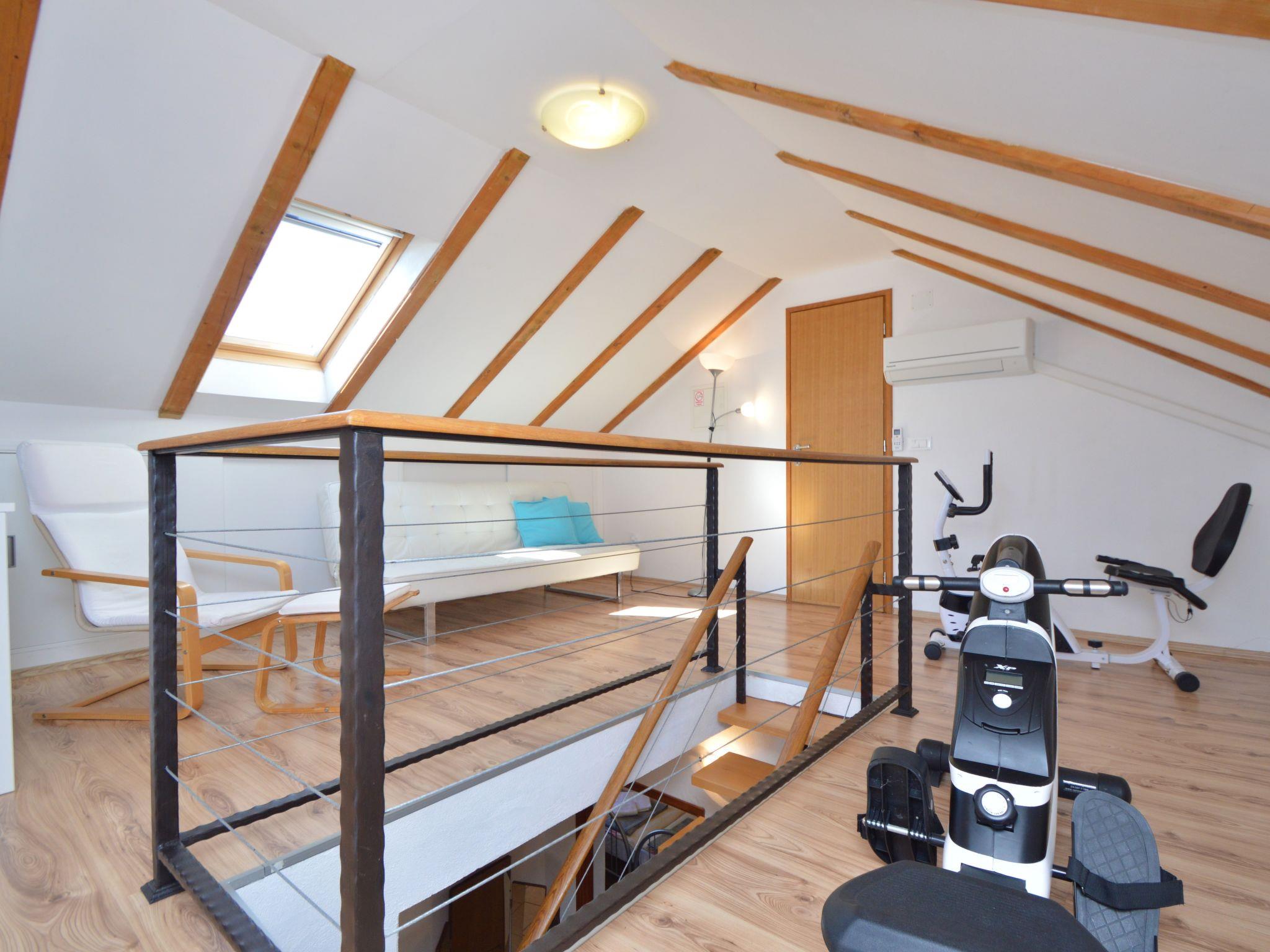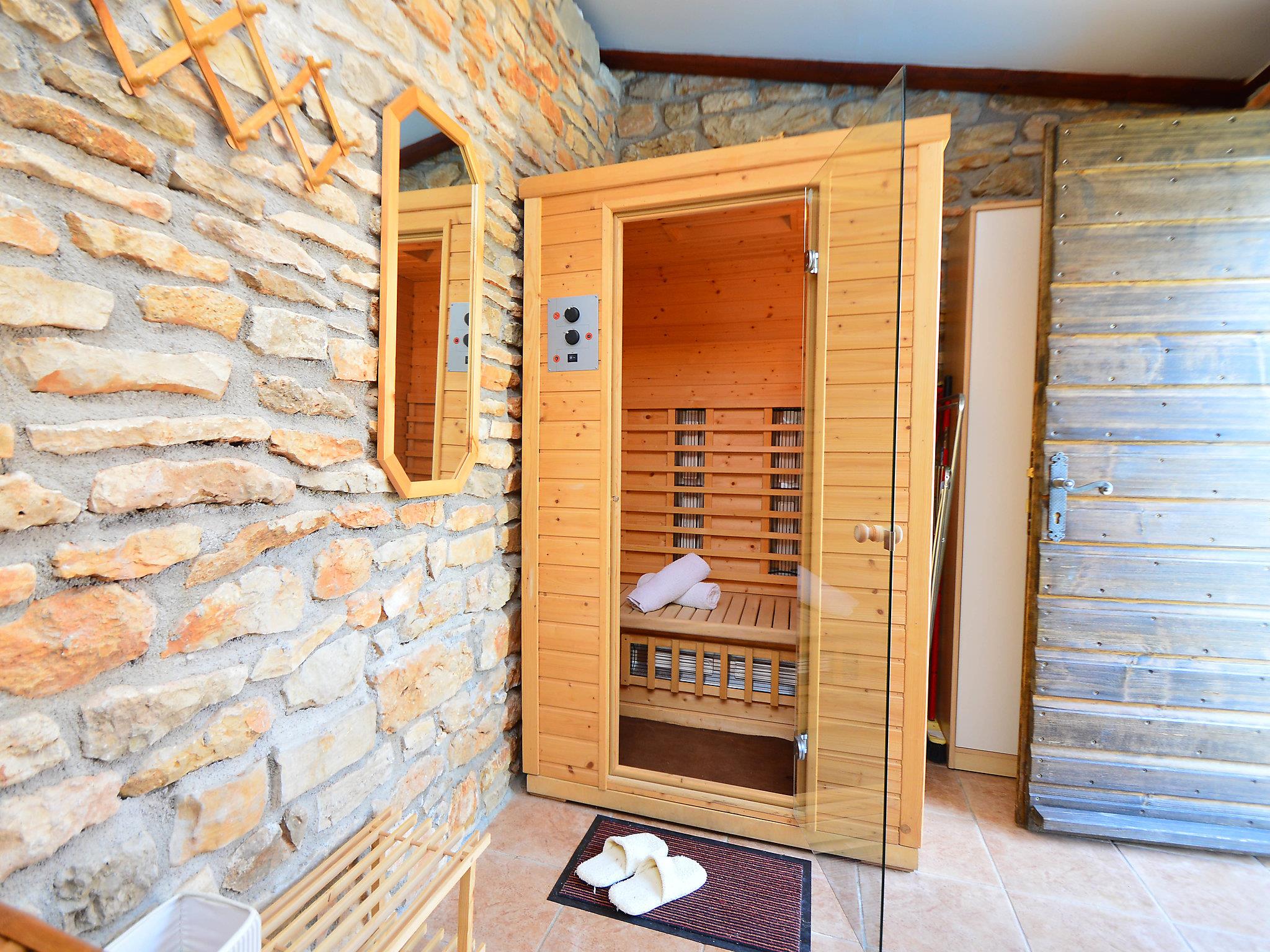 4-room house 110 m2 on 2 levels, south facing position. Living/dining room with 1 sofabed (90 cm, length 220 cm), open-hearth fireplace and satellite TV (flat screen), air conditioning. 1 room with 1 french bed (180 cm, length 190 cm). 1 room with 2 beds (90 cm, length 180 cm). Open kitchen (oven, dishwasher, 4 ceramic glass hob hotplates, microwave, electric coffee machine). Shower/WC. Upper floor: open gallery, with sloping ceilings, ceiling height 110 - 230 cm with 1 sofabed (110 cm, length 190 cm), satellite TV (flat screen), air conditioning. 1 room with sloping ceilings, ceiling height 110 - 230 cm with 2 beds (90 cm, length 190 cm). Exit to the balcony. Bath/WC. Wood heating. Balcony 3 m2, terrace 15 m2, roofed. Balcony furniture, deck chairs. View of the swimming pool and the countryside. Facilities: sauna, safe, baby cot, logs (free). Internet (WiFi, free).