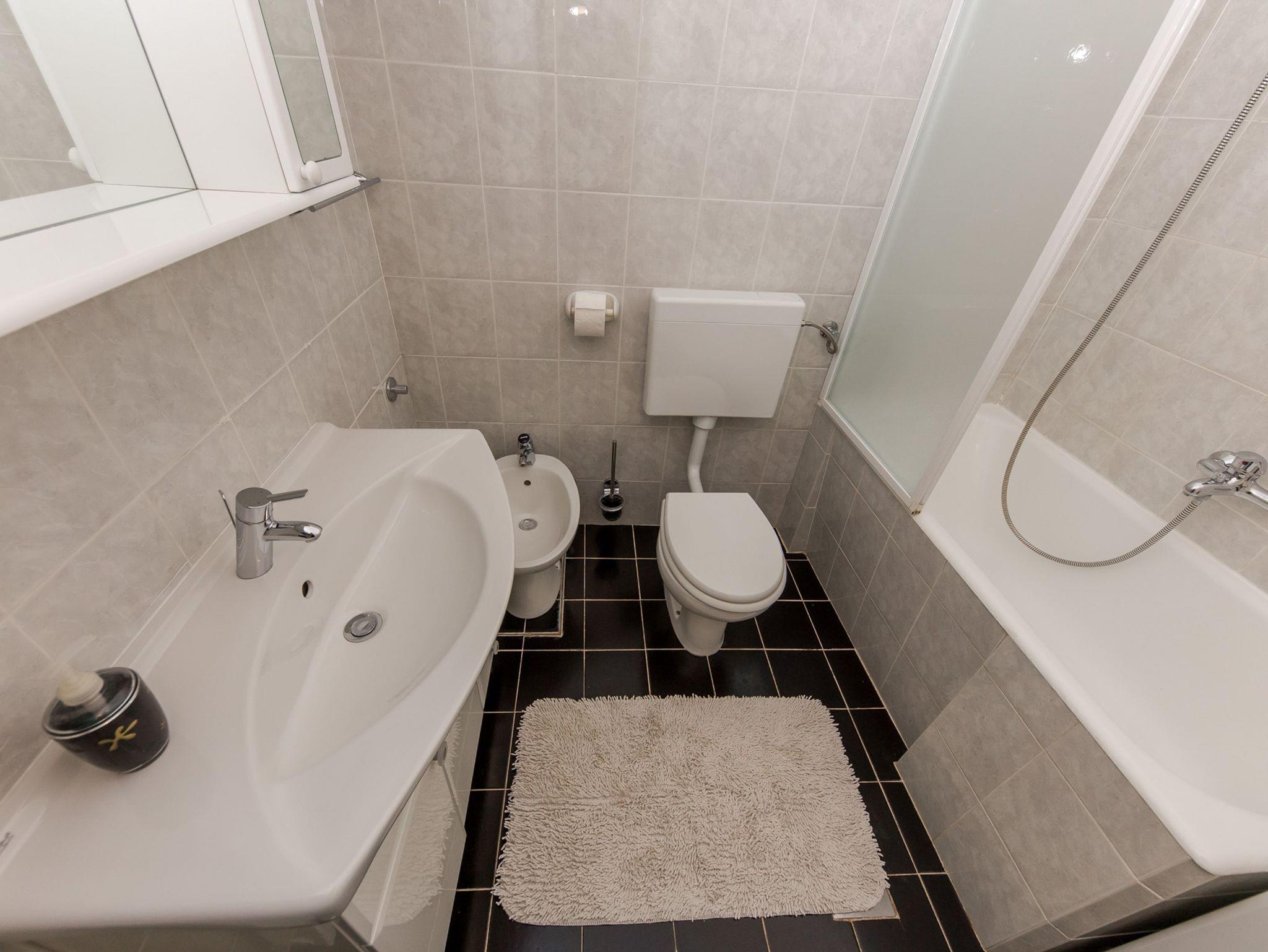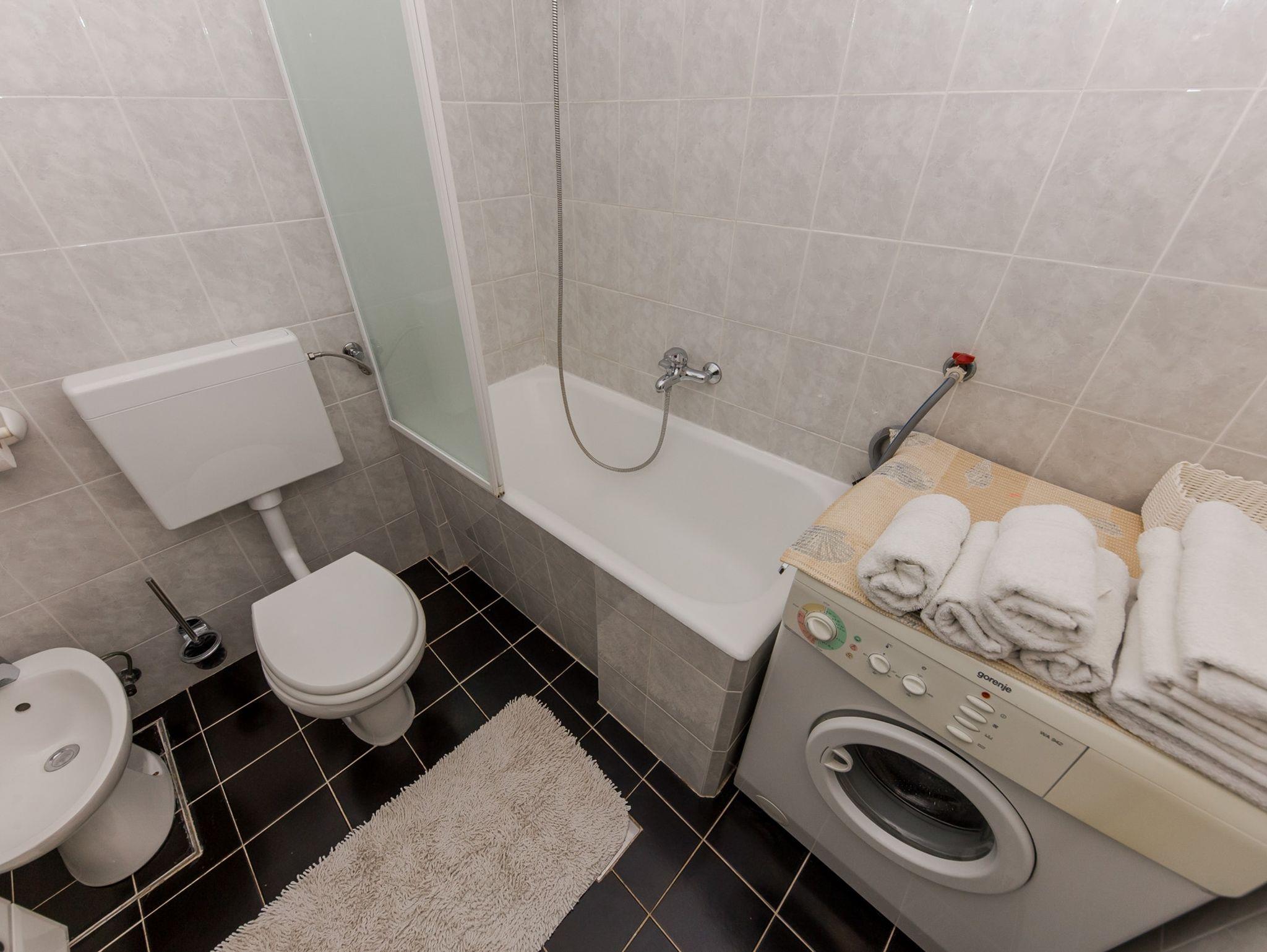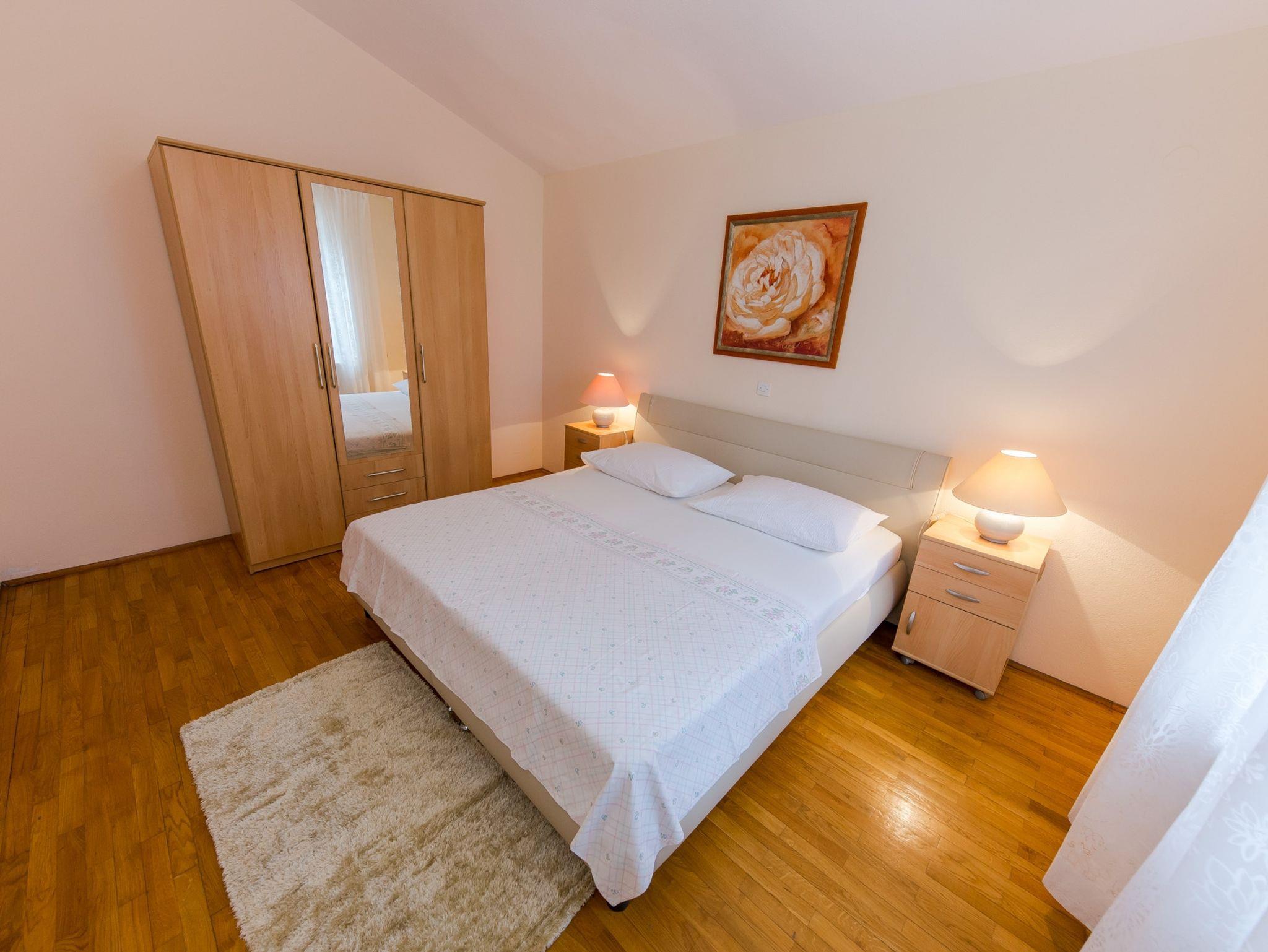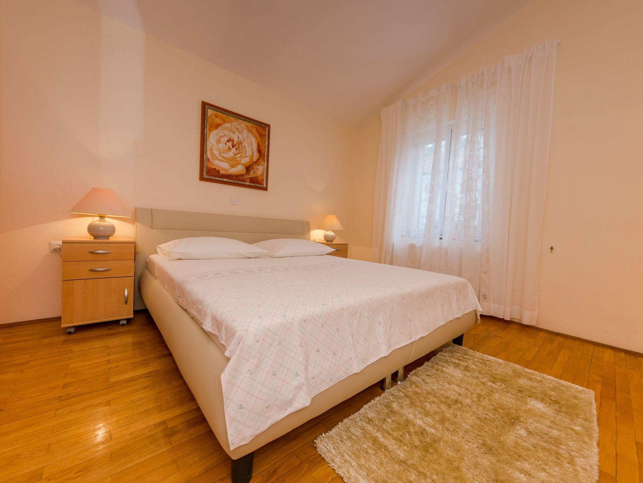 Ferienwohnung bietet Platz für 4 Gäste. Die Betten sind in Schlafzimmern, die es 1 gibt, und in Wohnzimmer, innerhalb einer Gesamtfläche von 42m2, angeordnet. Die Gäste haben eine eigene Terrasse zur Verfügung, auf der sie in warmen Sommernächten genießen können. Das Apartment bietet Meerblick. Es ist erlaubt, Speisen auf dem Gemeinschafts-Grill vorzubereiten. IM PREIS INBEGRIFFEN: Kurtaxe, Endreinigung, Klimatisierung, Parkplatz, Internet, Bügeleisen, Bügelbrett, Föhn, Liegestühle. VERBINDLICHE ZUSÄTZLICHE KOSTEN: Aufzahlung für Kurzaufenthalte (prozentualer Zuschlag pro Nächtigungsanzahl: 30% - 1, 20% - 2, 10% - 3). Die Verfügbarkeit zusätzlicher Dienstleistungen in Ihrem reservierten Termin und die Preise derselben (falls nicht aufgeführt) müssen im Voraus überprüft werden. Zusätzliche Dienstleistungen die in der Zahlungsaufforderung nicht aufgeführt sind werden direkt beim Vermieter bezahlt, angenommen der Gast nutzt auch diese.