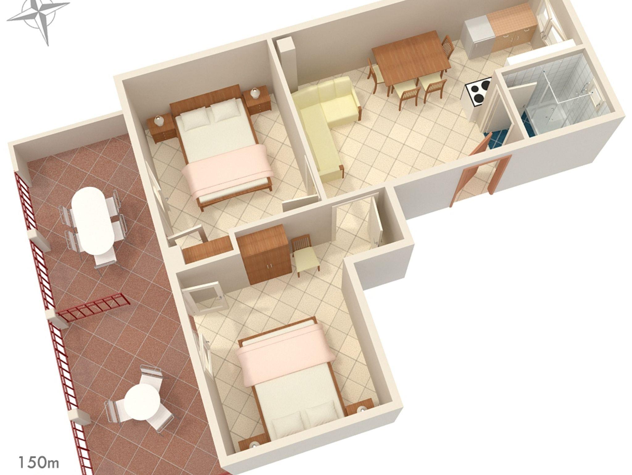 Ferienwohnung bietet Platz für 4 Gäste. Die Betten sind in Schlafzimmern, die es 2 gibt, innerhalb einer Gesamtfläche von 39m2, angeordnet. Die Gäste haben eine eigene Terrasse zur Verfügung, auf der sie in warmen Sommernächten genießen können. Das Apartment bietet Meerblick. Es ist erlaubt, Speisen auf dem Gemeinschafts-Grill vorzubereiten. IM PREIS INBEGRIFFEN: Kurtaxe, Endreinigung, Klimatisierung, Parkplatz, Internet. VERBINDLICHE ZUSÄTZLICHE KOSTEN: Aufzahlung für Kurzaufenthalte (prozentualer Zuschlag pro Nächtigungsanzahl: 30% - 1, 20% - 2, 10% - 3). Die Verfügbarkeit zusätzlicher Dienstleistungen in Ihrem reservierten Termin und die Preise derselben (falls nicht aufgeführt) müssen im Voraus überprüft werden. Zusätzliche Dienstleistungen die in der Zahlungsaufforderung nicht aufgeführt sind werden direkt beim Vermieter bezahlt, angenommen der Gast nutzt auch diese. Ermäßigung auf den Grundpreis: Gratistag 14=13 (bei einem Aufenthalt von 14 Tagen oder mehr erhalten Sie einen Gratistag für den Aufenthalt bis 31.12.26).