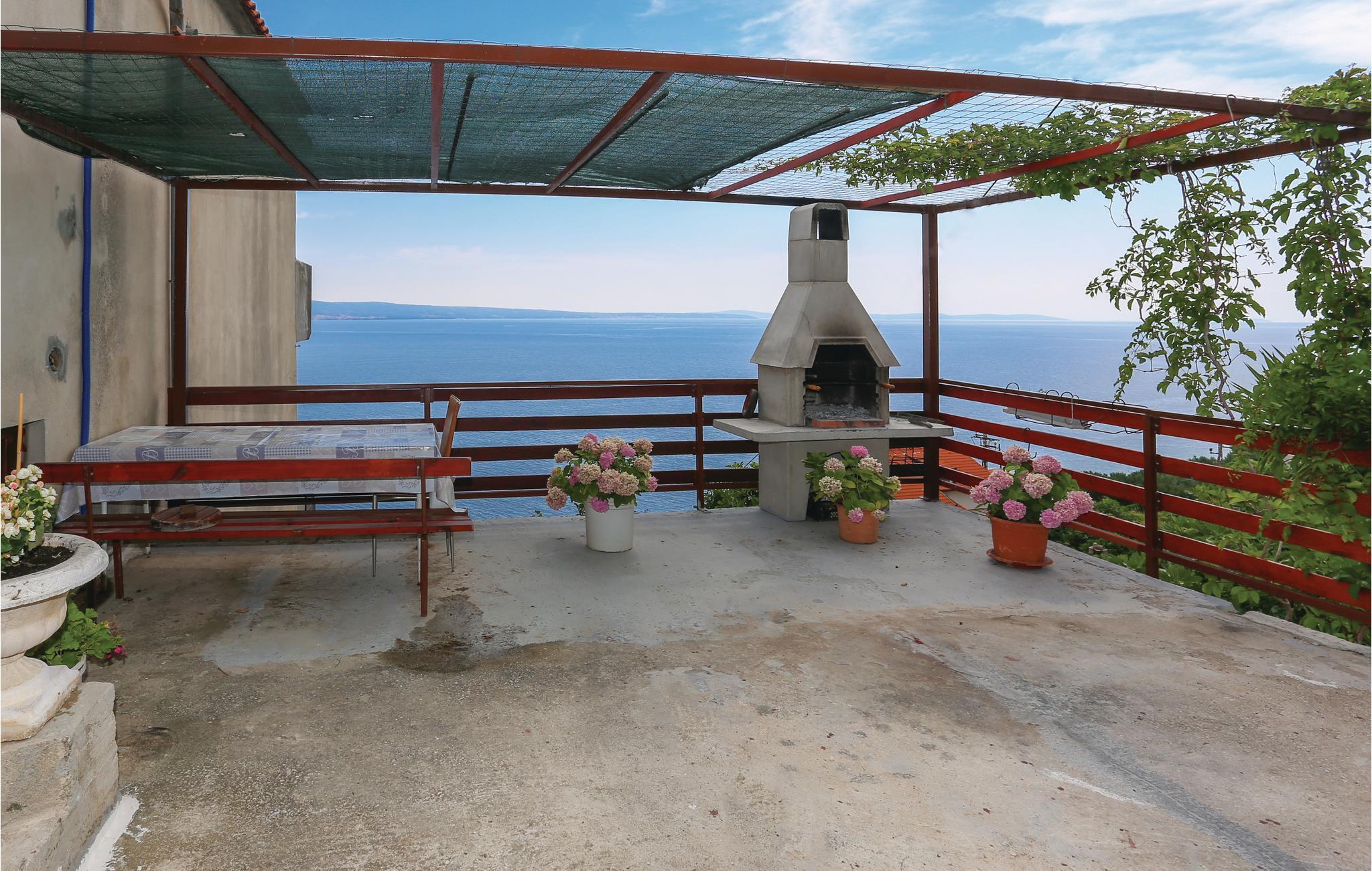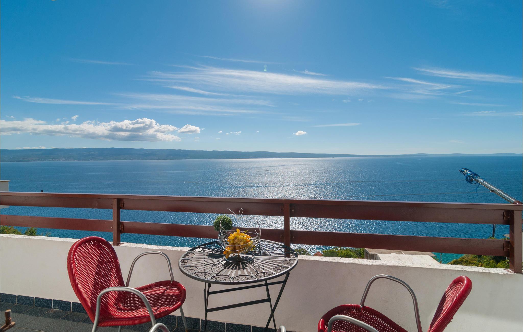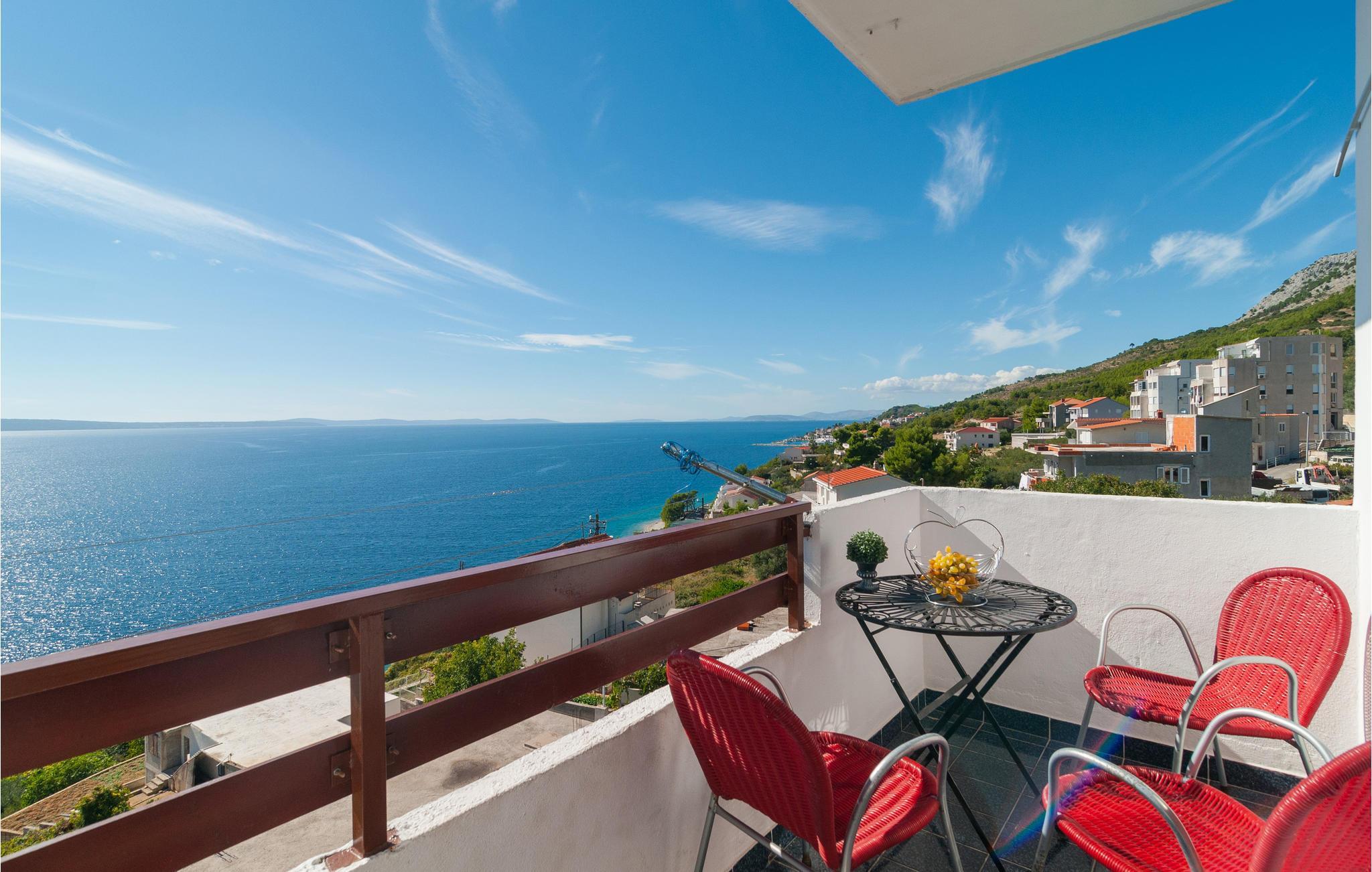 Denne romslige ferieleiligheten ligger i et rolig område på en høyde med panoramautsikt. Den er enkelt og komfortabelt innredet for din ferie. Leiligheten ligger i øverste etasje og har egen inngang. En gangsti og trapper fører deg til de vakre små rullesteinstrendene. Fotgjengertunnelen fører deg under kystveien som skiller landsbyen fra stranden. Du finner mange fritidsaktiviteter i byene Dugi Rat og Omis, bare noen få kilometer unna. På den velkjente Omis-rivieraen er det vakre strender som inviterer deg til å slappe av og nyte en aktiv ferie med mange vannsportaktiviteter.