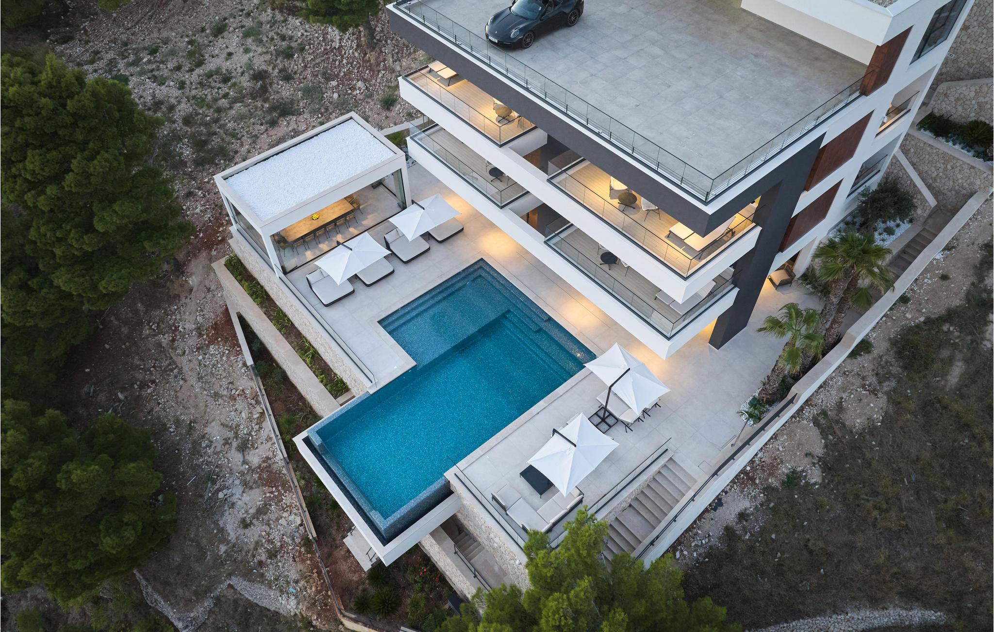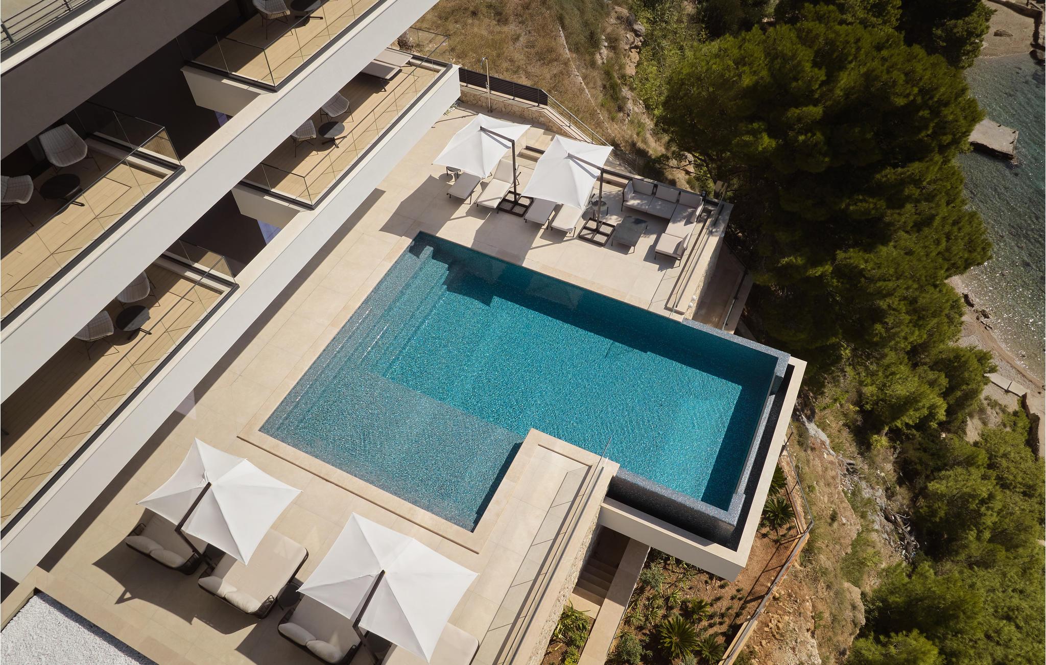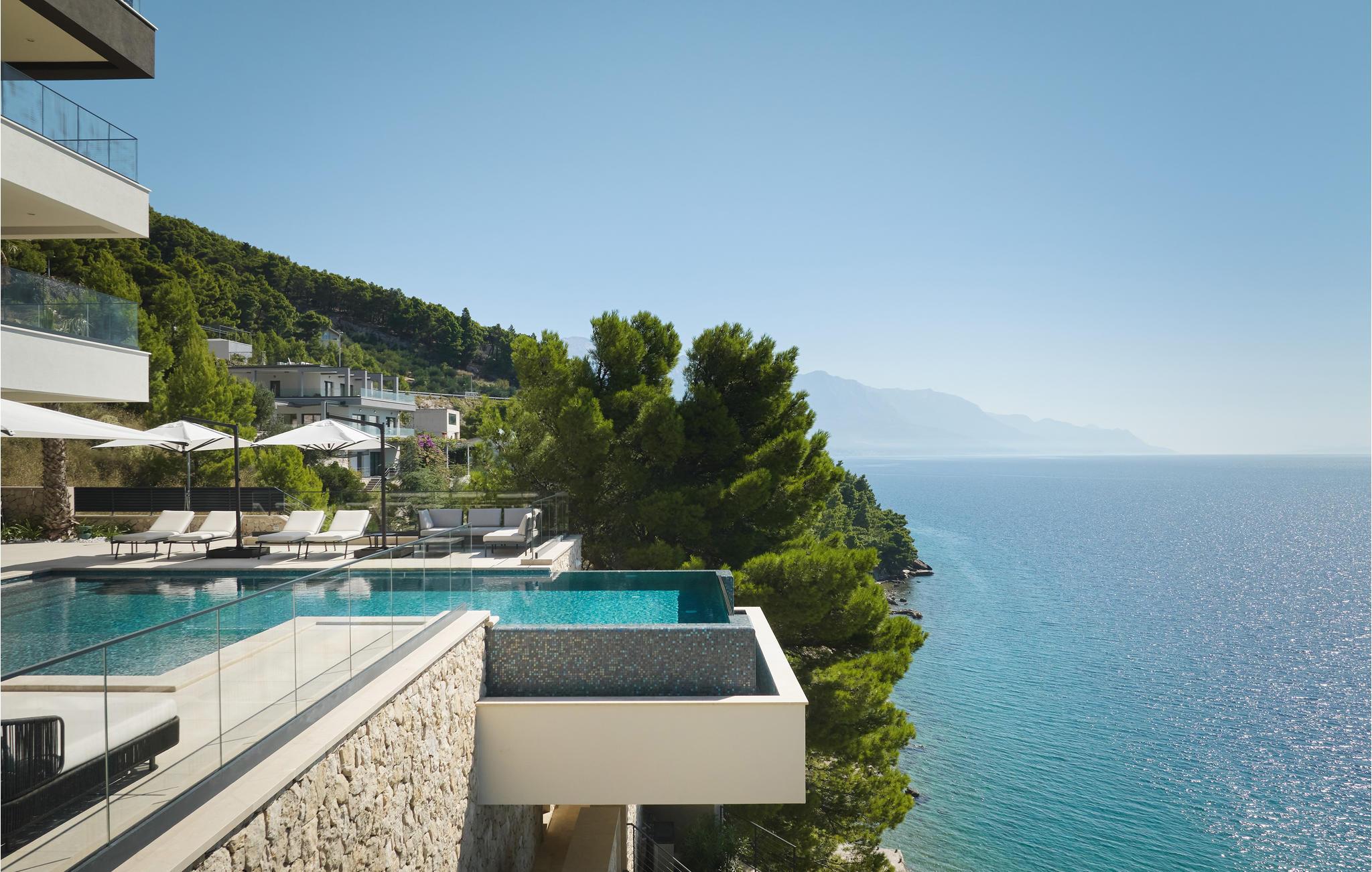 På den romslige terrassen kan du nyte en fantastisk panoramautsikt over havet og de omkringliggende åsene. Evighetsbassenget ser ut til å gli sømløst over i det dypblå havet, som om himmel og vann smelter sammen. Slapp av på de stilige solsengene under parasollene, eller avrund dagen med en kjølig drink i salongen.