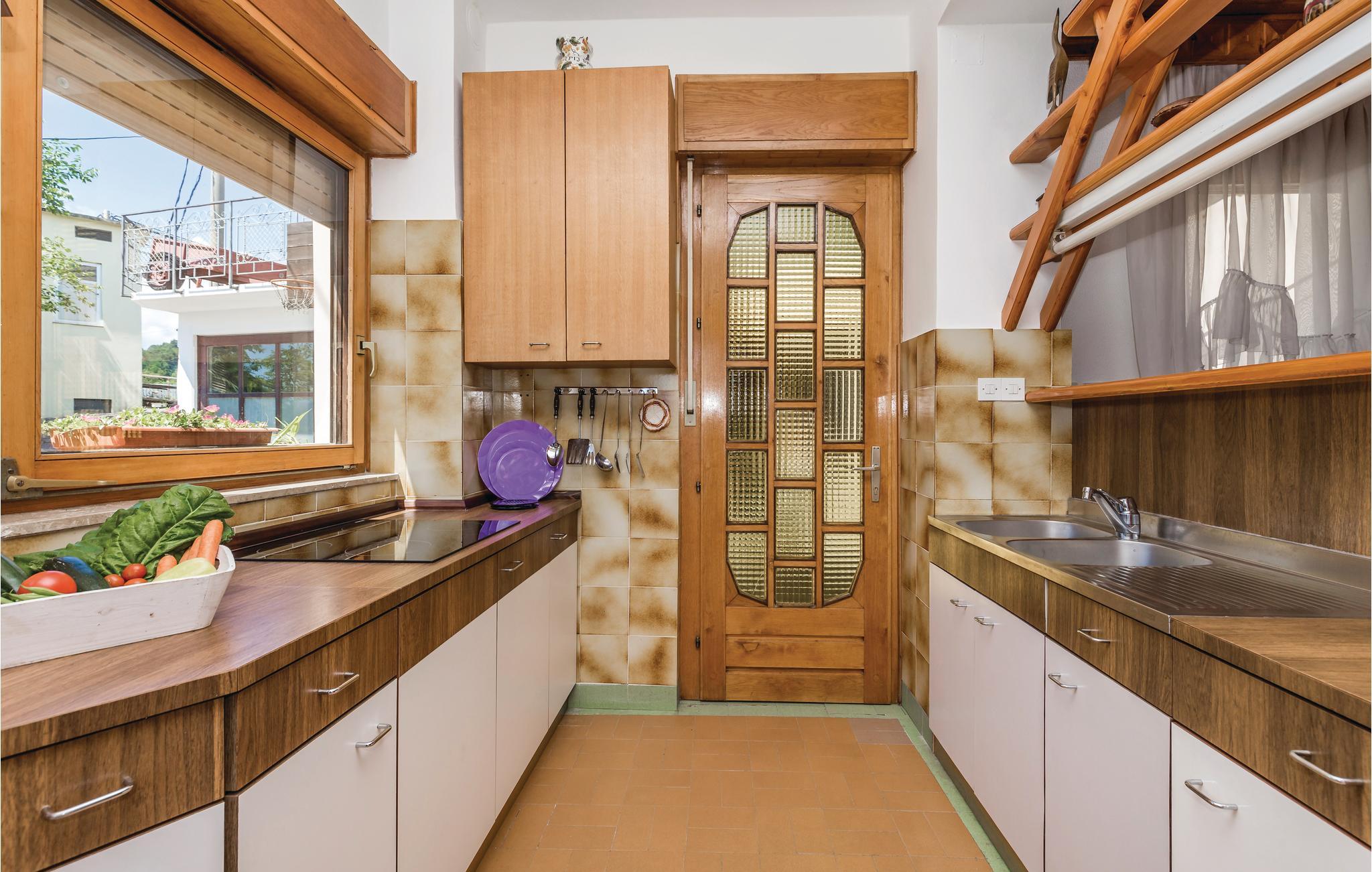 Denne ferieleiligheten ligger i første etasje, og du vil bli ønsket velkommen inn i leiligheten med møbler dominert av tre, en praktisk rominndeling og lyse vegger. Tretakene skaper en tradisjonell, rustikk atmosfære. Huset ligger i et grønt boligområde med villaer og to restauranter i umiddelbar nærhet. Mot vest går landsbyen Bregi over i et skoglandskap, mens den sørlige delen av dette vidstrakte naturområdet er okkupert av Uka naturpark. Bregi ligger bak Opatija, og er adskilt fra byen av et grønt belte og veien E751 (200 meter i luftlinje fra huset). Her kan du nyte en beliggenhet langt unna urbane fasiliteter og trafikkstøy, og du kan tilbringe en fredelig og avslappende ferie her. Du har til og med to nydelige terrasser til disposisjon: en foran leiligheten med skyggefull beliggenhet og den andre på baksiden, som er en felles terrasse med grill. Hvis du ønsker en avveksling fra livet på landet, finner du det i Opatija, hvor det er mange restauranter og kafeer.