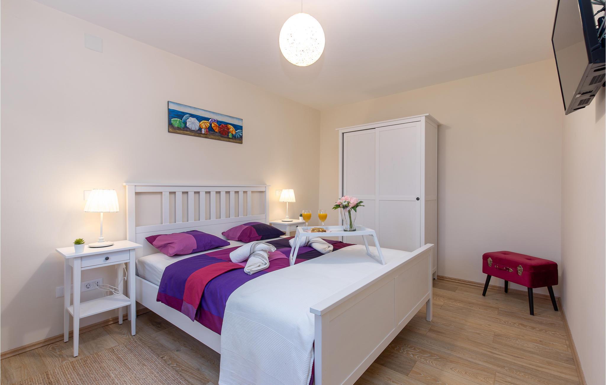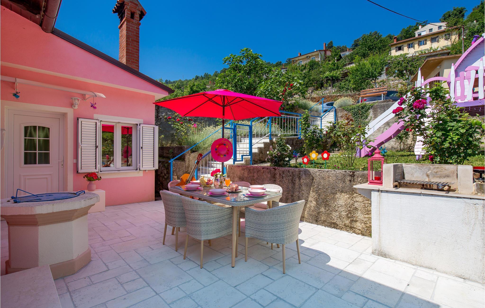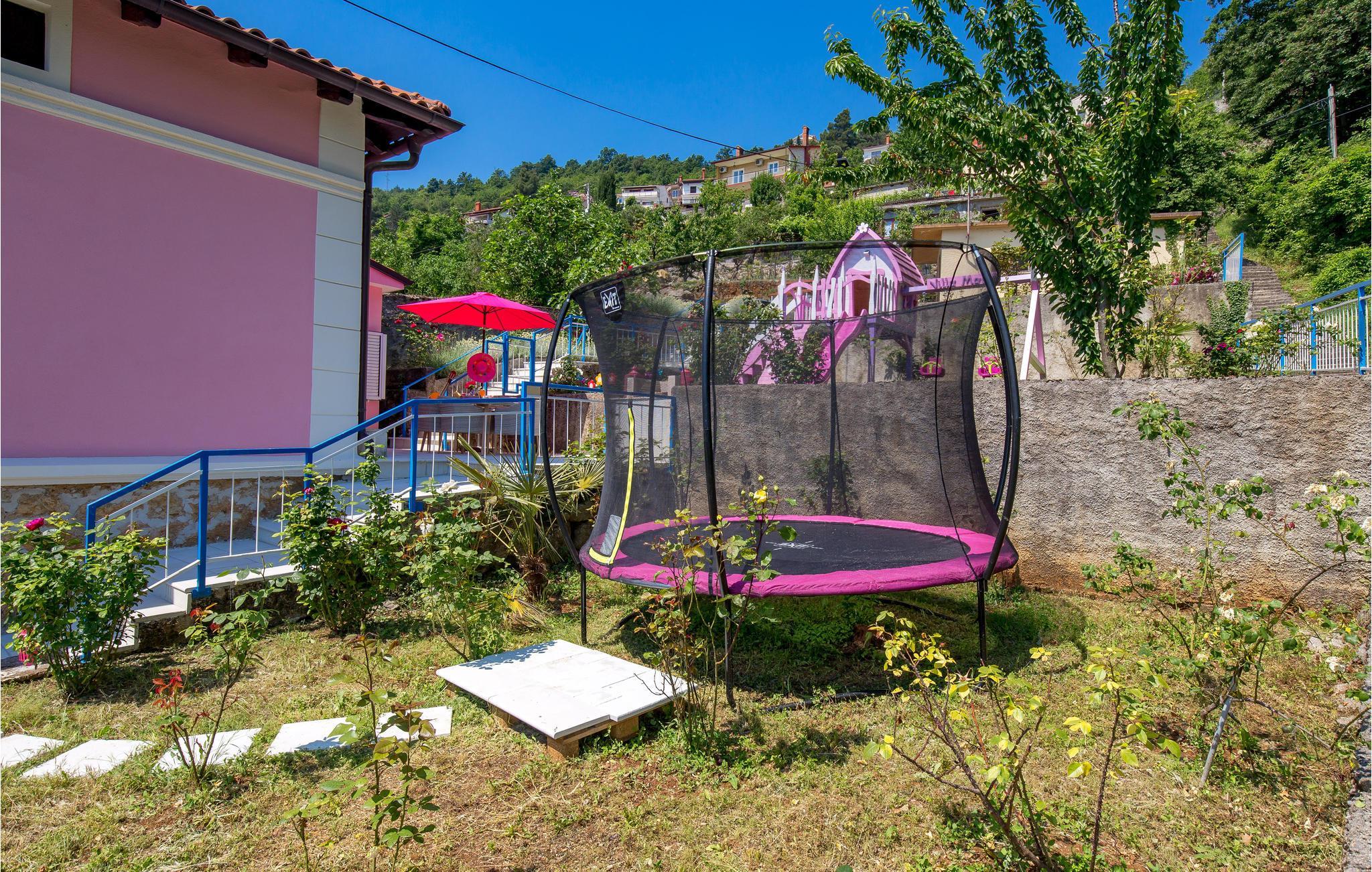 Tilbring en uforglemmelig ferie i dette renoverte feriehuset med basseng, i den sjarmerende kystbyen Lovran på Opatija Riviera. Det ligger på en stor tomt over Lovran, så du har et vakkert havpanorama fra øverste etasje. Huset består av to etasjer, som er forbundet med en utvendig trapp. I hver etasje er det en fullt utstyrt leilighet, og derfor er dette hjemmet ideelt for to familier som ønsker å reise sammen og samtidig opprettholde sitt privatliv. Hagen har to romslige terrasser, en grill og et utendørsbasseng med solterrasse og dusj. I første etasje er det et aktivitetsrom med biljard, bordfotball og dart. Selvfølgelig er det også tenkt på leker for de yngste gjestene. En basketballkurv og et bueskytingssett er også tilgjengelig. Interiøret er innredet med stor omhu og møblert med moderne og praktiske møbler. Langs eiendommen fører en gangsti direkte til sentrum av Lovran og lar deg gå til sjøen og stranden.