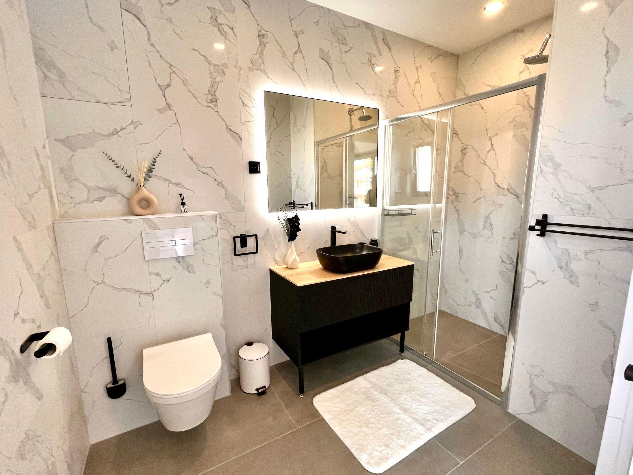 Inside, the apartment boasts three beautifully appointed bedrooms, each complemented by its own bathroom, ensuring privacy and ease for all guests. The inclusion of air conditioning throughout the apartment guarantees your comfort regardless of the season. Entertainment is readily available thanks to the smart TV, and practical amenities like a washing machine, clothes dryer, espresso coffee pot, dishwasher, and electric kettle add a touch of home. The underfloor heating system throughout ensures a cozy environment, perfect for those cooler evenings.