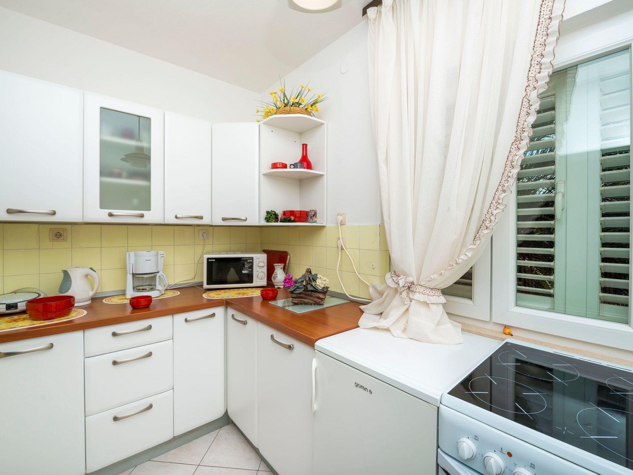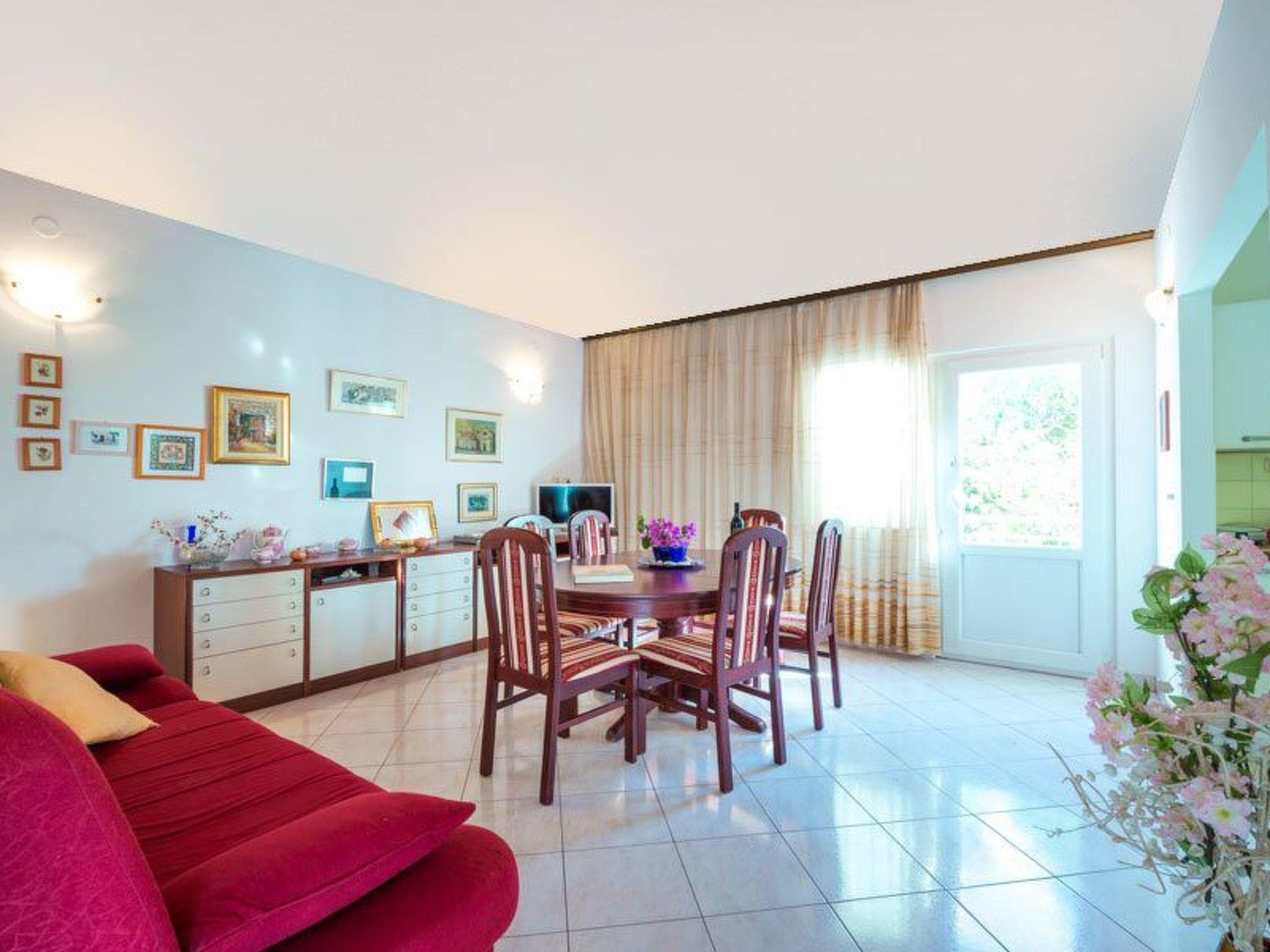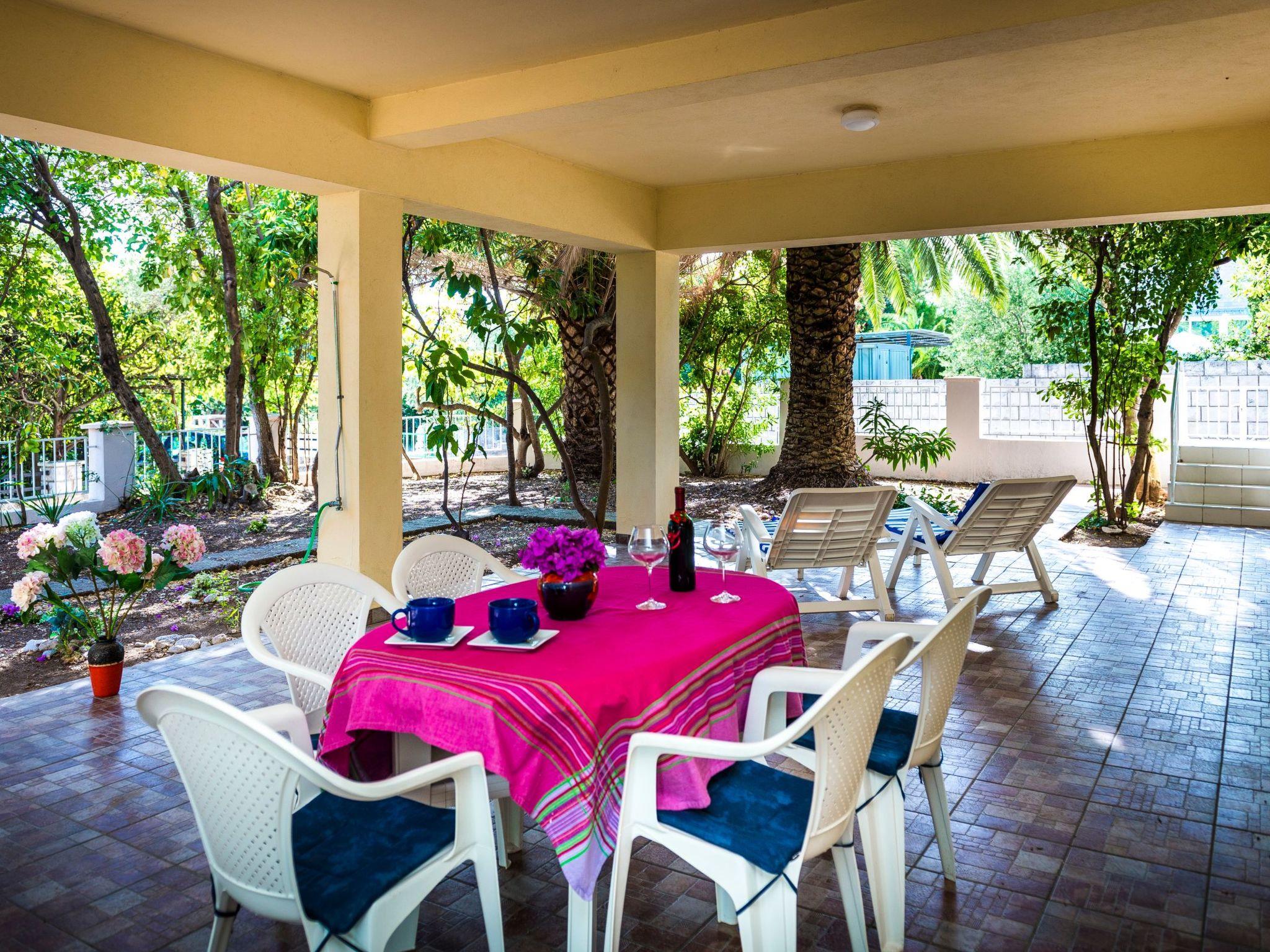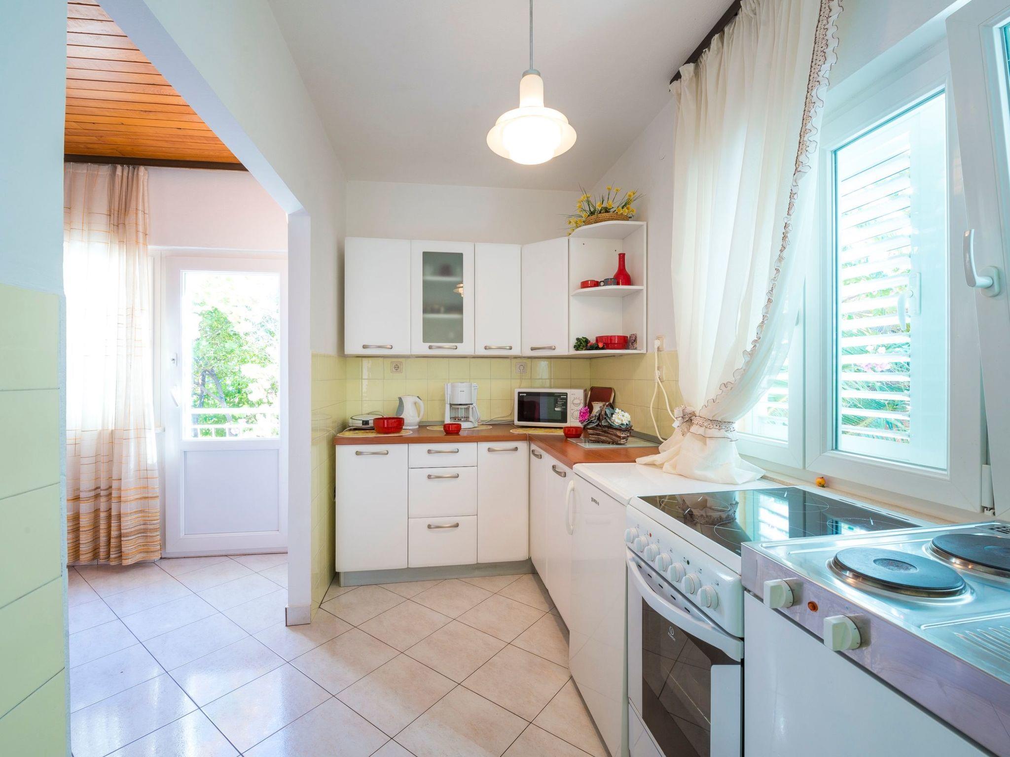 The outdoor area of the property is just as inviting, with 500 m2 of private, fenced grounds featuring trees and a natural garden. Just a stone's throw away, at 30 meters, is a pebble beach for those who love to swim or sunbathe, while the largest sandy beach "Trstenica" is only 200 meters away. This beach stretches over 1000 meters and offers a perfect place for a day under the sun. With two parking spaces available—one in the garage and one in front of it—guests have the convenience of secure parking right at the property.