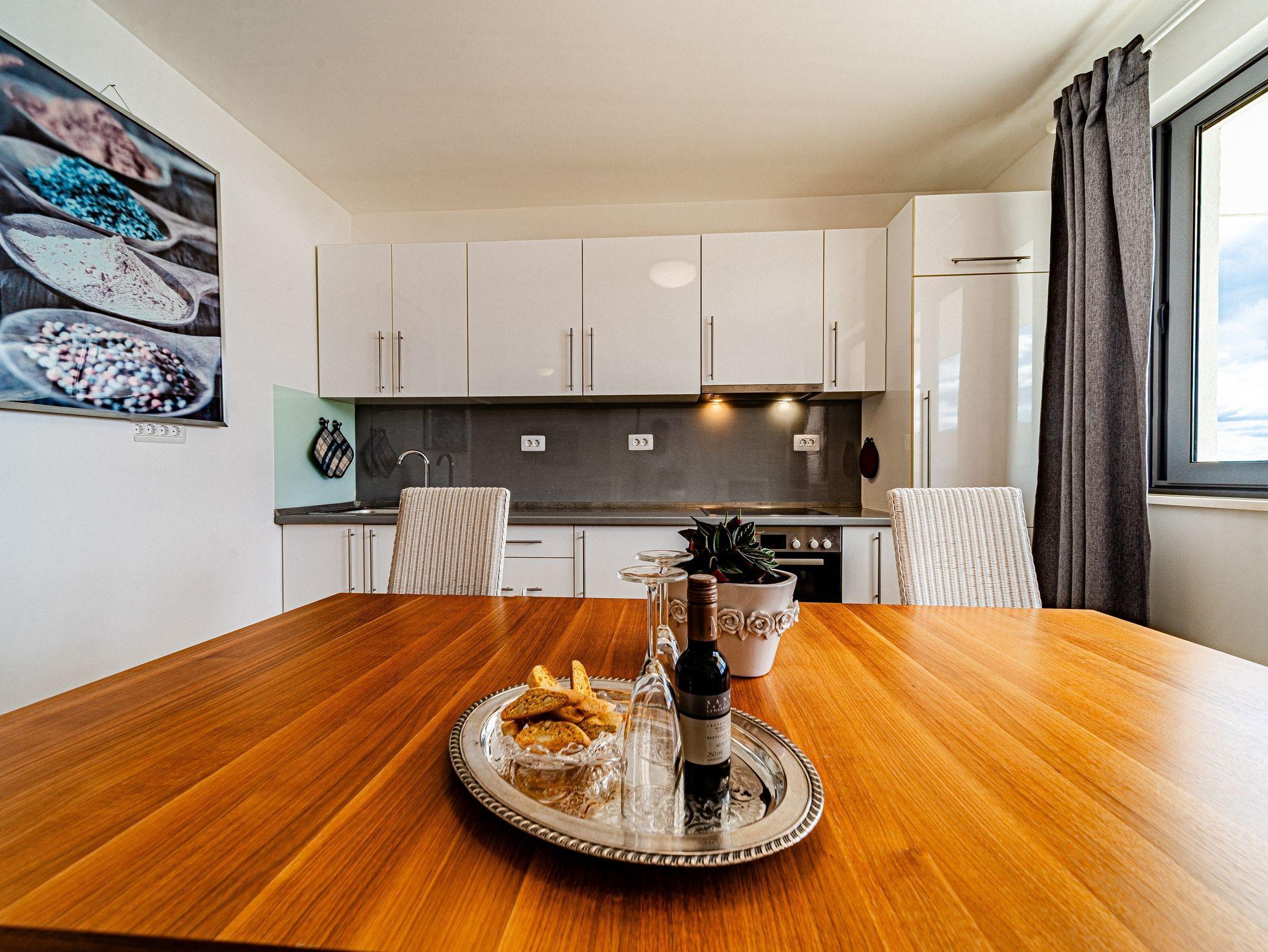 Ferienwohnung bietet Platz für 4 Gäste. Die Betten sind in Schlafzimmern, die es 2 gibt, innerhalb einer Gesamtfläche von 56m2, angeordnet. Die Gäste haben eine eigene Terrasse zur Verfügung, auf der sie in warmen Sommernächten genießen können. Das Apartment bietet Meerblick. Es ist erlaubt, Speisen auf dem Gemeinschafts-Grill vorzubereiten. IM PREIS INBEGRIFFEN: Kurtaxe, Endreinigung, Klimatisierung, Parkplatz, Internet, Wäschewaschen, Fahrrad, Bügeleisen, Bügelbrett, Föhn, tragbarer Grill. Die Verfügbarkeit zusätzlicher Dienstleistungen in Ihrem reservierten Termin und die Preise derselben (falls nicht aufgeführt) müssen im Voraus überprüft werden. Zusätzliche Dienstleistungen die in der Zahlungsaufforderung nicht aufgeführt sind werden direkt beim Vermieter bezahlt, angenommen der Gast nutzt auch diese. Ermäßigung auf den Grundpreis: Gratistag 14=13 (bei einem Aufenthalt von 14 Tagen oder mehr erhalten Sie einen Gratistag für den Aufenthalt bis 31.12.26).