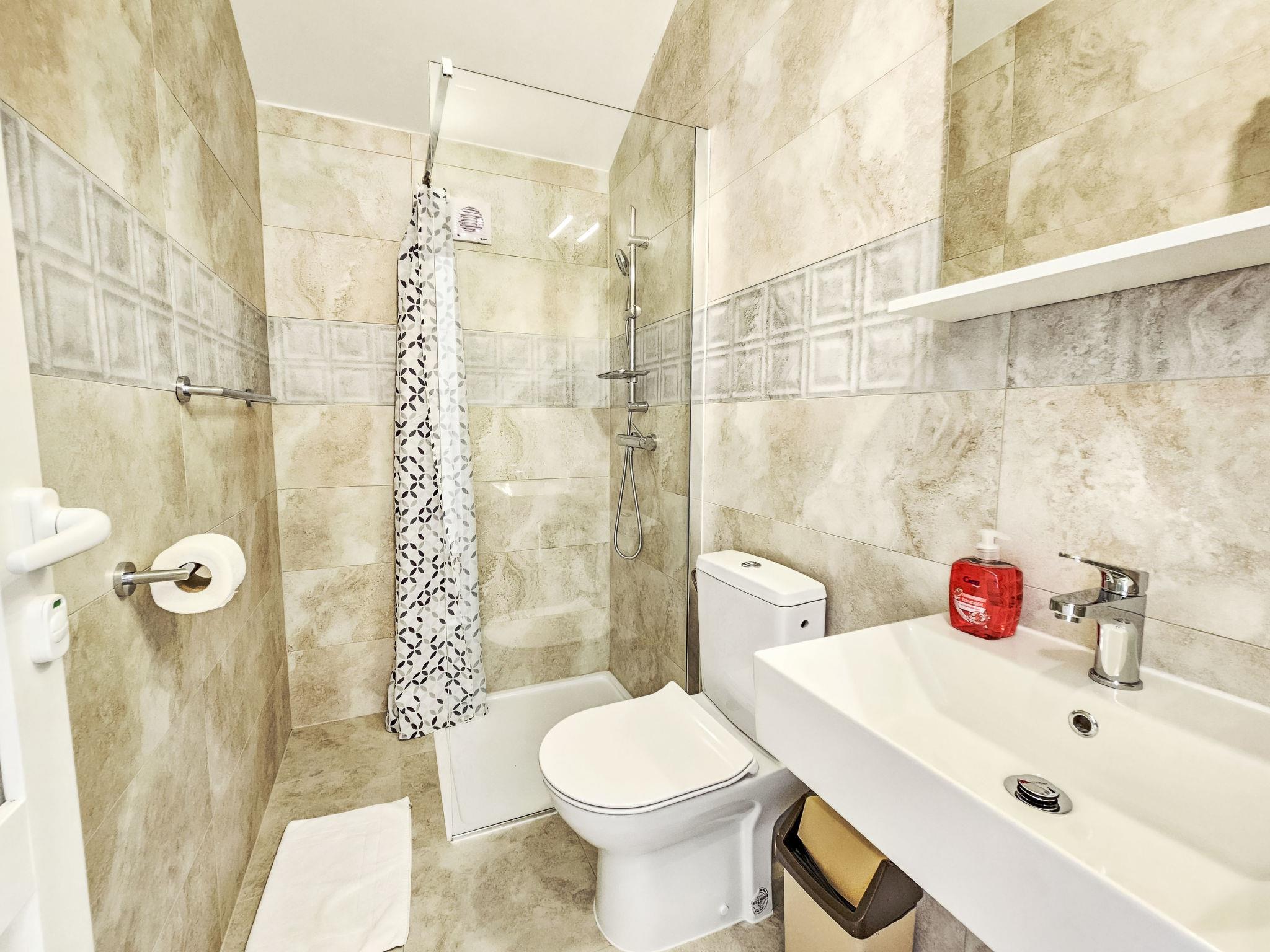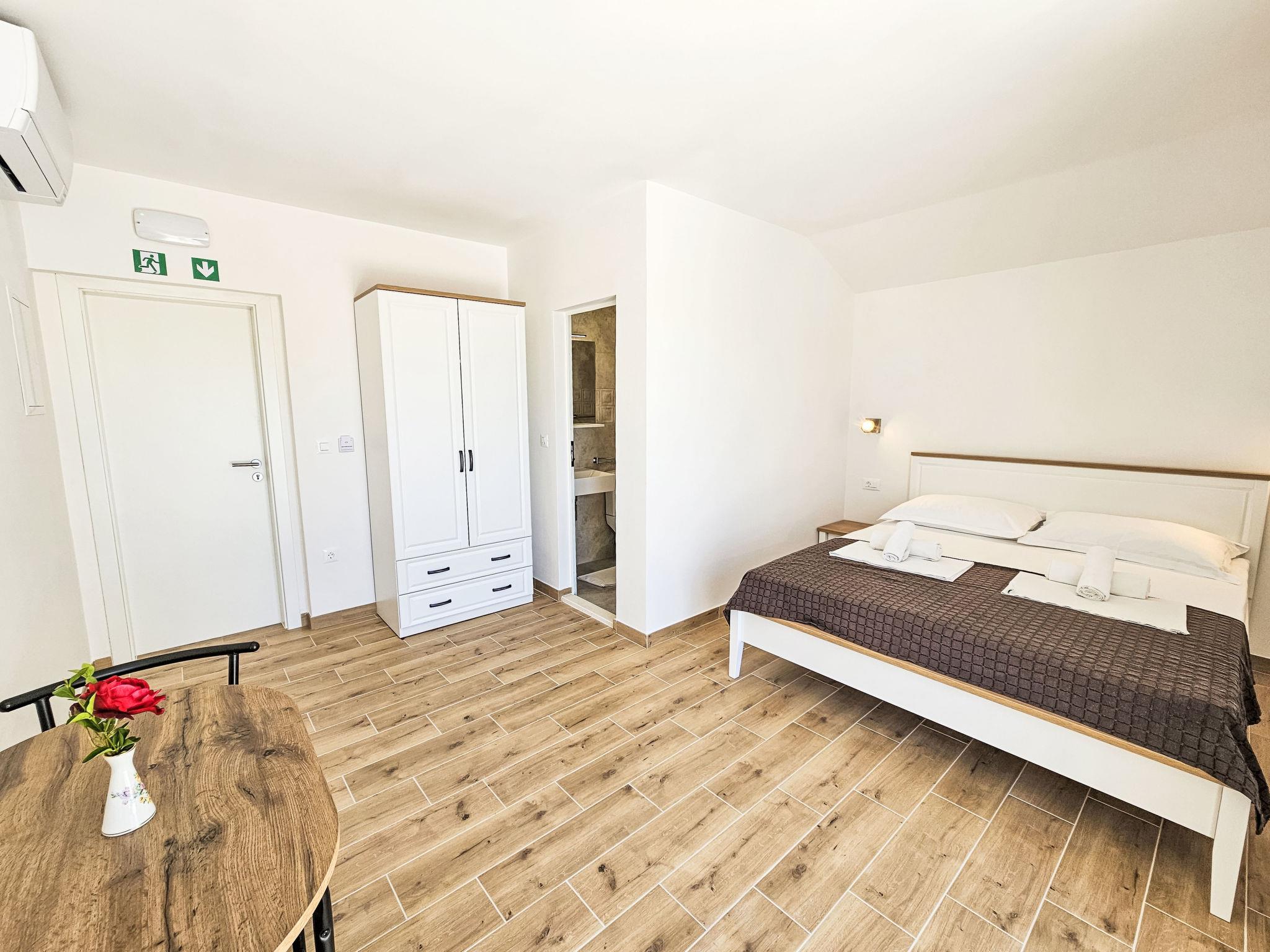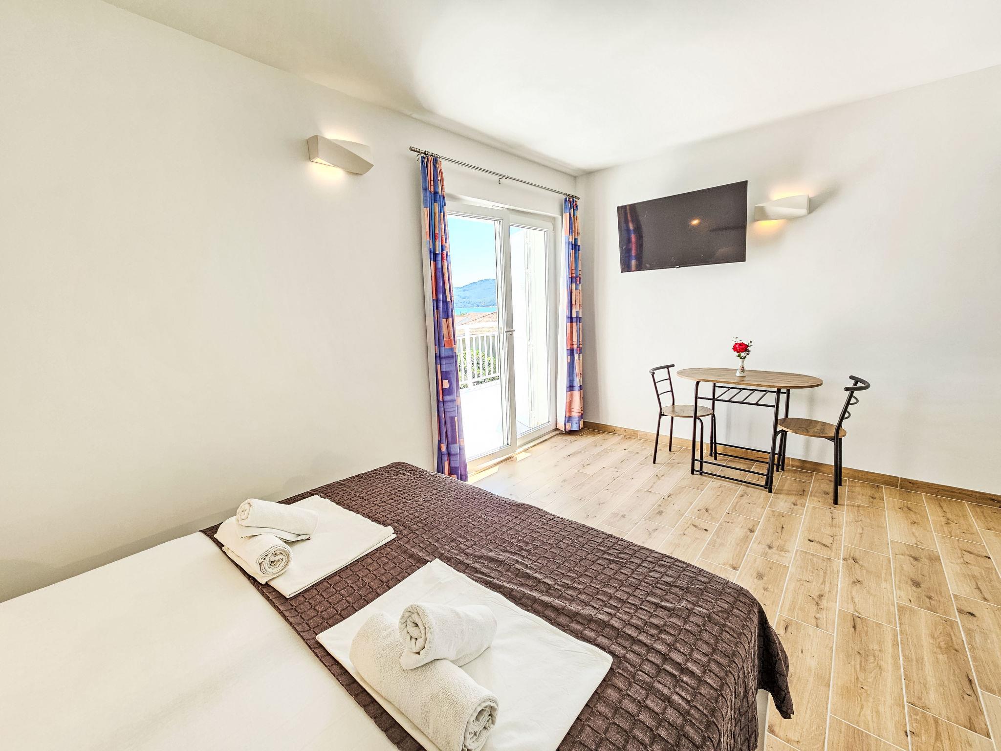3-room apartment 41 m2 on 2nd floor. Partly with sloping ceilings, fully renovated in 2024: 1 room with 1 double bed (160 cm, length 200 cm), shower/WC, satellite TV and air conditioning. Exit to the balcony. 1 room with 1 double bed (160 cm, length 200 cm), shower/WC, satellite TV and air conditioning. Exit to the balcony. Kitchen (2 ceramic glass hob hotplates, toaster, kettle, freezer, electric coffee machine). Balcony 14 m2. Balcony furniture. Side view of the sea. Facilities: Internet (WiFi, free). Maximum 1 pet/ dog allowed. No internal connecting door between the separated properties.
