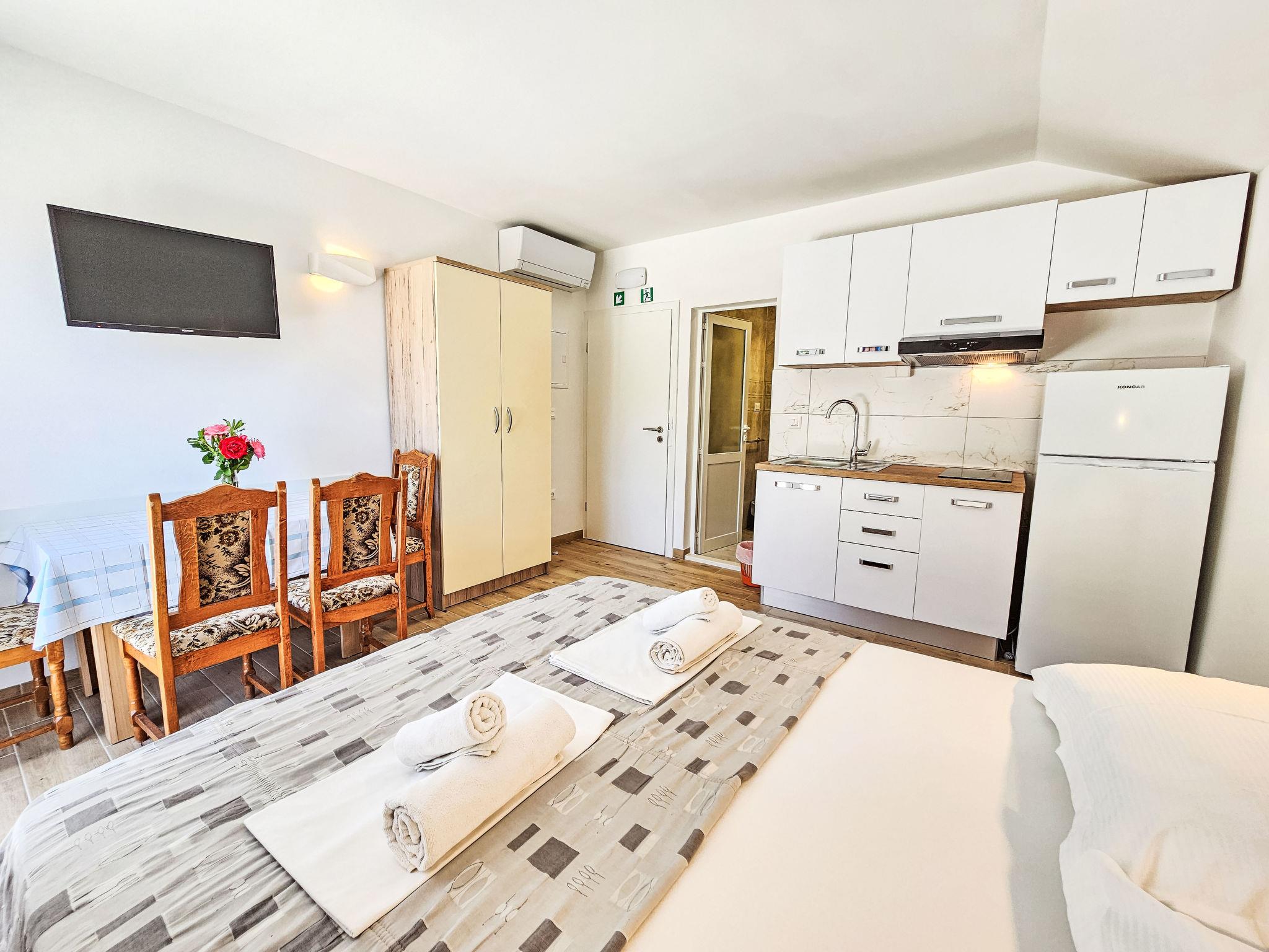 2-room apartment 36 m2 on 2nd floor. Fully renovated in 2024: living/sleeping room with 1 double bed (160 cm, length 200 cm), shower/WC, satellite TV and air conditioning. Exit to the balcony. 1 room with 1 double bed (160 cm, length 200 cm), shower/WC, satellite TV and air conditioning. Exit to the balcony. Kitchen (2 ceramic glass hob hotplates, toaster, kettle, freezer, electric coffee machine) with dining table. Balcony 16 m2. Balcony furniture. Facilities: Internet (WiFi, free). Maximum 1 pet/ dog allowed.