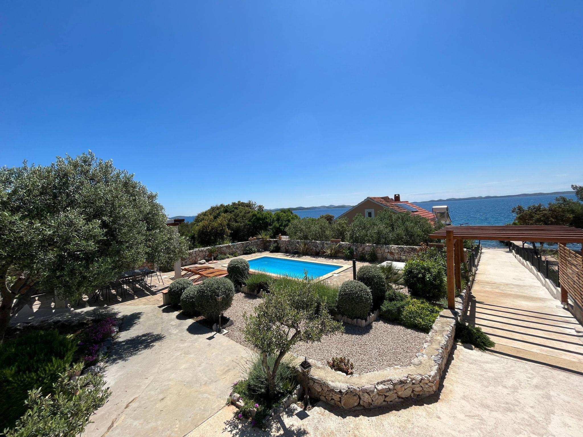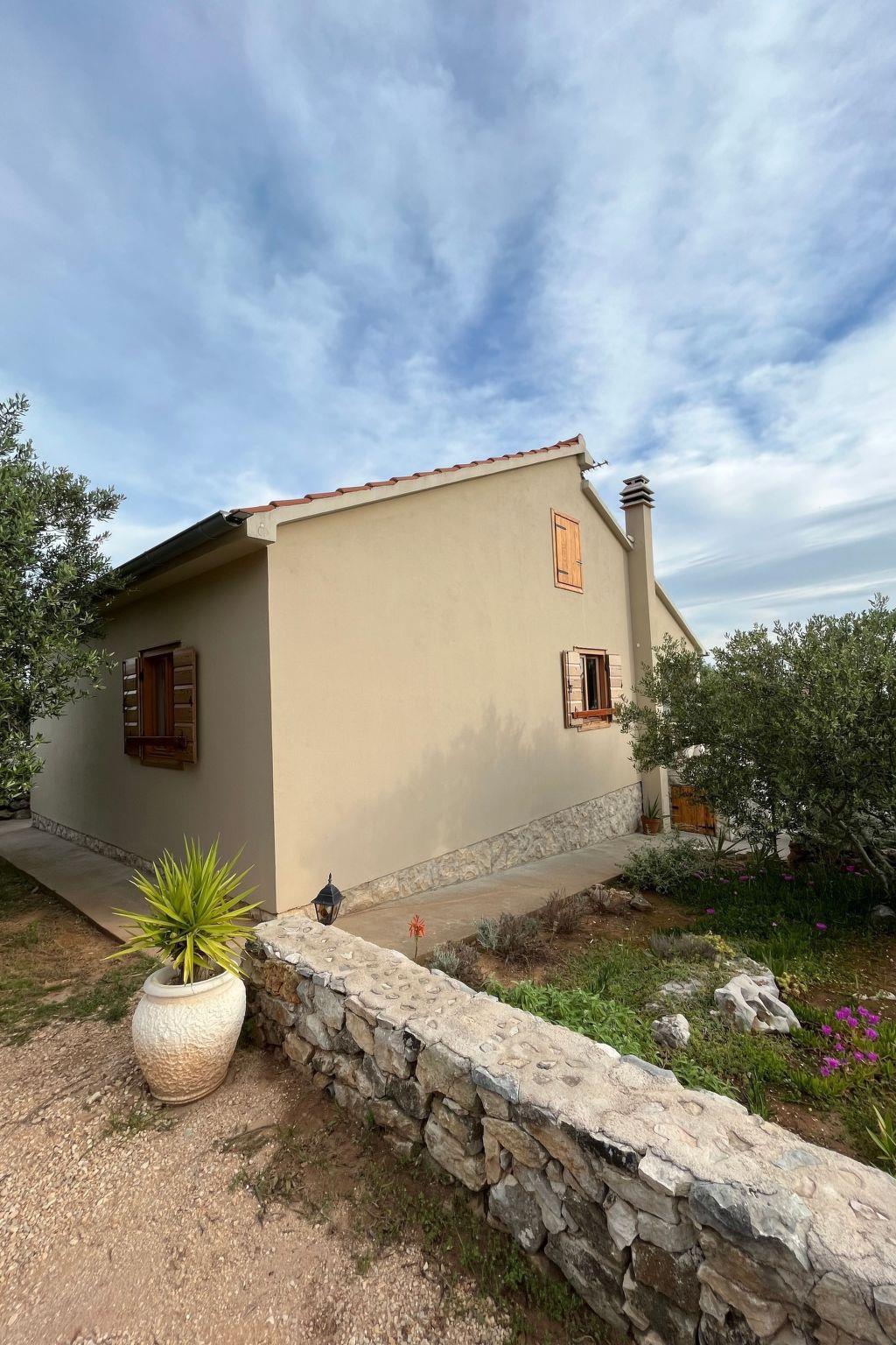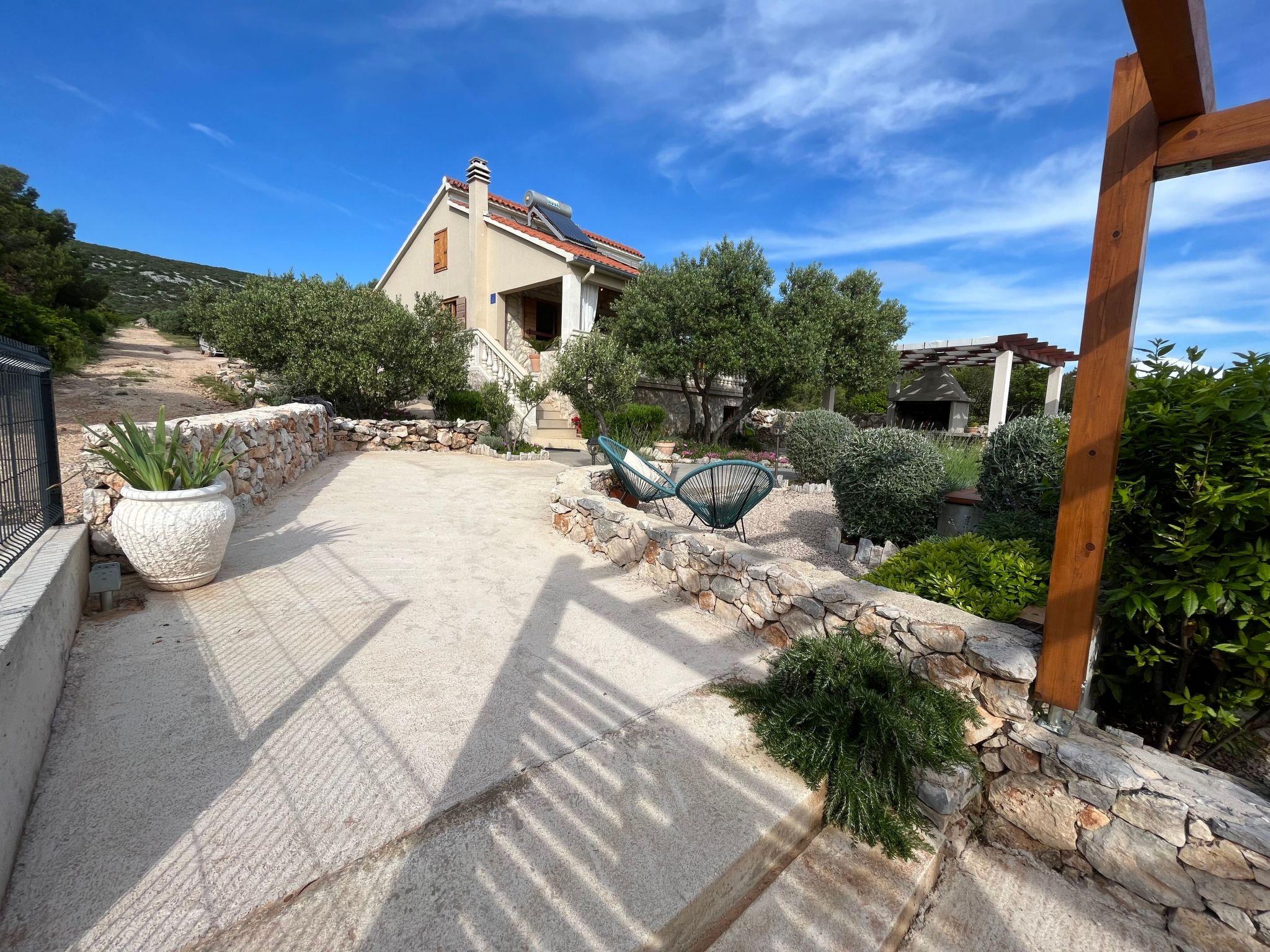 This modern holiday house is literally just a few steps from the blue sea by the sunny south-west coast of the Croatian island Pasman. It has just one neighbouring house and enjoys a perfect location for a relaxing seaside holiday in absolute privacy, truly far away from tourist noise.Detached, recently built (2009) holiday house in a romantic Robinson Crusoe location with its own boat jetty and a panoramic sea view from the large terrace with a traditional stone grill