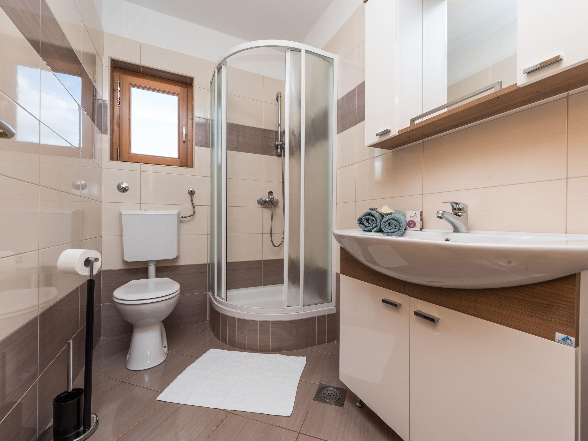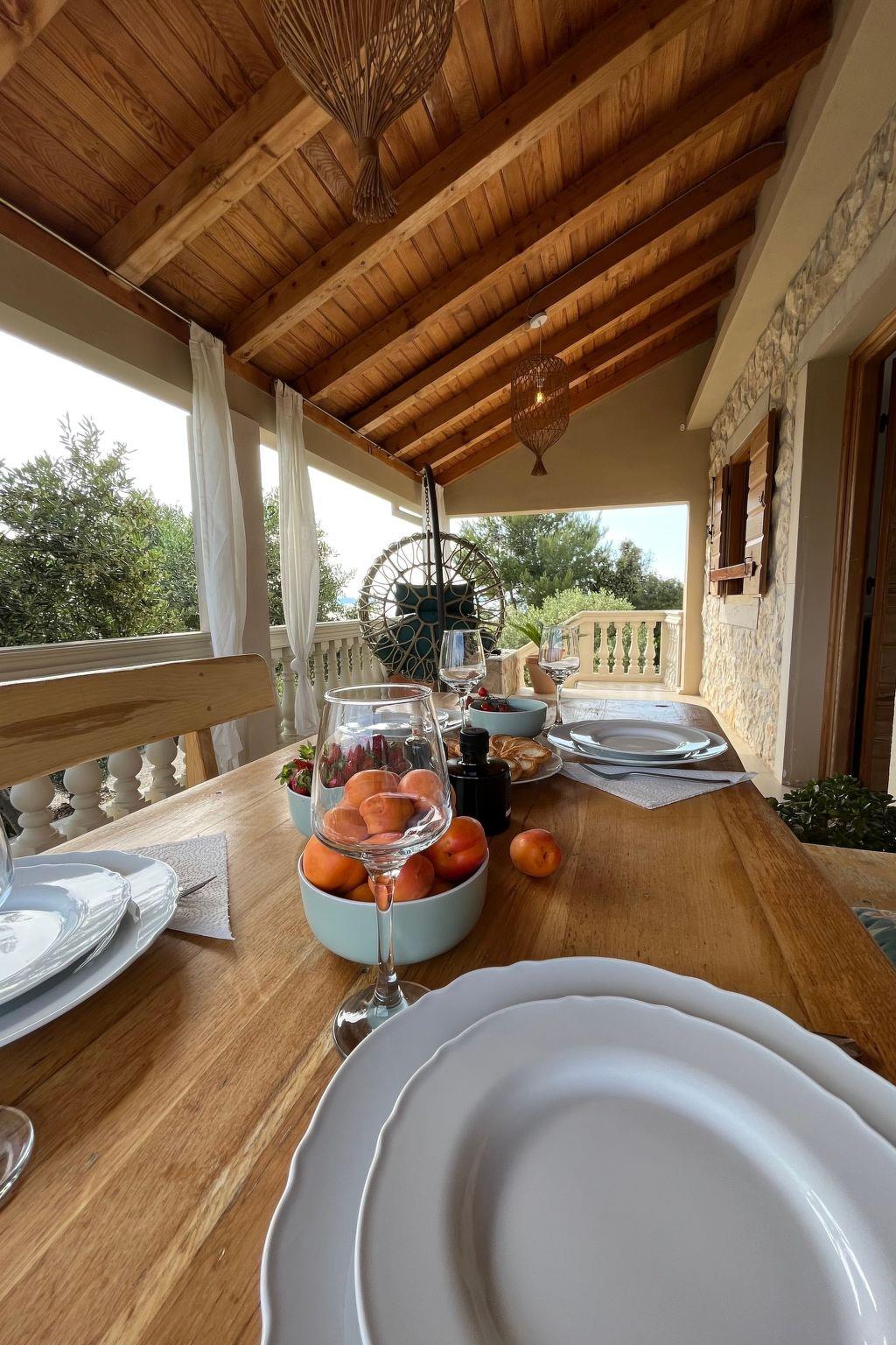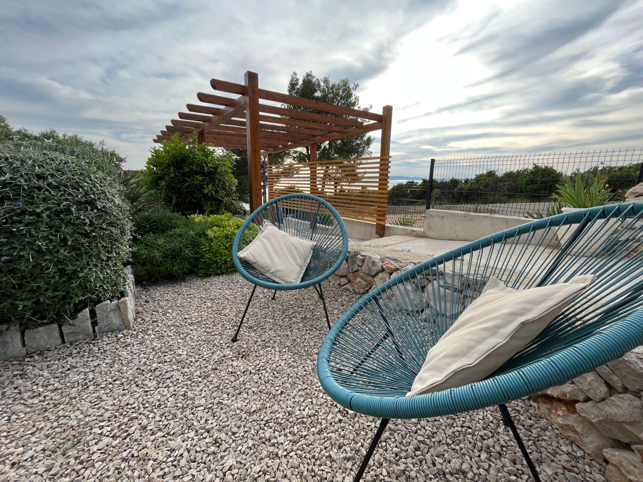You can make yourselves comfortable on the roofed terrace right in front of the house with a wooden table and benches and enjoy the panoramic sea view over the blue Adriatic. Down in the extensive garden charmingly planted with olive trees, Mediterranean bushes and herbs there is a traditional stone grill, inviting you to enjoy leisurely evenings outdoors. There is a convenient outdoor shower and a private pool.