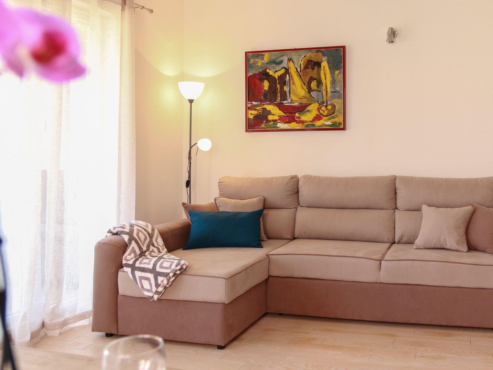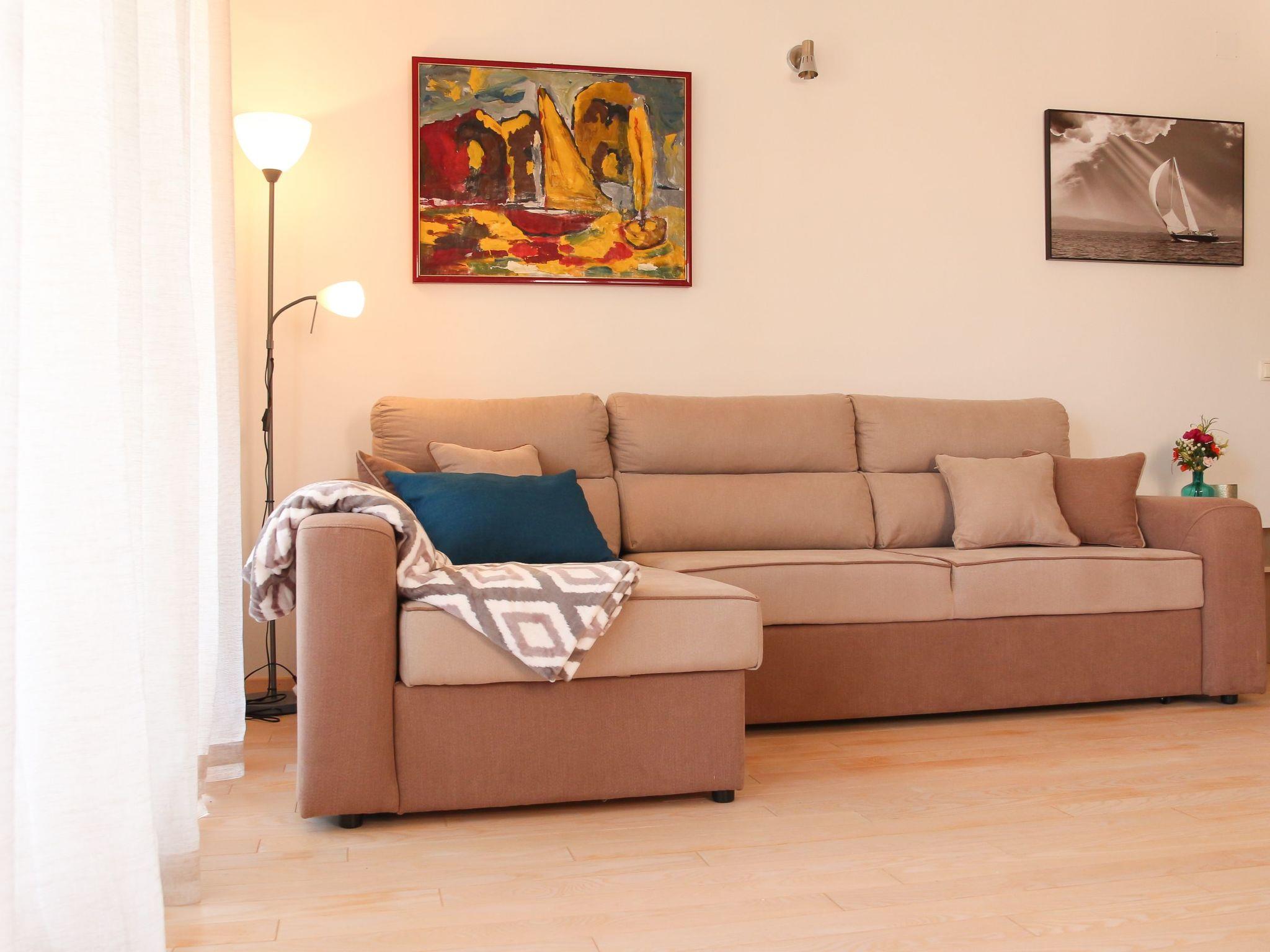The apartment is 60m3 located on the ground floor, it has air-conditioning and internet access. It consists of 2 bedrooms with double beds comfortably accommodating 4 people, a bathroom with shower and toilet. Living room and kitchen in one leading onto the balcony with a beautifull sea view. The kitchen is equipped with a 4 ring hobs, fridge with freezer compartment and electric kettle.