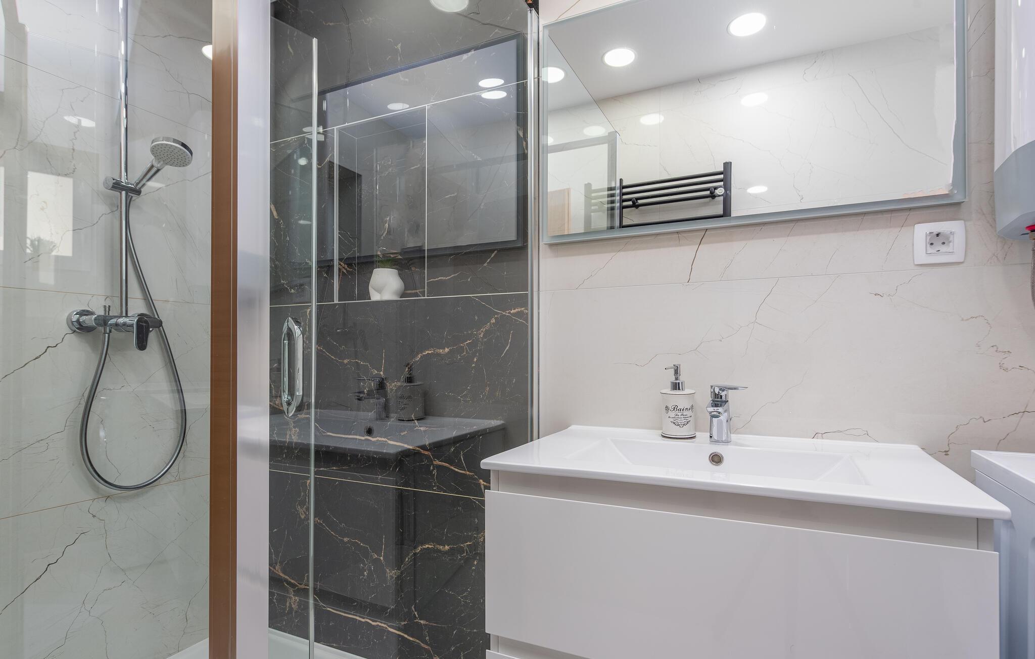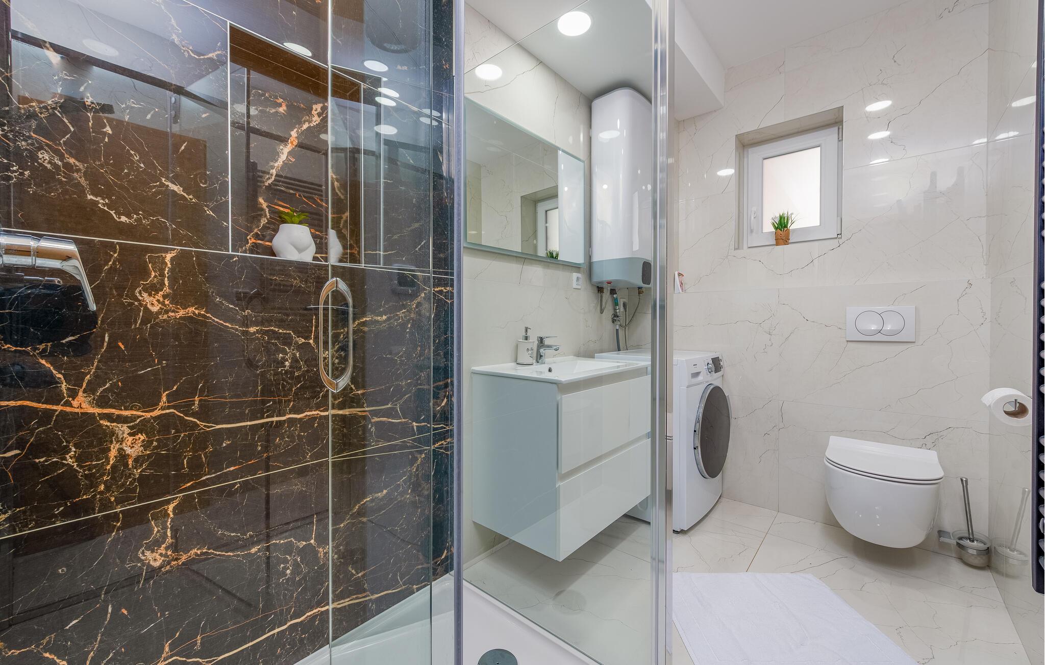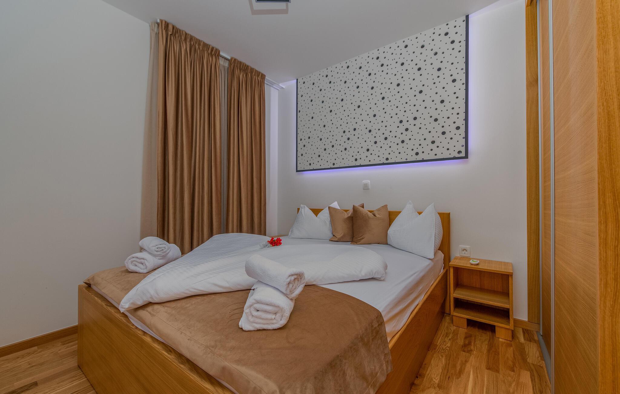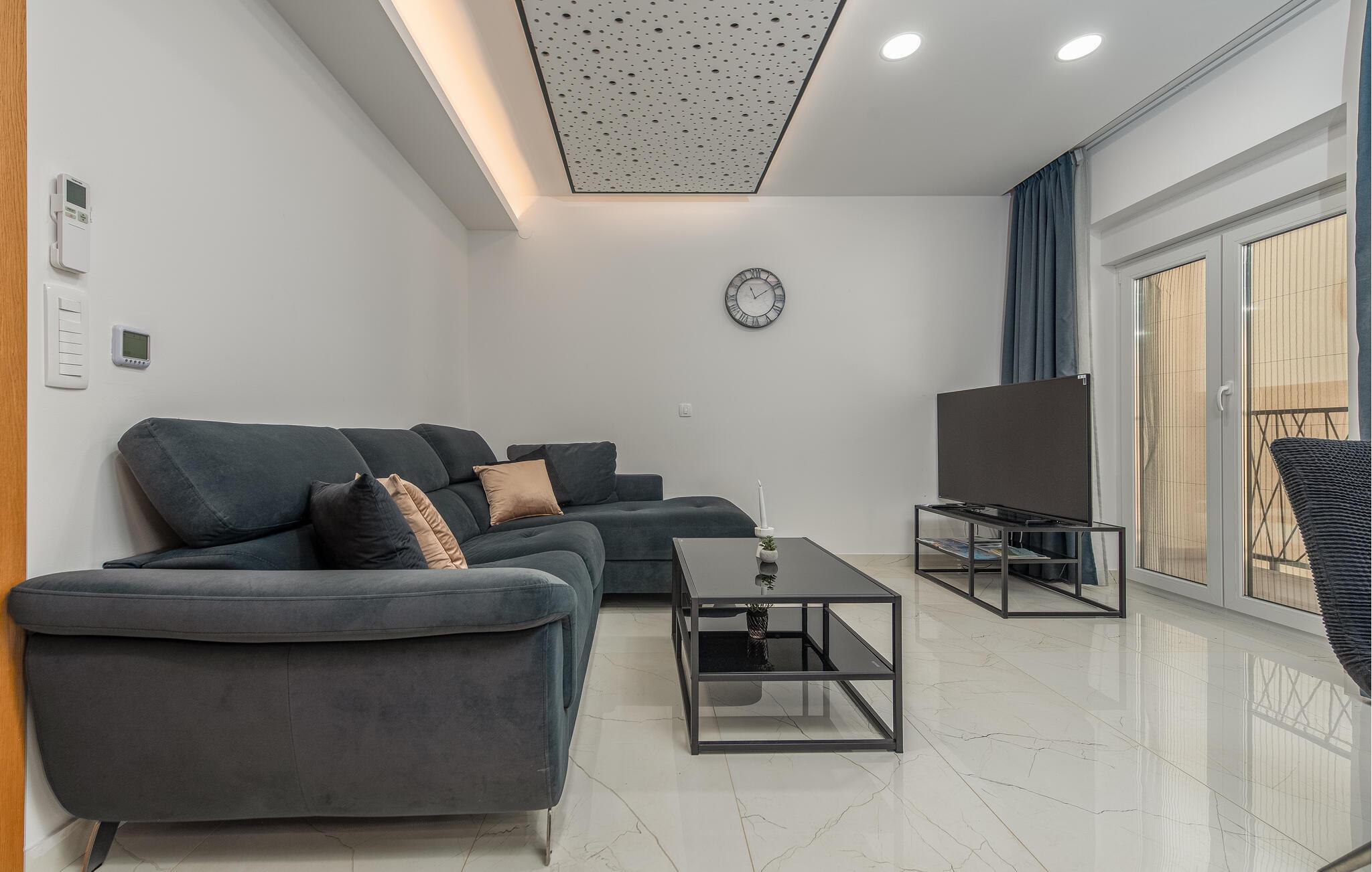 Denne komfortable ferieleiligheten ligger bare noen få skritt fra den vakre stranden, og ønsker deg velkommen med elegante møbler og koselig belysning som skaper en innbydende og behagelig atmosfære. Bruk det åpne kjøkkenet til å tilberede kroatiske retter sammen, nyt måltidene ved det stilfulle spisebordet og sett deg godt til rette i den romslige sofaen etter en lang dag, hvor du kan streame en film eller ha en spillkveld med dine nærmeste.