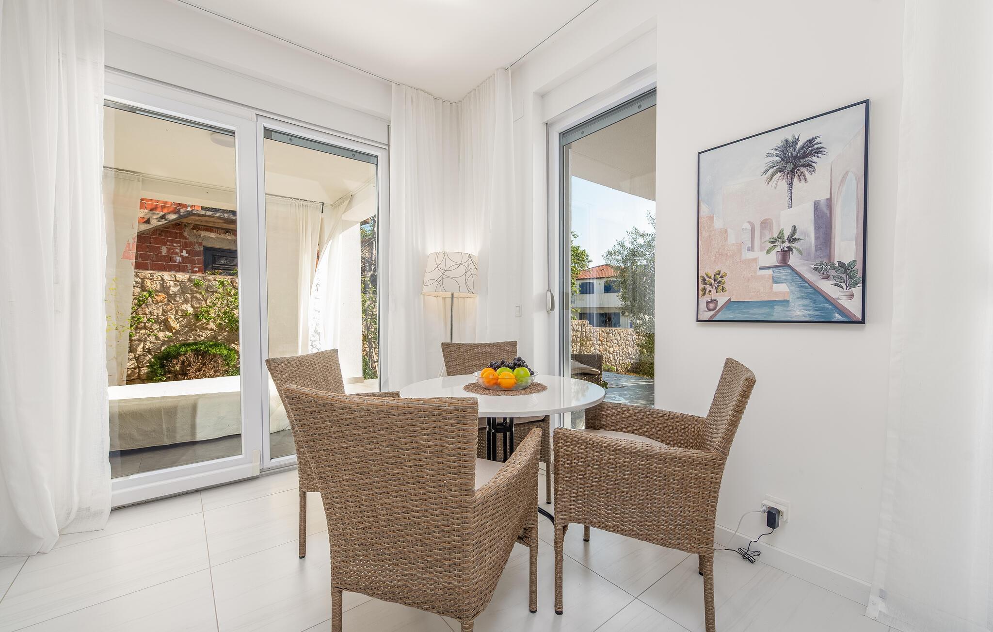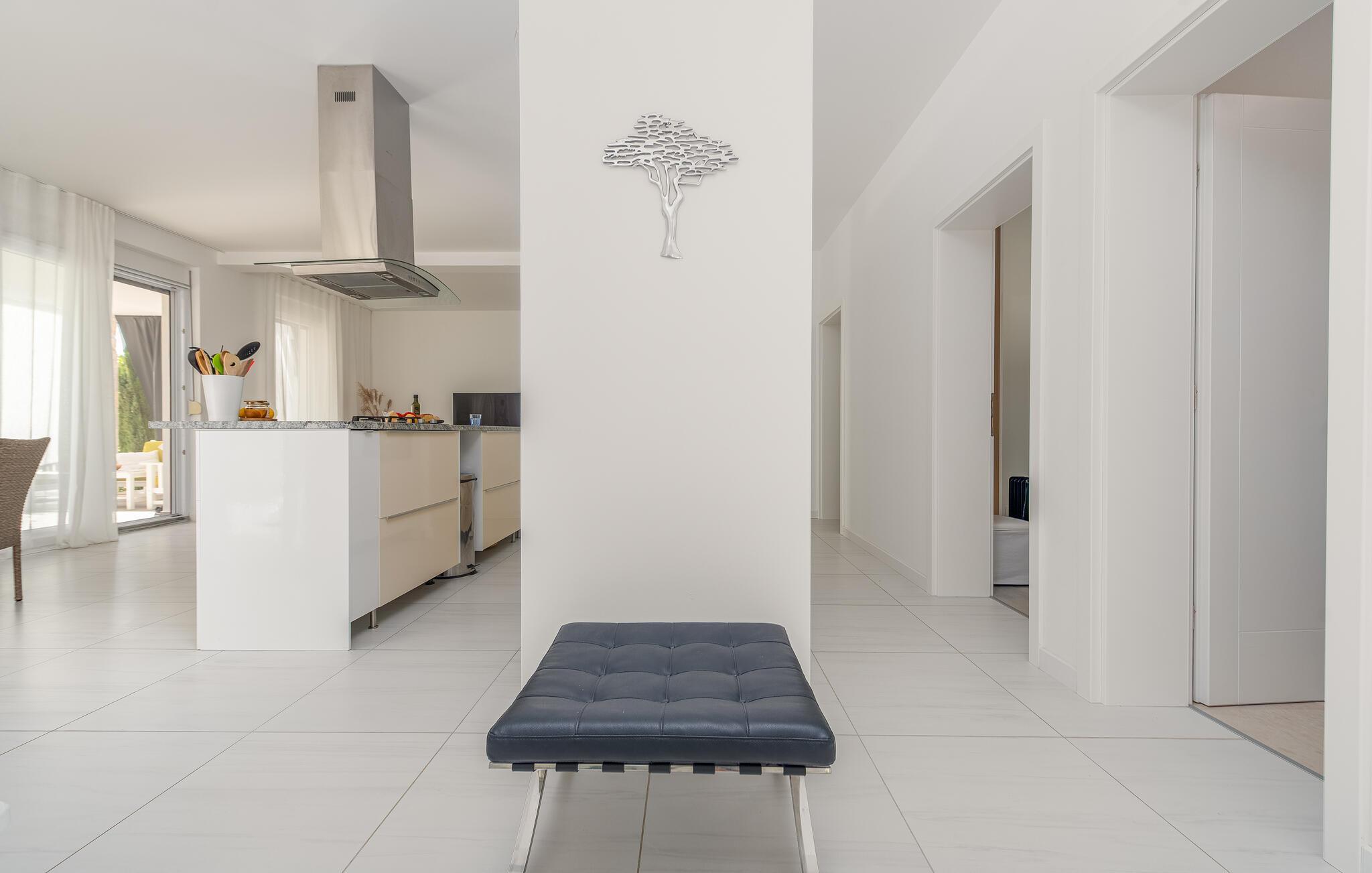 Utenfor utfolder det seg en herlig middelhavsstil. Søk skyggen under oliventrærne i hagen, og veksle mellom solrike og overbygde områder på terrassen. Legg deg ned på en solseng for en rolig lur, eller sol deg og nyt en lang middag under åpen himmel. Rundt om i huset er det salonghjørner som gir deg mange muligheter til å trekke deg tilbake. Her kan du nyte ferien med venner, familie eller som par i fred og ro.