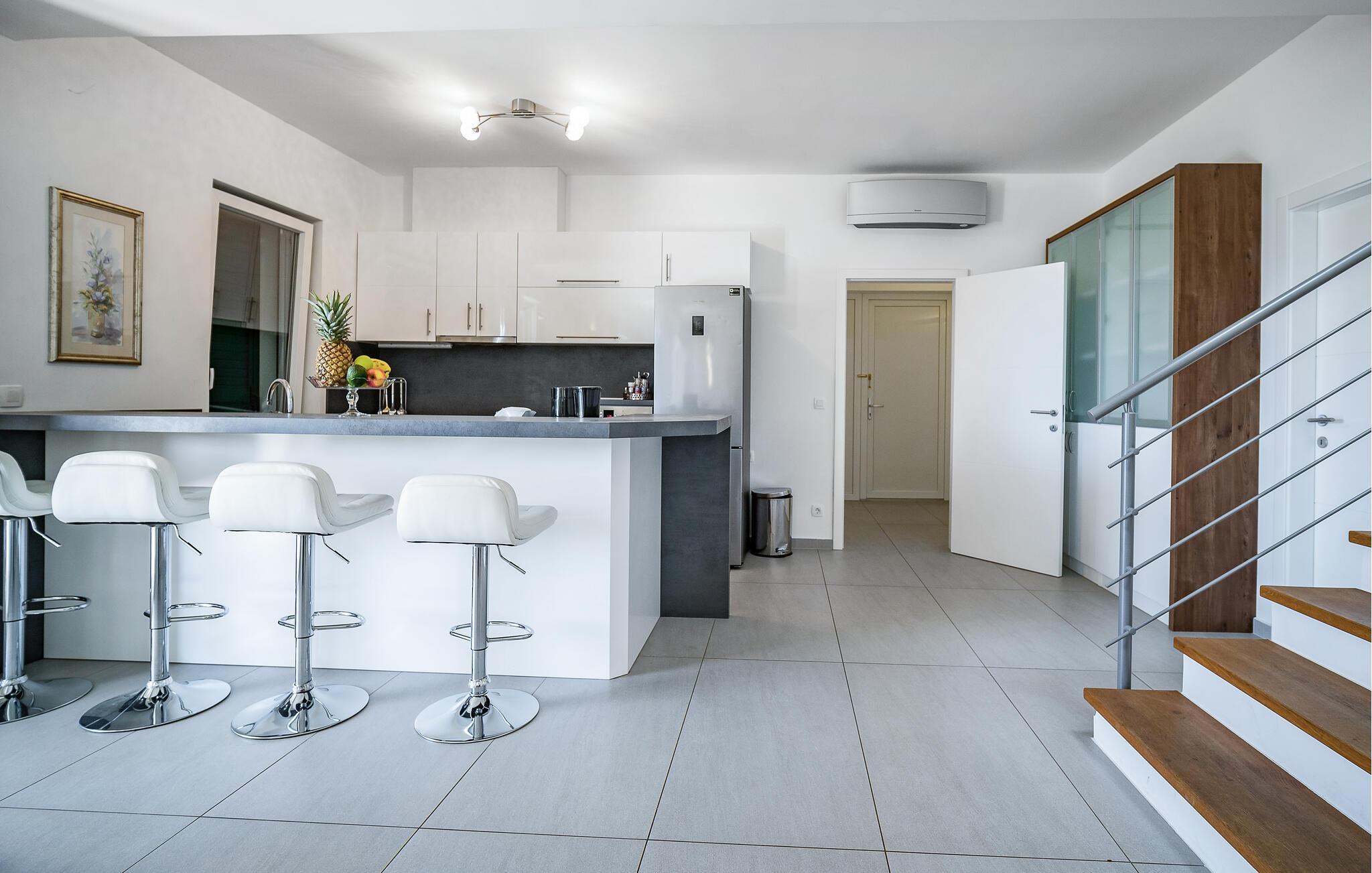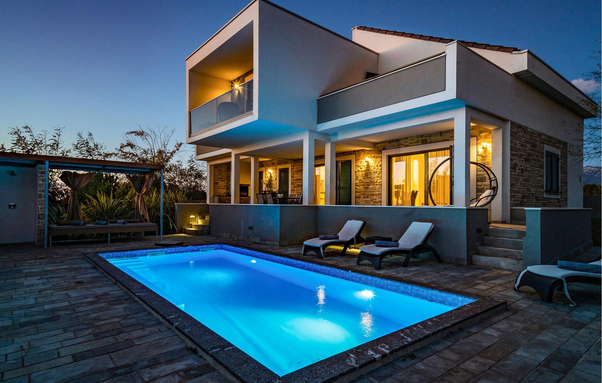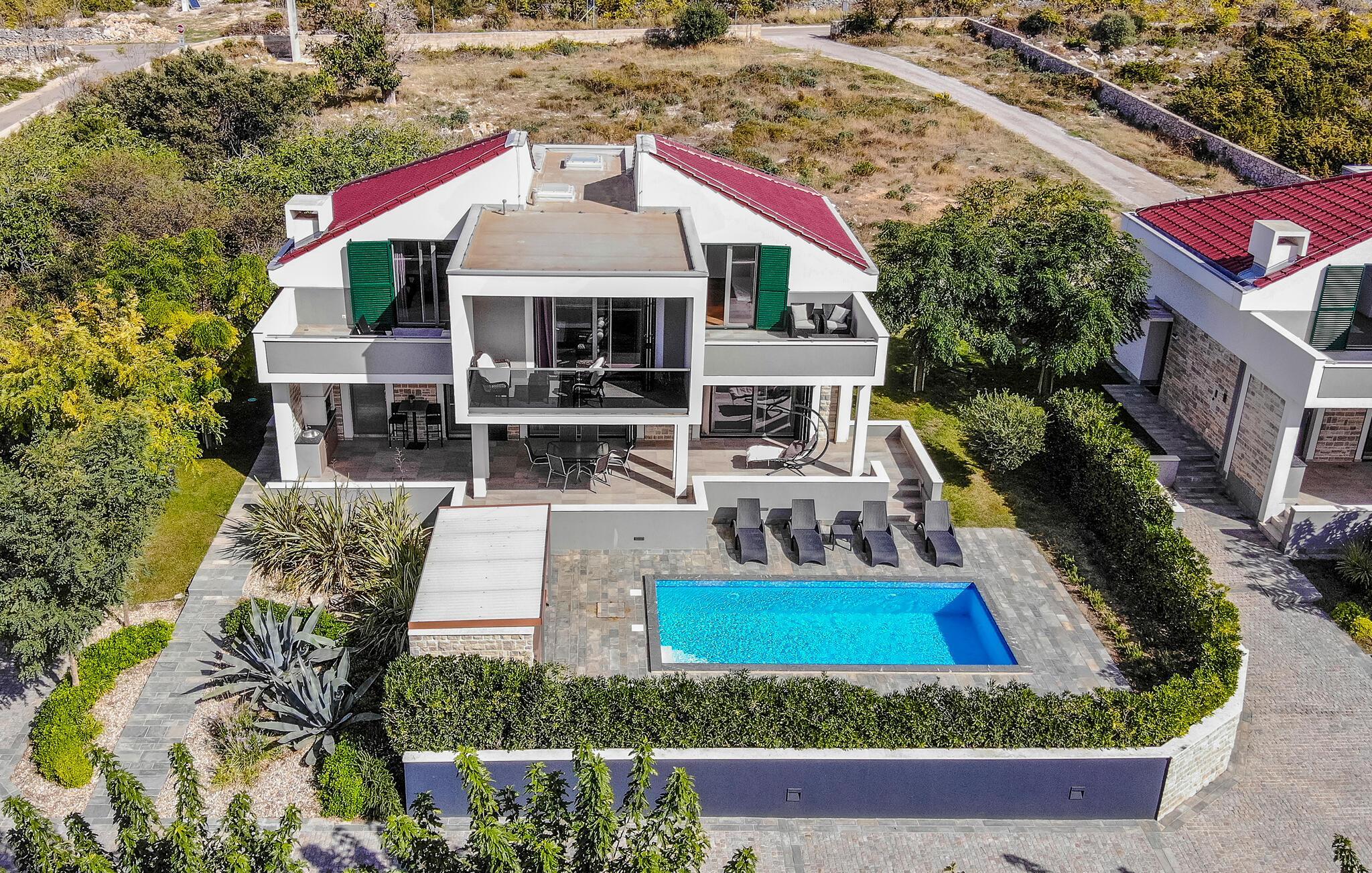 Reis til øya Pag og gled deg til oppholdet i dette store og moderne feriehuset som ikke etterlater noe å savne. Nyt de vakre rommene, som er fordelt over to etasjer og lover deg komfort og attraktive møbler. Når du står opp, kan du gå rett fra soverommet til balkongen og drikke morgenkaffen ute eller slappe av med yogaøvelser. Deretter kan du spise frokost i den åpne stuen og tilbringe de neste timene med å bade i bassenget eller sole deg på solsengen og solstolene.