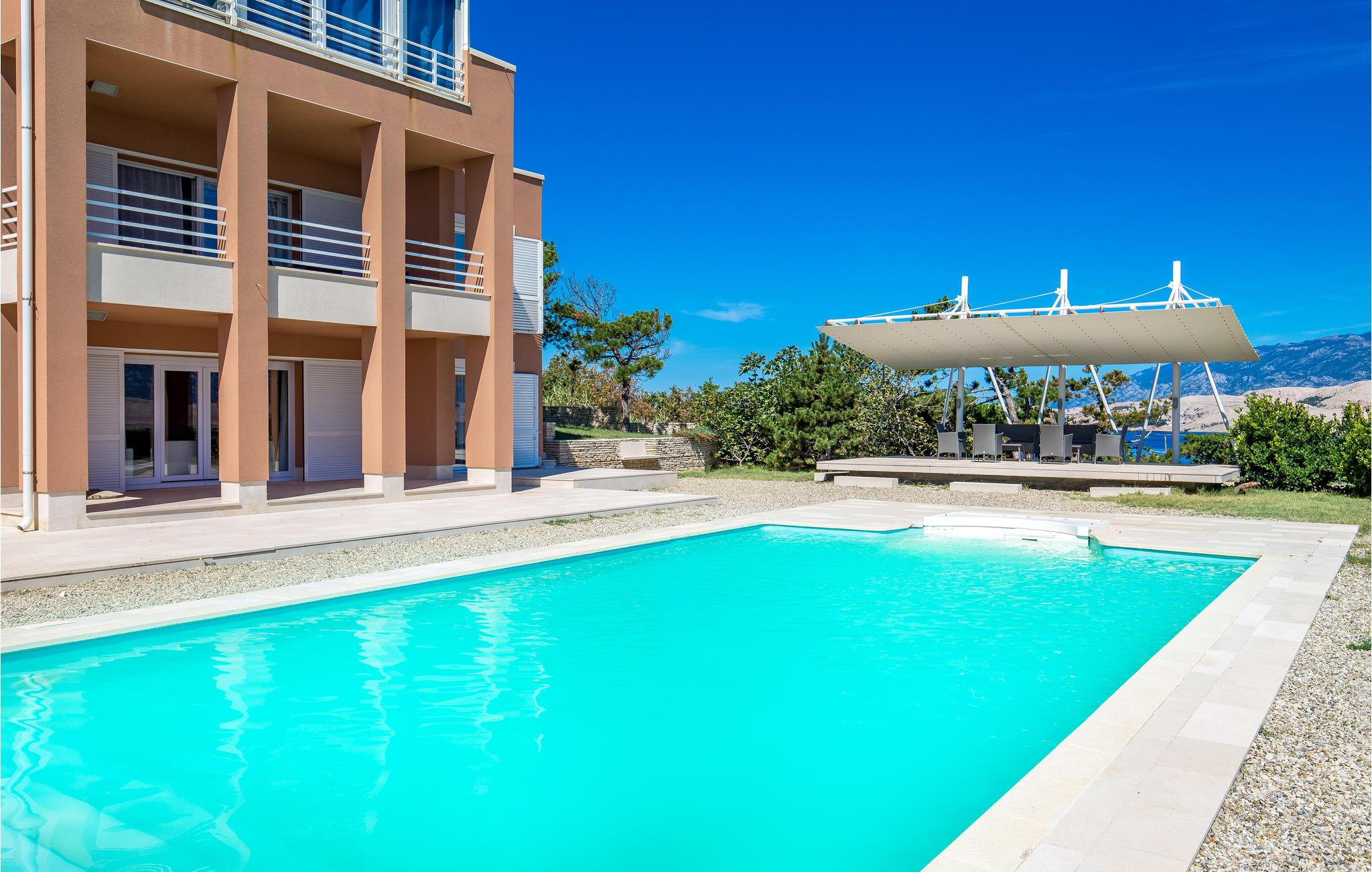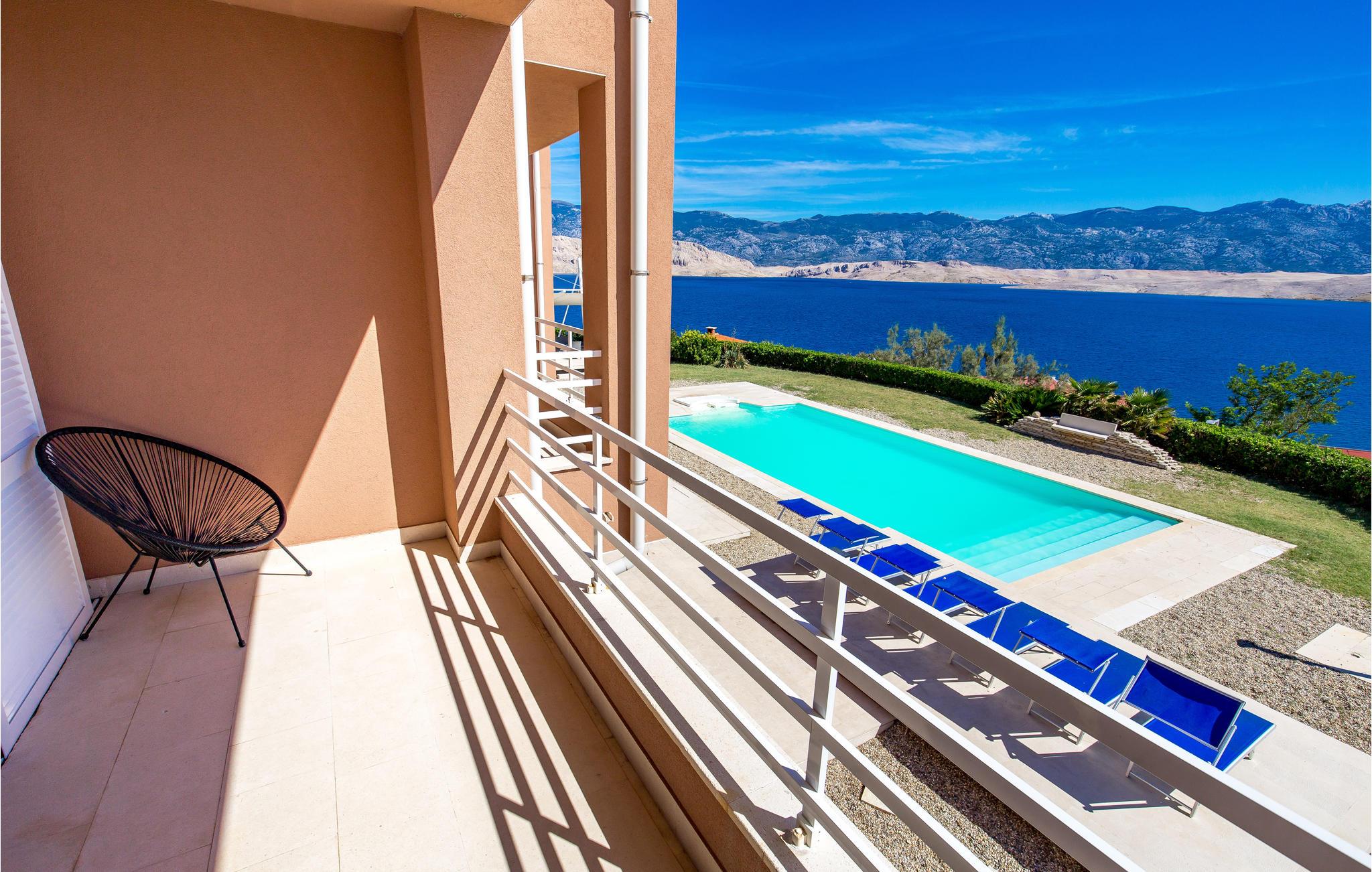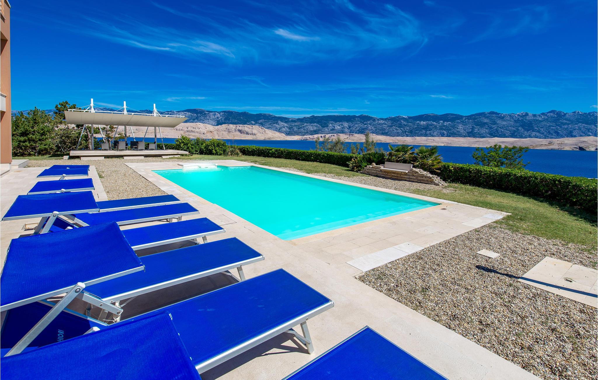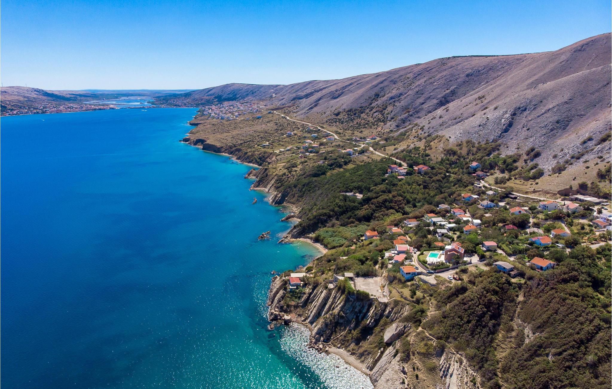 Unn deg en luksuriøs ferie og tilbring årets beste dager i dette drømmehuset med rolig beliggenhet. Allerede i første etasje vil du bli ønsket velkommen av koselige og stilfullt innredede rom. Her finner du den store stuen med det meget godt utstyrte kjøkkenet og spiseplassen samt et bad. I det sentrale området i første etasje er det en stor, overbygd terrasse, et bad og en annen, mindre stue. Fra begge stuene har du flott utsikt over havet, og her er du bare atskilt fra bassengterrassen med skyvedører. I første etasje er det soverom og ytterligere to bad. Soverom 2, 3 og 4 har overbygde terrasser. I 2. etasje er soverom 5, hvorav den ene veggen er en glassfasade og tilbyr derfor en fantastisk utsikt over byen Pag og Velebit-kanalen. Rundt bassenget er det terrasser hvor du kan sole deg. Når det blir for varmt for deg, kan du nyte en kjølig drink i skyggen av paviljongen og utsikten over Velebit-fjellmassivet. På kveldstid er bassenget opplyst og skaper en romantisk atmosfære. Barn kan leke bekymringsløst på den inngjerdede eiendommen. Stranden nedenfor huset er en steinstrand. Du kan imidlertid nå en vakker rullesteinstrand på få minutters gange. Byen Pag ligger bare ca 3 km unna. Her tilbys båtturer og dykkerkurs. Besøk de lokale restaurantene og ikke gå glipp av lam og den krydrede Pag-osten. Skråtak med en minimumshøyde på 1,20 m.