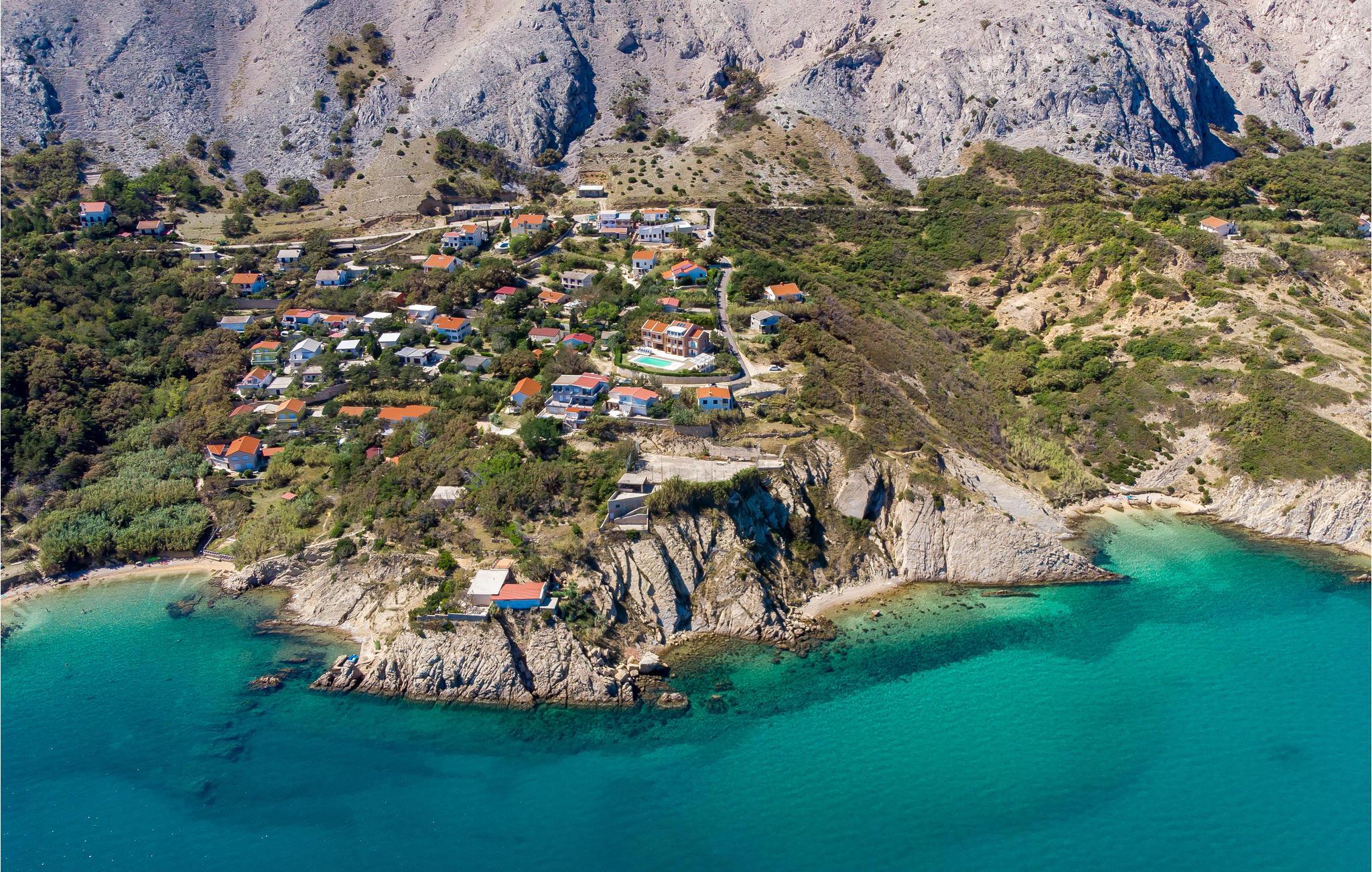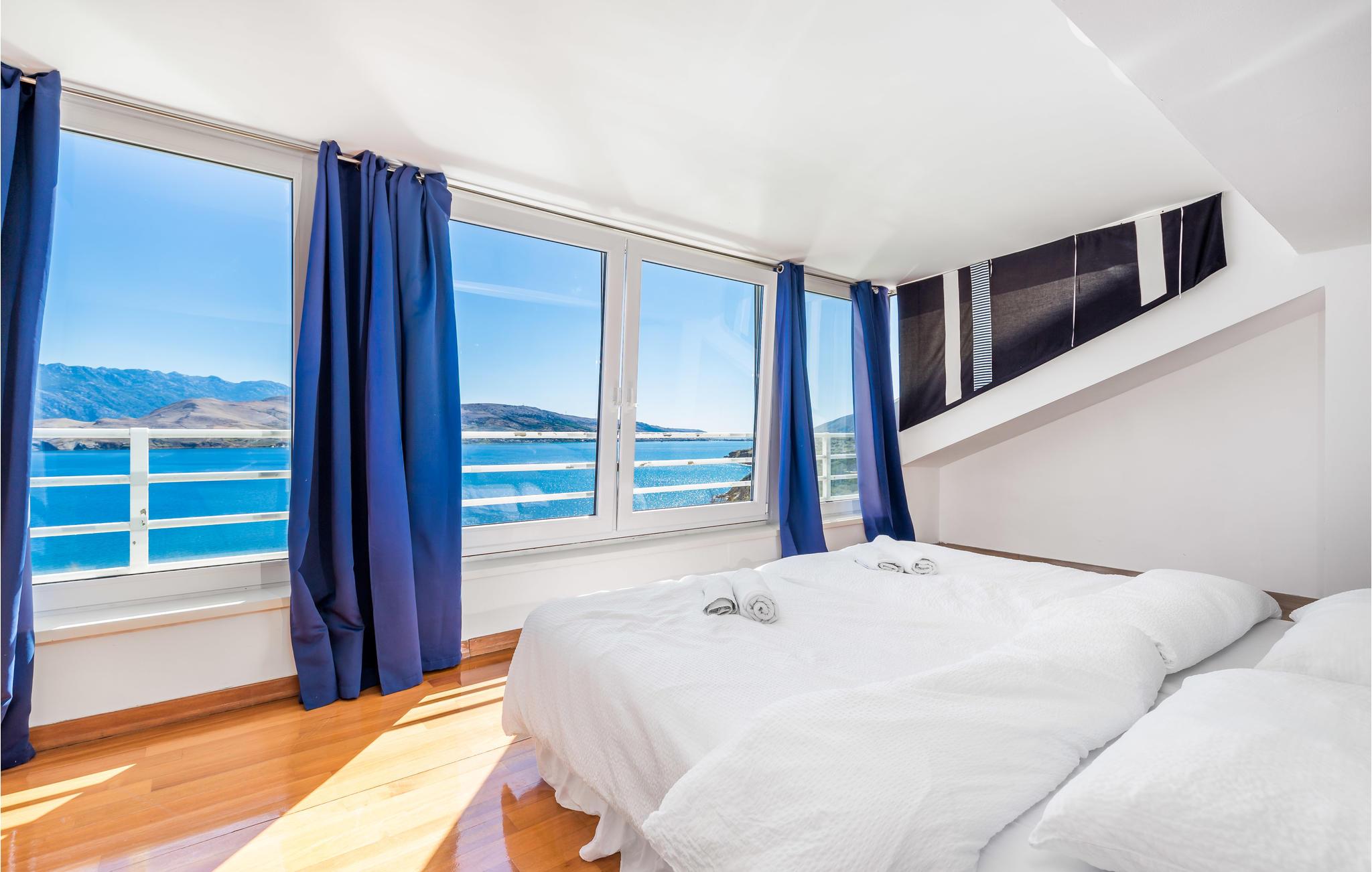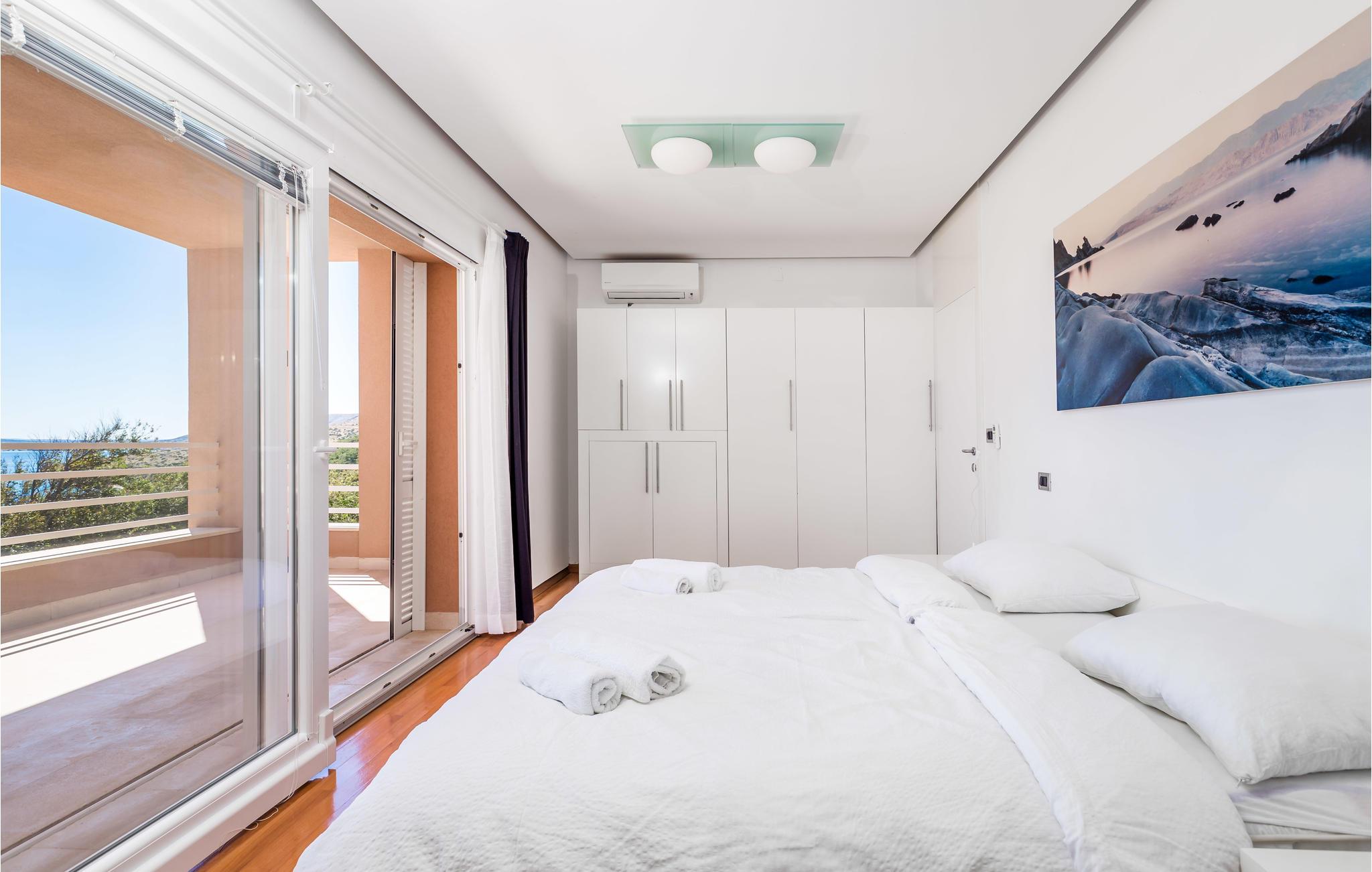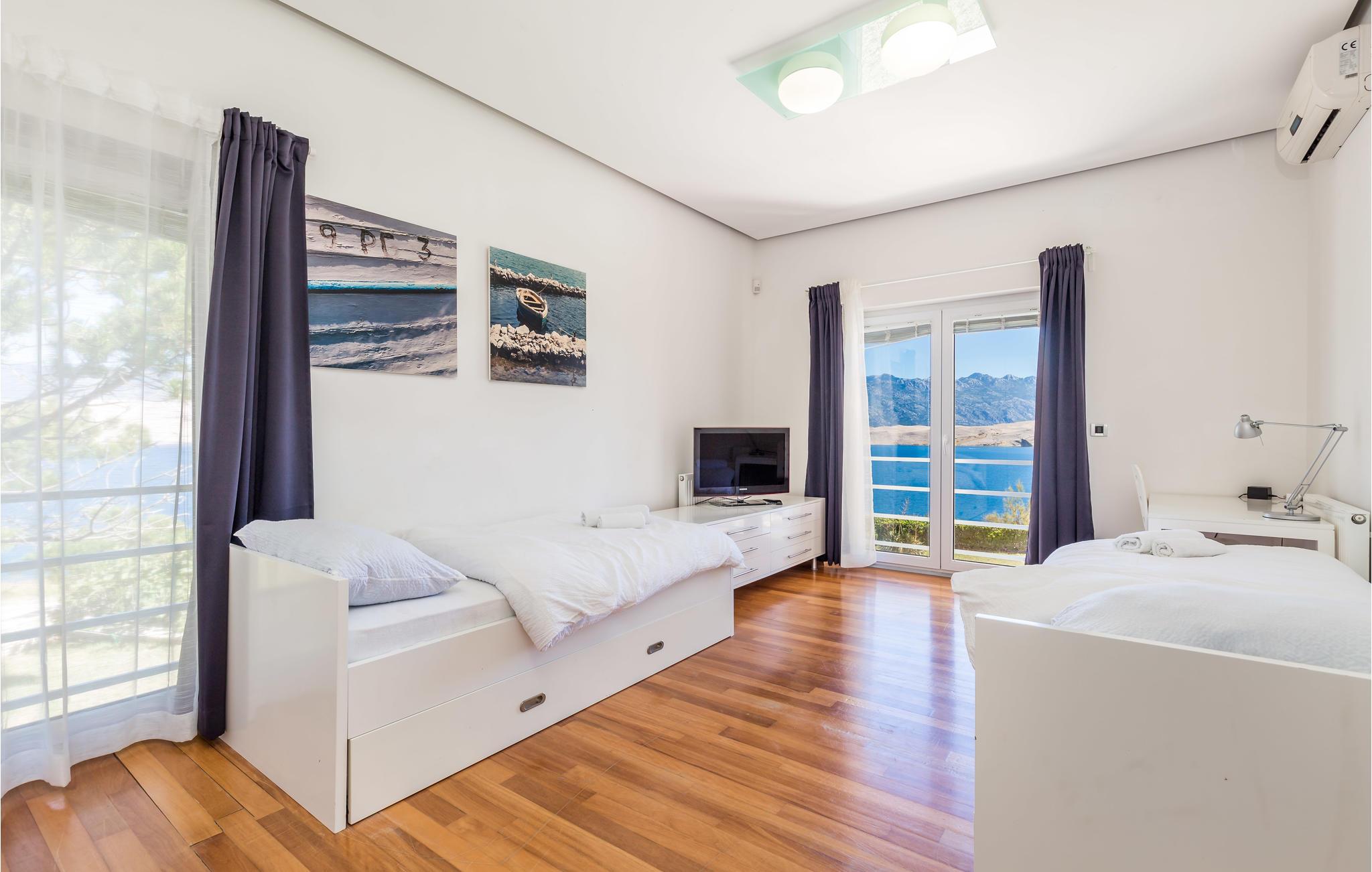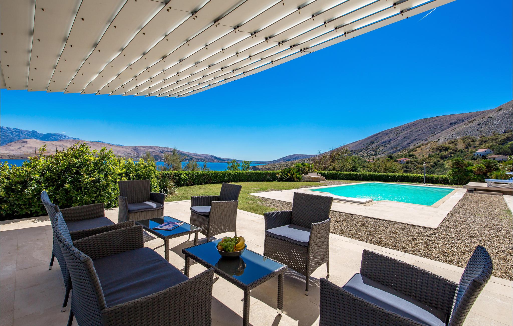 Unn deg en luksuriøs ferie og tilbring årets beste dager i dette drømmehuset med rolig beliggenhet. Allerede i første etasje vil du bli ønsket velkommen av koselige og stilfullt innredede rom. Her finner du den store stuen med det meget godt utstyrte kjøkkenet og spiseplassen samt et bad. I det sentrale området i første etasje er det en stor, overbygd terrasse, et bad og en annen, mindre stue. Fra begge stuene har du flott utsikt over havet, og her er du bare atskilt fra bassengterrassen med skyvedører. I første etasje er det soverom og ytterligere to bad. Soverom 2, 3 og 4 har overbygde terrasser. I 2. etasje er soverom 5, hvorav den ene veggen er en glassfasade og tilbyr derfor en fantastisk utsikt over byen Pag og Velebit-kanalen. Rundt bassenget er det terrasser hvor du kan sole deg. Når det blir for varmt for deg, kan du nyte en kjølig drink i skyggen av paviljongen og utsikten over Velebit-fjellmassivet. På kveldstid er bassenget opplyst og skaper en romantisk atmosfære. Barn kan leke bekymringsløst på den inngjerdede eiendommen. Stranden nedenfor huset er en steinstrand. Du kan imidlertid nå en vakker rullesteinstrand på få minutters gange. Byen Pag ligger bare ca 3 km unna. Her tilbys båtturer og dykkerkurs. Besøk de lokale restaurantene og ikke gå glipp av lam og den krydrede Pag-osten. Skråtak med en minimumshøyde på 1,20 m.