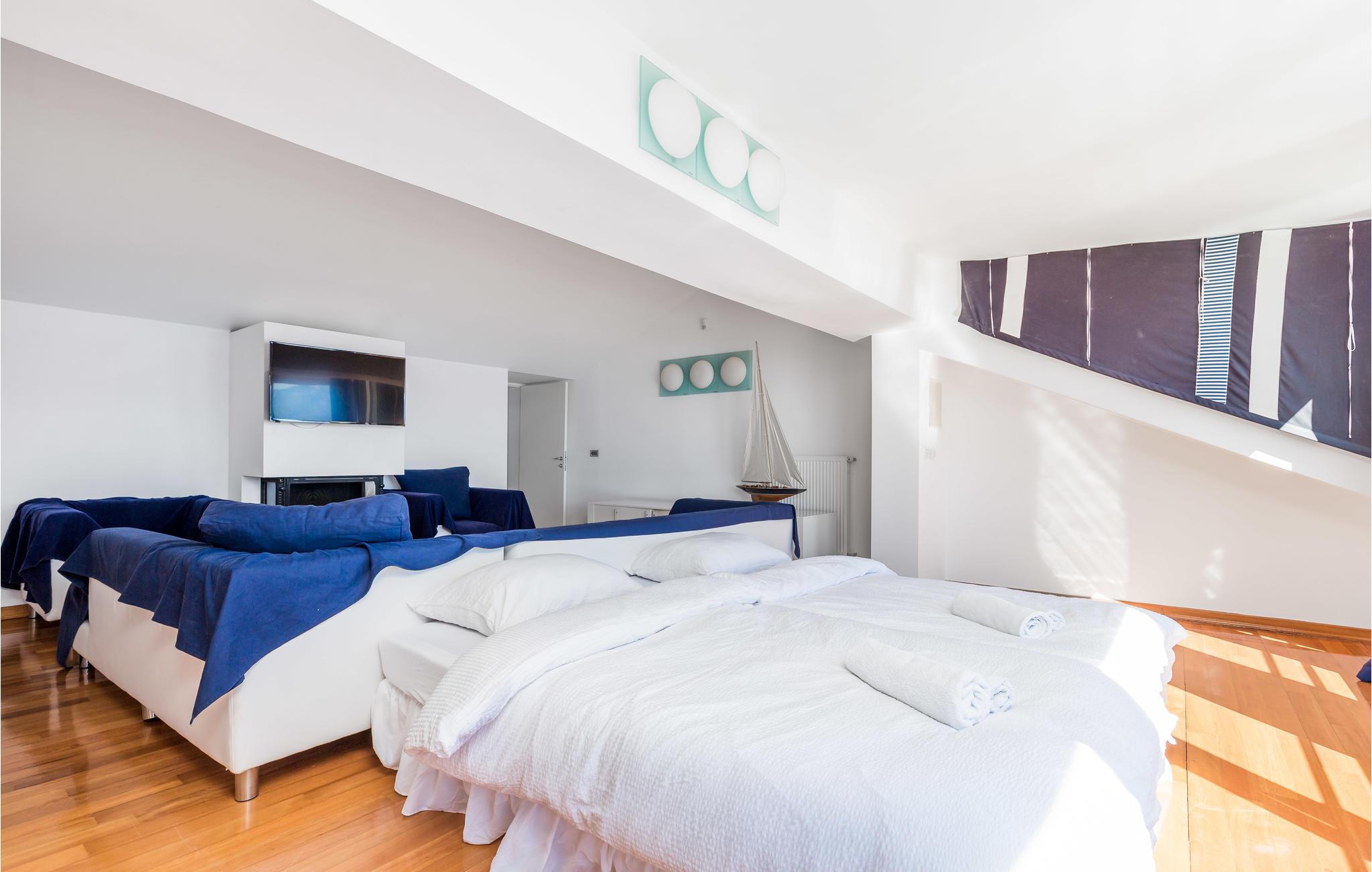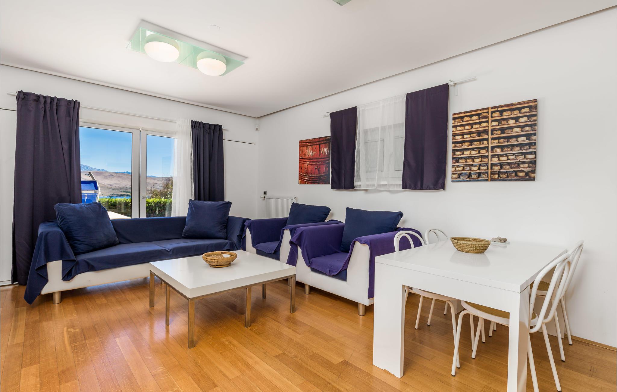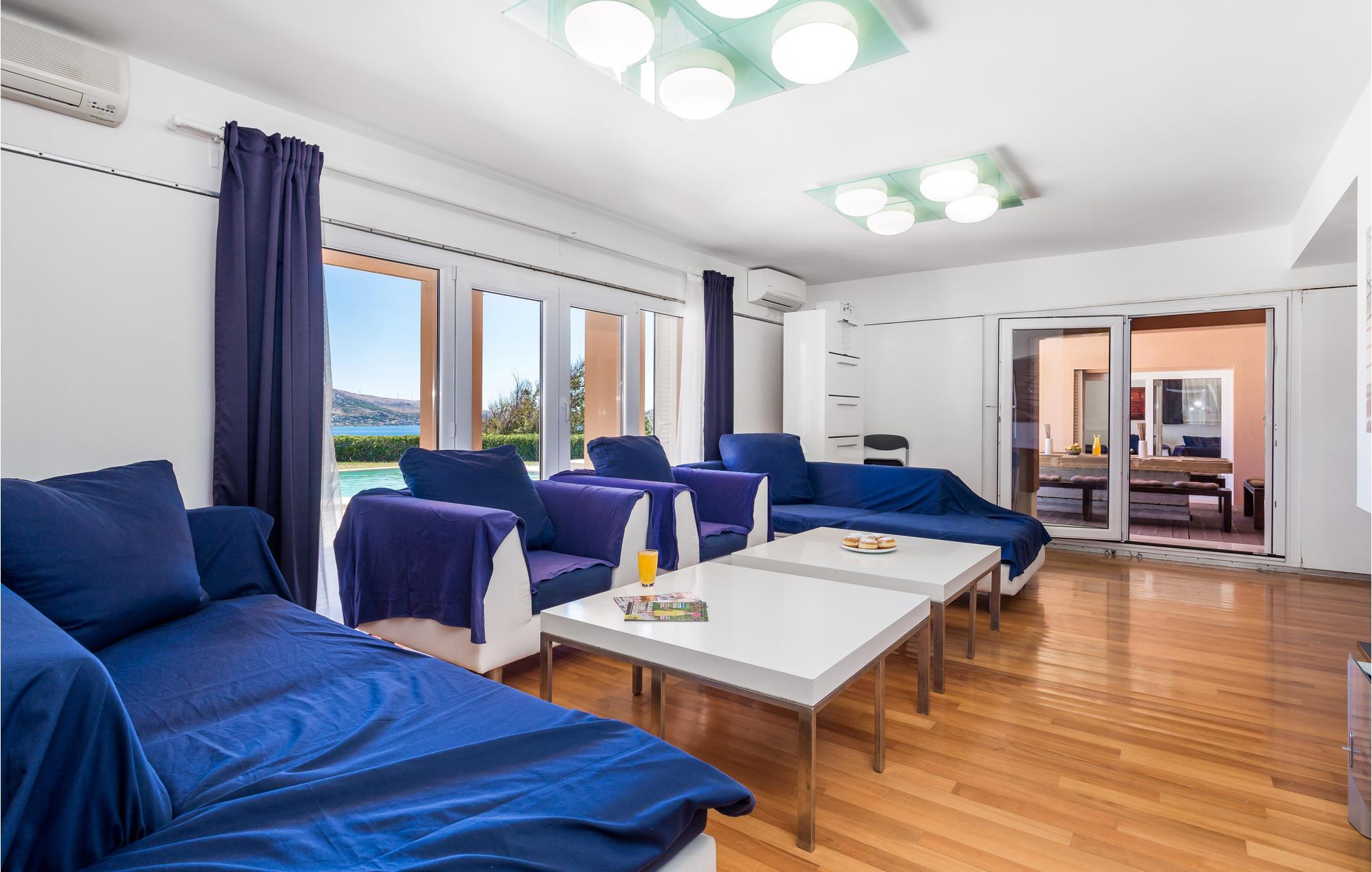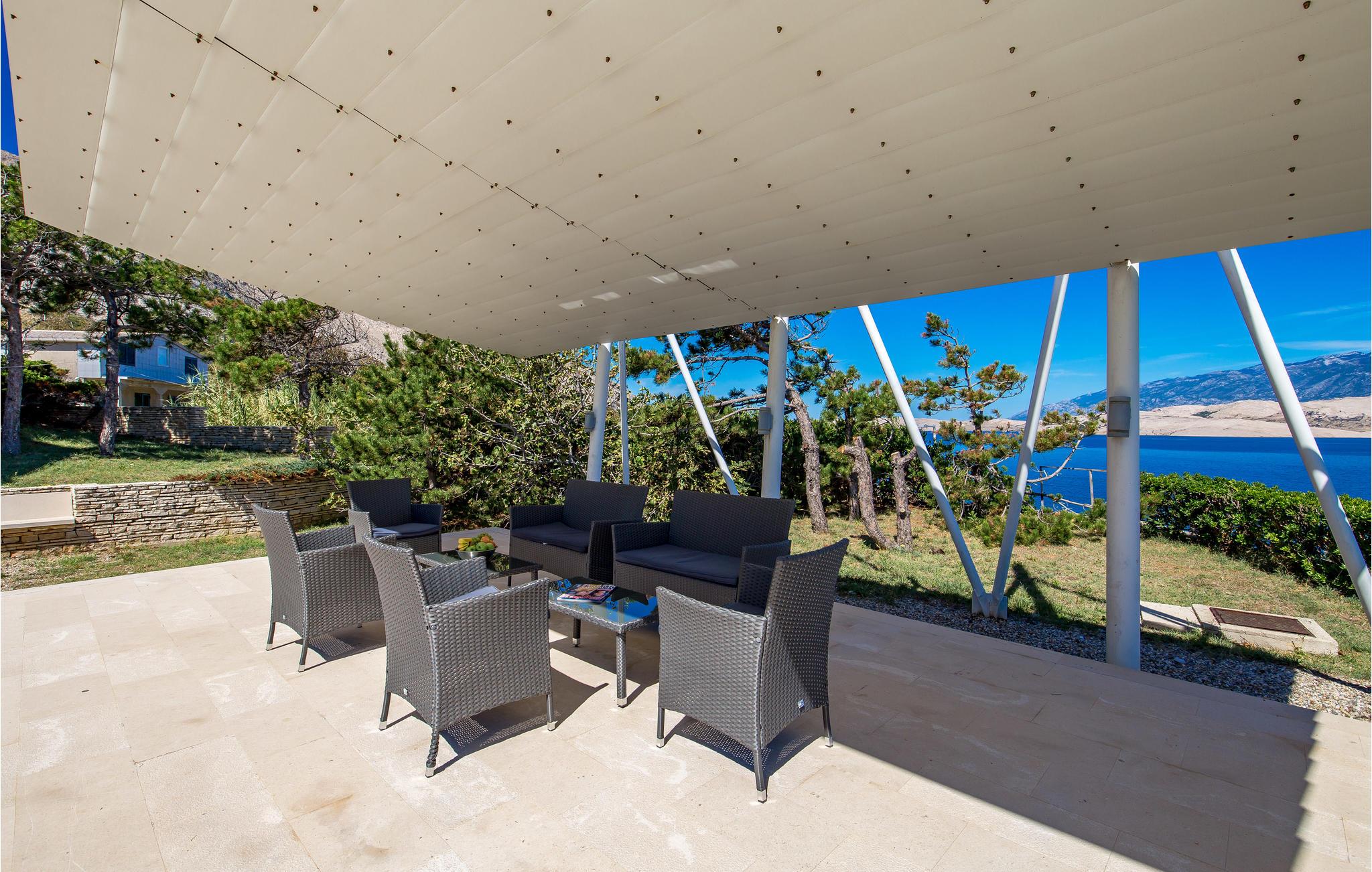 Unn deg en luksuriøs ferie og tilbring årets beste dager i dette drømmehuset med rolig beliggenhet. Allerede i første etasje vil du bli ønsket velkommen av koselige og stilfullt innredede rom. Her finner du den store stuen med det meget godt utstyrte kjøkkenet og spiseplassen samt et bad. I det sentrale området i første etasje er det en stor, overbygd terrasse, et bad og en annen, mindre stue. Fra begge stuene har du flott utsikt over havet, og her er du bare atskilt fra bassengterrassen med skyvedører. I første etasje er det soverom og ytterligere to bad. Soverom 2, 3 og 4 har overbygde terrasser. I 2. etasje er soverom 5, hvorav den ene veggen er en glassfasade og tilbyr derfor en fantastisk utsikt over byen Pag og Velebit-kanalen. Rundt bassenget er det terrasser hvor du kan sole deg. Når det blir for varmt for deg, kan du nyte en kjølig drink i skyggen av paviljongen og utsikten over Velebit-fjellmassivet. På kveldstid er bassenget opplyst og skaper en romantisk atmosfære. Barn kan leke bekymringsløst på den inngjerdede eiendommen. Stranden nedenfor huset er en steinstrand. Du kan imidlertid nå en vakker rullesteinstrand på få minutters gange. Byen Pag ligger bare ca 3 km unna. Her tilbys båtturer og dykkerkurs. Besøk de lokale restaurantene og ikke gå glipp av lam og den krydrede Pag-osten. Skråtak med en minimumshøyde på 1,20 m.