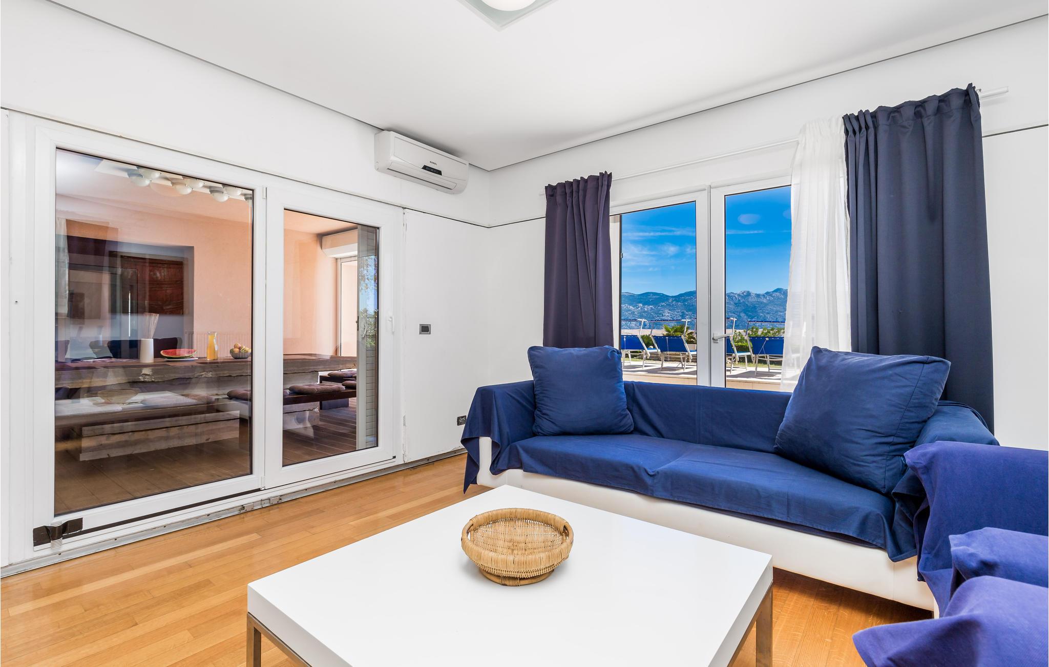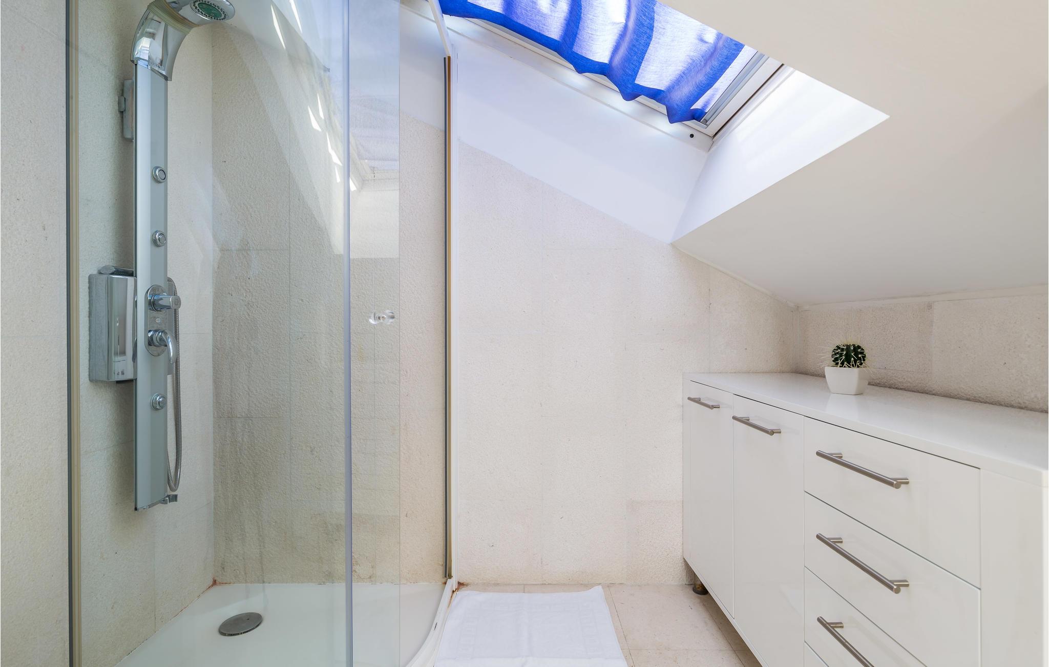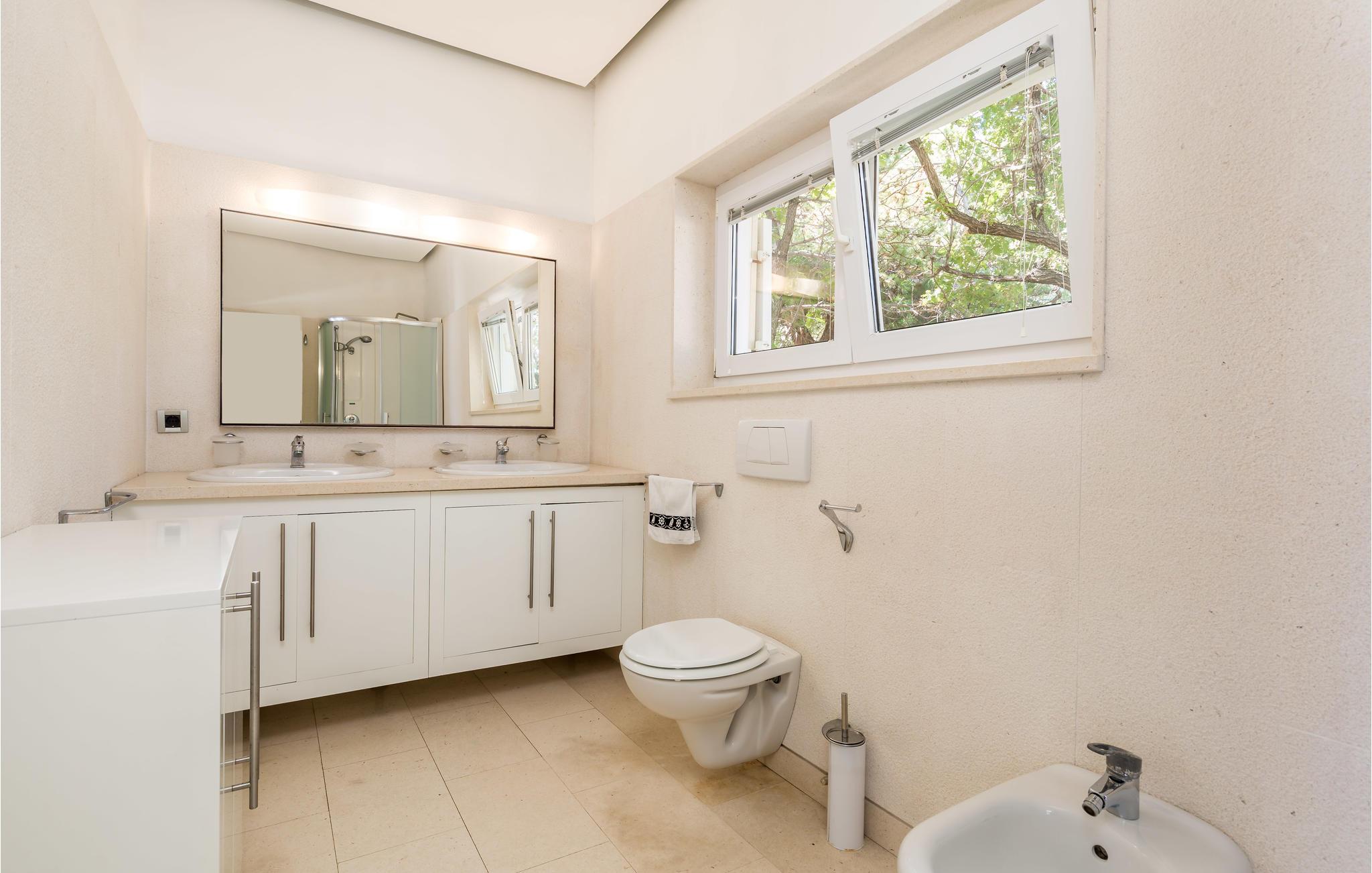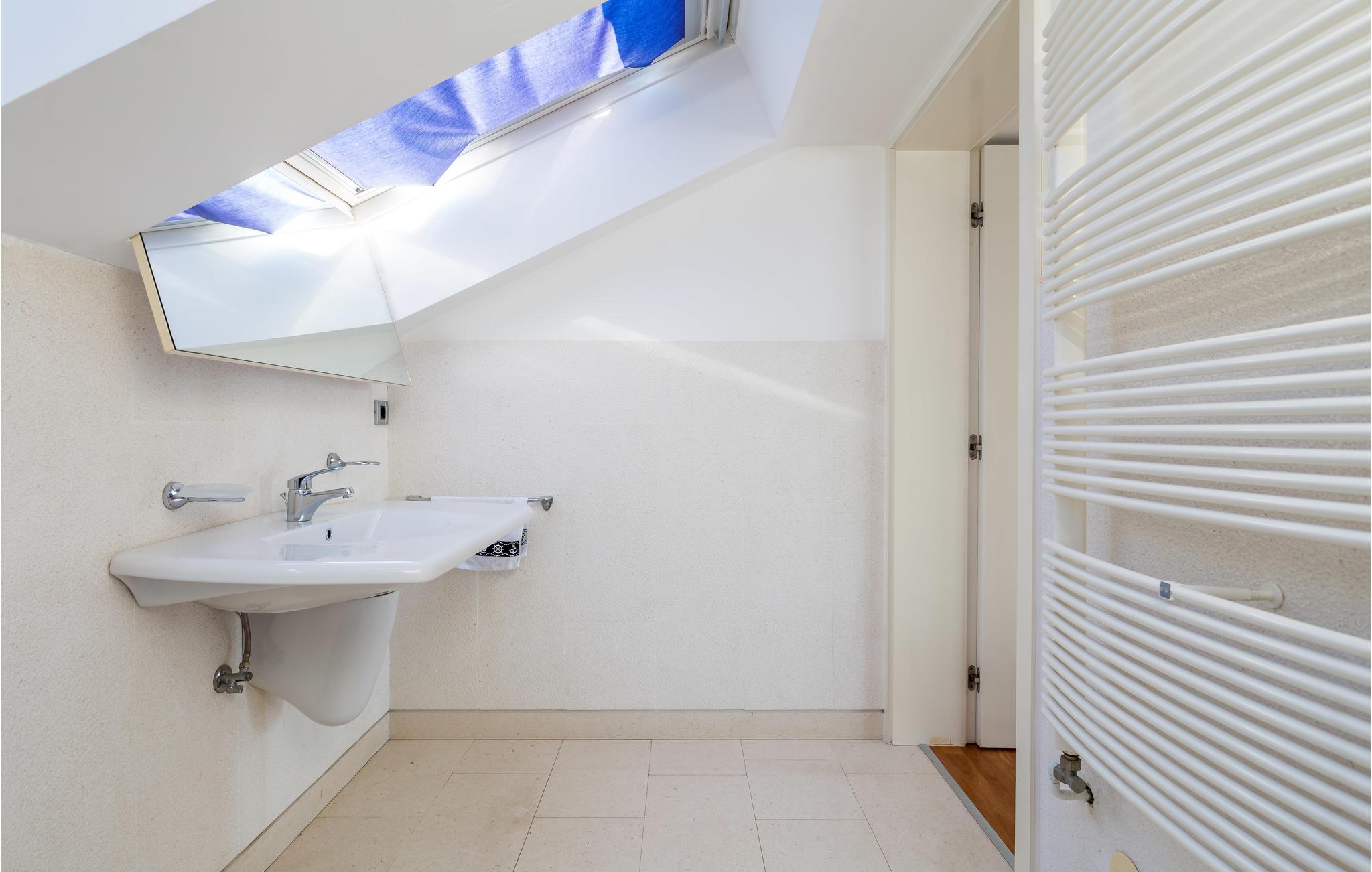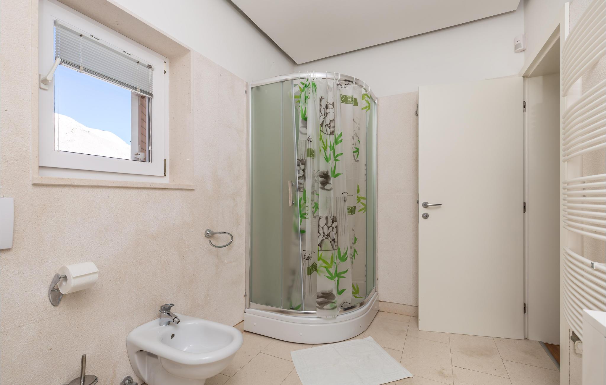 Unn deg en luksuriøs ferie og tilbring årets beste dager i dette drømmehuset med rolig beliggenhet. Allerede i første etasje vil du bli ønsket velkommen av koselige og stilfullt innredede rom. Her finner du den store stuen med det meget godt utstyrte kjøkkenet og spiseplassen samt et bad. I det sentrale området i første etasje er det en stor, overbygd terrasse, et bad og en annen, mindre stue. Fra begge stuene har du flott utsikt over havet, og her er du bare atskilt fra bassengterrassen med skyvedører. I første etasje er det soverom og ytterligere to bad. Soverom 2, 3 og 4 har overbygde terrasser. I 2. etasje er soverom 5, hvorav den ene veggen er en glassfasade og tilbyr derfor en fantastisk utsikt over byen Pag og Velebit-kanalen. Rundt bassenget er det terrasser hvor du kan sole deg. Når det blir for varmt for deg, kan du nyte en kjølig drink i skyggen av paviljongen og utsikten over Velebit-fjellmassivet. På kveldstid er bassenget opplyst og skaper en romantisk atmosfære. Barn kan leke bekymringsløst på den inngjerdede eiendommen. Stranden nedenfor huset er en steinstrand. Du kan imidlertid nå en vakker rullesteinstrand på få minutters gange. Byen Pag ligger bare ca 3 km unna. Her tilbys båtturer og dykkerkurs. Besøk de lokale restaurantene og ikke gå glipp av lam og den krydrede Pag-osten. Skråtak med en minimumshøyde på 1,20 m.