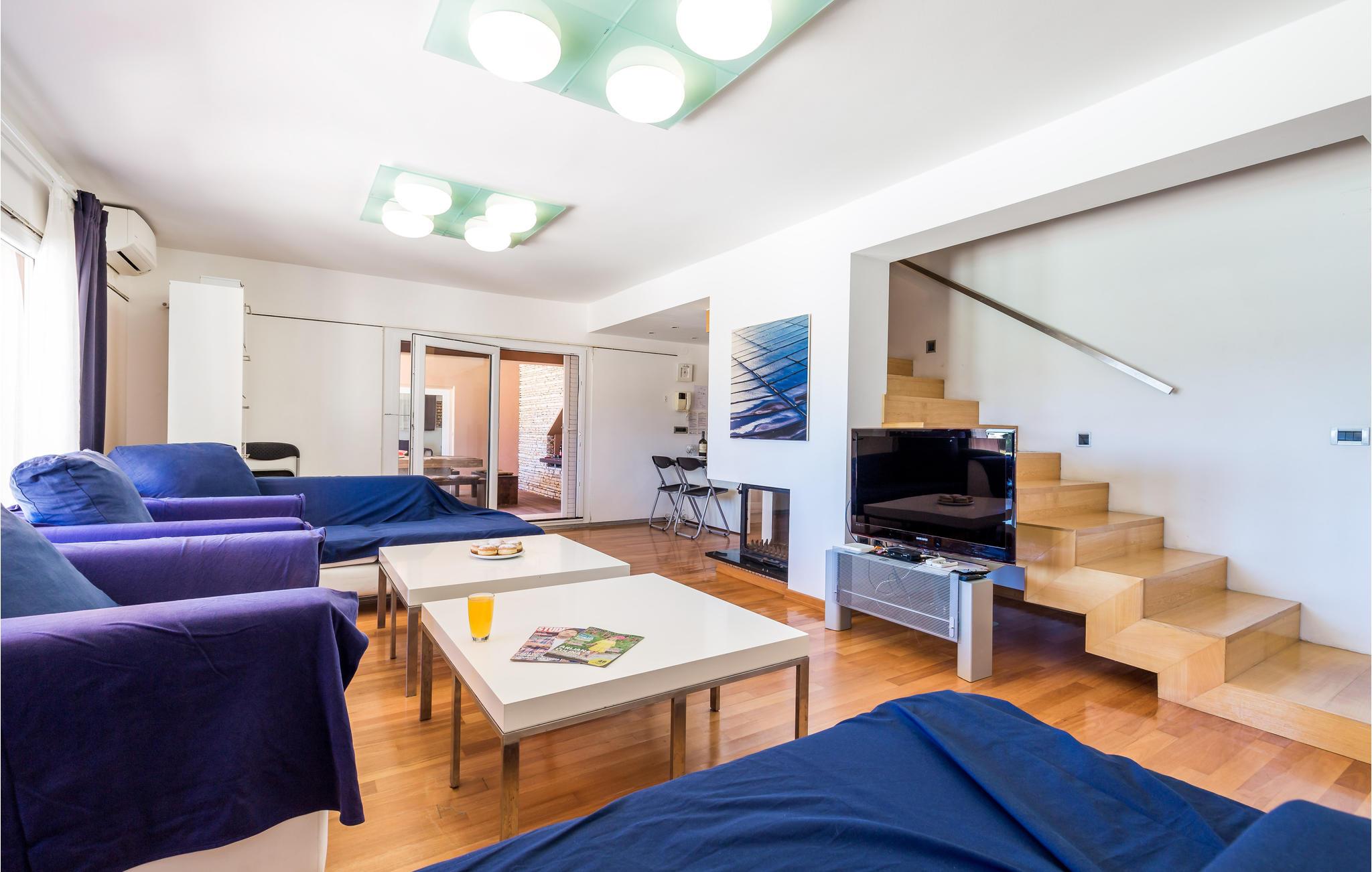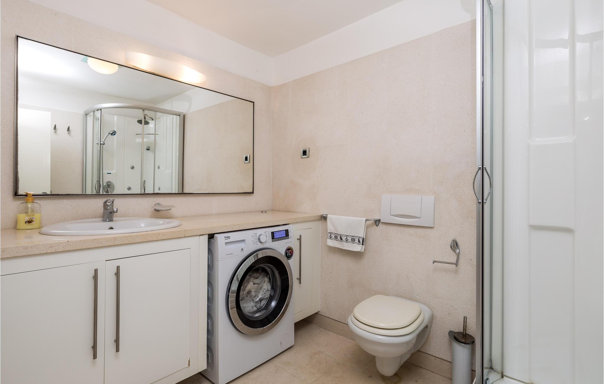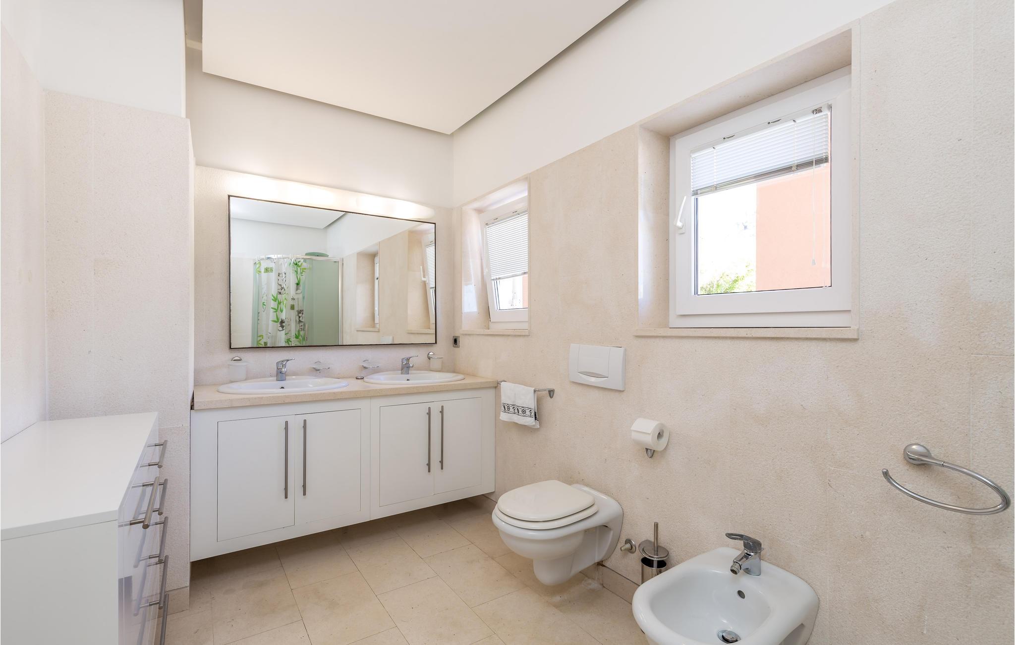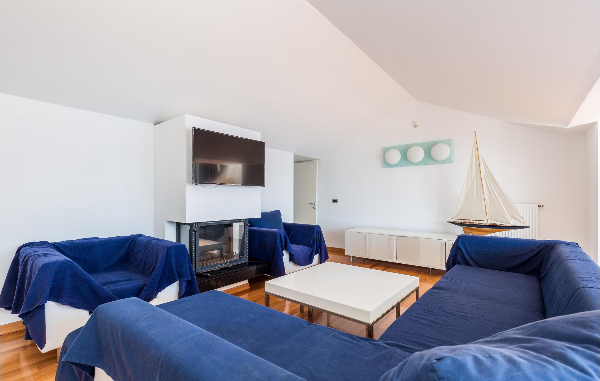 Unn deg en luksuriøs ferie og tilbring årets beste dager i dette drømmehuset med rolig beliggenhet. Allerede i første etasje vil du bli ønsket velkommen av koselige og stilfullt innredede rom. Her finner du den store stuen med det meget godt utstyrte kjøkkenet og spiseplassen samt et bad. I det sentrale området i første etasje er det en stor, overbygd terrasse, et bad og en annen, mindre stue. Fra begge stuene har du flott utsikt over havet, og her er du bare atskilt fra bassengterrassen med skyvedører. I første etasje er det soverom og ytterligere to bad. Soverom 2, 3 og 4 har overbygde terrasser. I 2. etasje er soverom 5, hvorav den ene veggen er en glassfasade og tilbyr derfor en fantastisk utsikt over byen Pag og Velebit-kanalen. Rundt bassenget er det terrasser hvor du kan sole deg. Når det blir for varmt for deg, kan du nyte en kjølig drink i skyggen av paviljongen og utsikten over Velebit-fjellmassivet. På kveldstid er bassenget opplyst og skaper en romantisk atmosfære. Barn kan leke bekymringsløst på den inngjerdede eiendommen. Stranden nedenfor huset er en steinstrand. Du kan imidlertid nå en vakker rullesteinstrand på få minutters gange. Byen Pag ligger bare ca 3 km unna. Her tilbys båtturer og dykkerkurs. Besøk de lokale restaurantene og ikke gå glipp av lam og den krydrede Pag-osten. Skråtak med en minimumshøyde på 1,20 m.