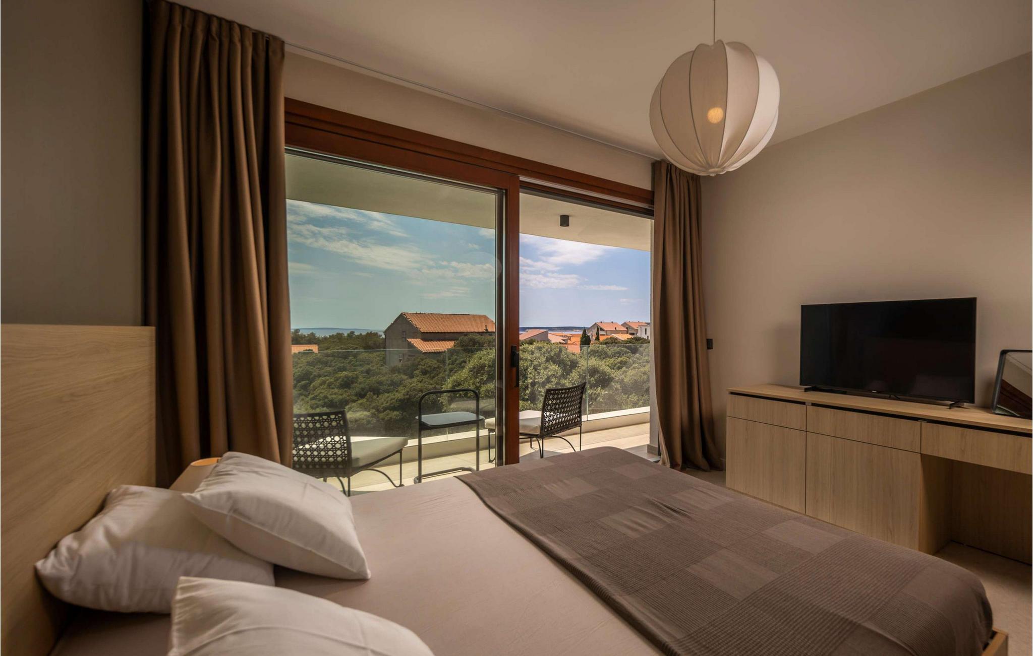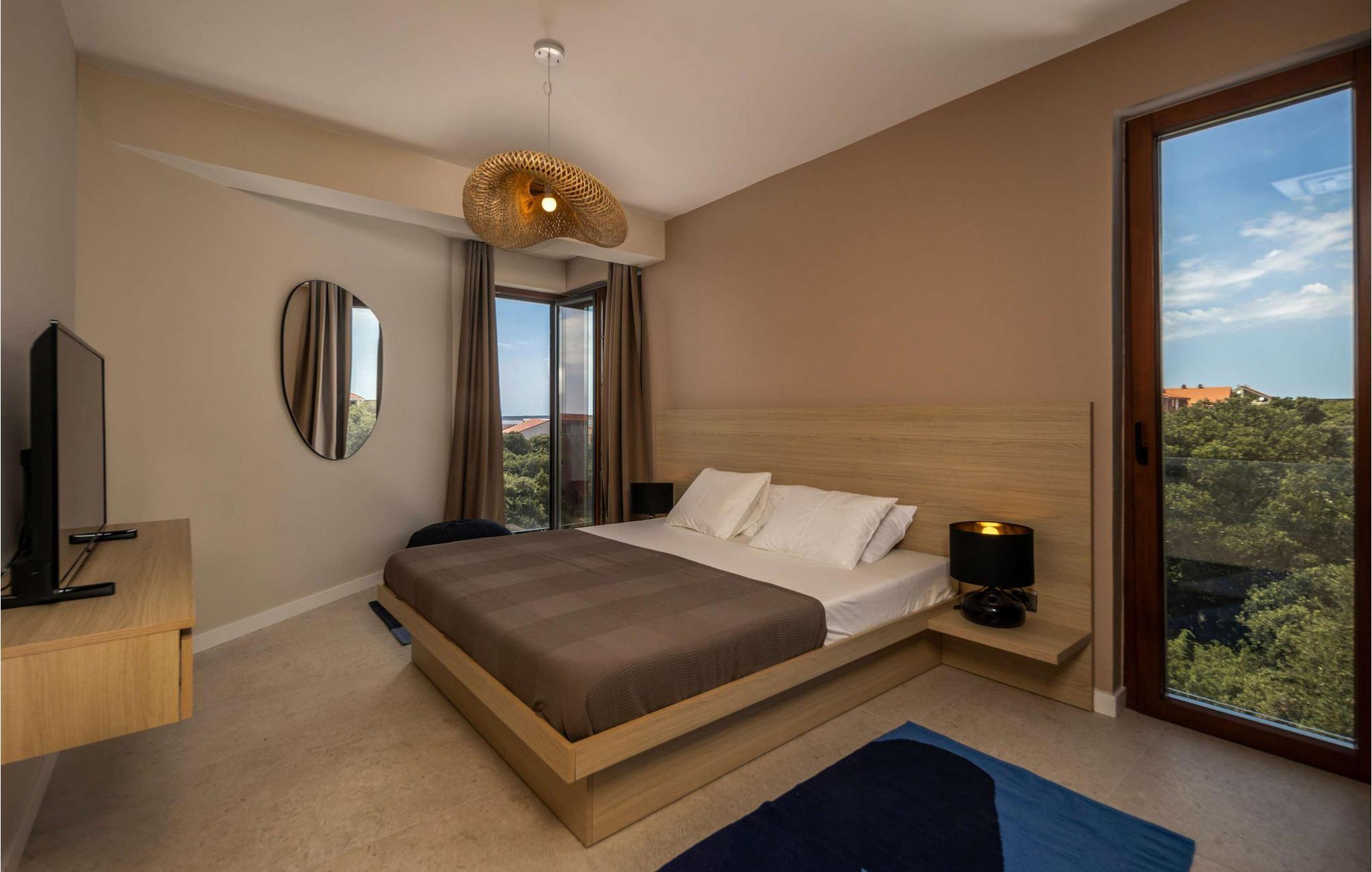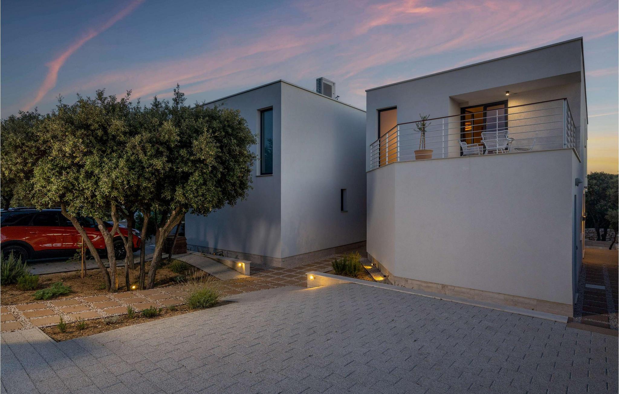 Villa Terakota Mandre ligger på sørsiden av øya Pag, ca. 10 km fra den berømte stranden Zr?e, i byen Mandre. Den vakre utsikten over øyene Silba og Olib og de nærliggende øyene Maun og ?krda, det klare havet og de rene strendene tiltrekker seg besøkende som ønsker å tilbringe en fredelig ferie i naturlige omgivelser. Hvis du ønsker å flykte fra hverdagens kjas og mas og slappe av i selskap med familie og venner, er dette stedet for deg! Villa Terakota Mandre ble bygget i 2022 i en moderne arkitektonisk stil og tilbyr 160 m2 boareal, mens eiendommens totale areal er 450 m2. Ved siden av Villa Terakota Mandre ligger Villa Oliva Mandre, som også kan bookes separat og gir deg absolutt privatliv under oppholdet. Villa Terakota Mandre har plass til maksimalt 8 personer, og det optimale antallet gjester er 6. Villaen har aircondition og består av en første etasje og en overetasje. I første etasje er det en stue med sofa, lenestol, et lite bord og TV, og i det moderne utstyrte kjøkkenet og spisestuen med bord til 8 personer kan du tilberede og nyte deilige måltider. Ovenpå bor du komfortabelt i 3 soverom med dobbeltsenger og to bad, hvorav det ene har badekar og det andre eget bad med dusjkabinett. Fra soverommene, terrassen og kjøkkenet kan du nyte utsikten over det rene og klare Adriaterhavet. På utendørsterrassen er det et oppvarmet svømmebasseng på 32 m2 og med en dybde på 1,2 ? 1,8 m. Du kan sole deg på 4 solsenger og tilberede måltidene dine ikke bare i villaen, men også på terrassen, der det er en utendørs kull- eller vedgrill. Om kveldene kan du selvfølgelig også sette deg til rette på terrassen i utesofaen eller ved det utendørs spisebordet med 6 sitteplasser. Andre fasiliteter inkluderer vaskemaskin, tørketrommel og strykejern, samt et separat toalett. Hvis du skal ha med deg barn på ferie, er det både matbrett og barneseng tilgjengelig. Sofaen i stuen kan brukes som ekstraseng for to personer. Gårdsplassen til Villa Terakota Mandre er fullstendig inngjerdet og har 2 private parkeringsplasser. Barna har god plass til å leke og ha det gøy, og det er også en vakkert anlagt hage og mye grønt på gårdsplassen. Restauranter og kafeer langs kysten, jevnlige temaarrangementer som fiskefestivaler og vertskapets gjestfrihet bidrar til å gjøre din og familiens ferie i Mandre fredelig og romantisk. I en liten bukt i sentrum av Mandri ligger stranden Mala Mandra, som har hatt Blått flagg siden 2006. Denne unike stein- og rullesteinstranden er egnet for både barn og funksjonshemmede på grunn av den gode tilgangen til sjøen. Unn deg selv en drømmeferie og nyt oppholdet på Villa Terakota Mandre! Velkommen til Villa Terakota Mandre! Kjæledyr er tillatt på dette overnattingsstedet etter eierens skjønn eller mot en avgift.