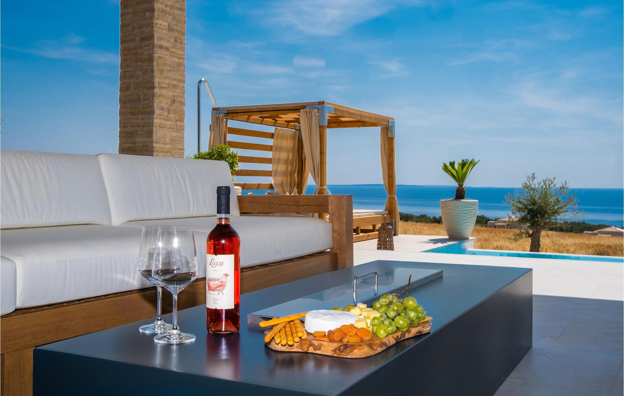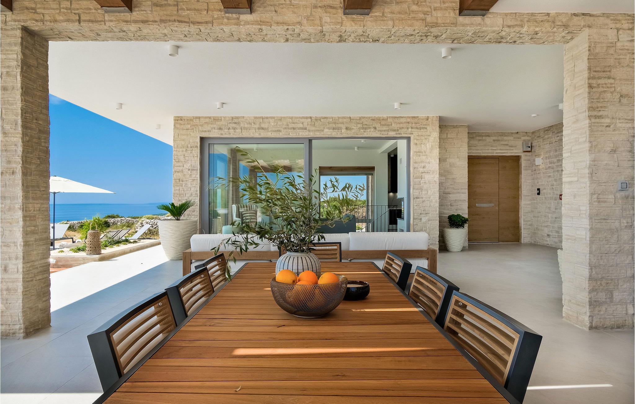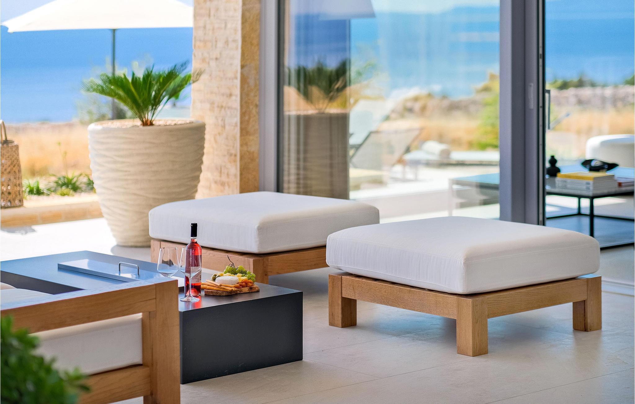 Ikke bare interiøret, men også uteområdet gjør et overbevisende inntrykk. Ta en svømmetur i bassenget om morgenen og tilbring avslappende timer i loungemøblene eller på solsengene under parasollen om dagen. Dra nytte av det vakre utekjøkkenet og tilbring mange hyggelige timer i spisestuen med havet som bakteppe. For en stemningsfull avslutning på dagen er det utendørs boblebadet det perfekte stedet.
