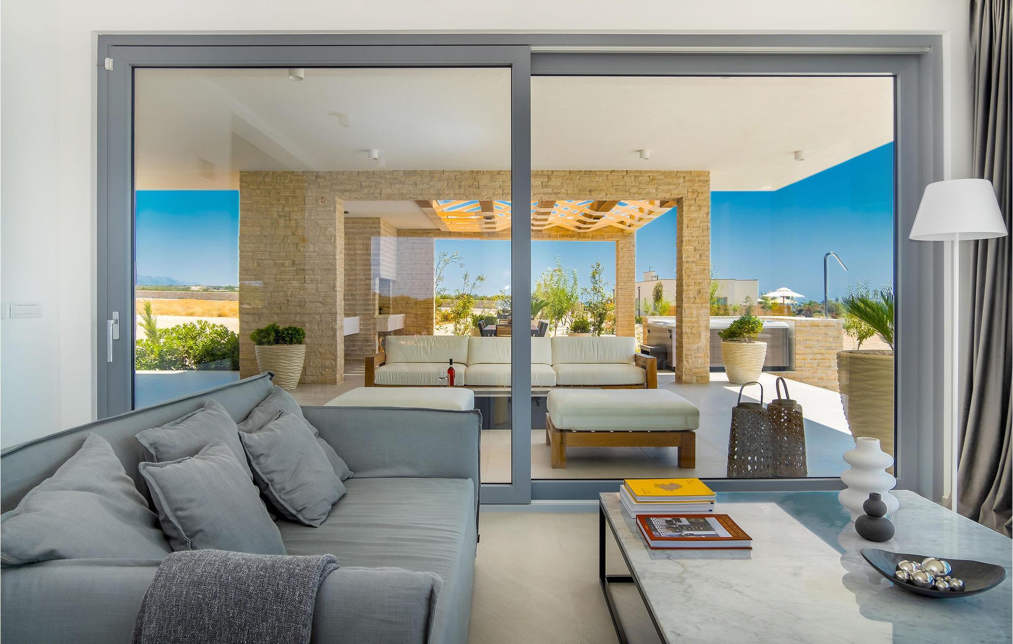 Ikke bare interiøret, men også uteområdet gjør et overbevisende inntrykk. Ta en svømmetur i bassenget om morgenen og tilbring avslappende timer i loungemøblene eller på solsengene under parasollen om dagen. Dra nytte av det vakre utekjøkkenet og tilbring mange hyggelige timer i spisestuen med havet som bakteppe. For en stemningsfull avslutning på dagen er det utendørs boblebadet det perfekte stedet.