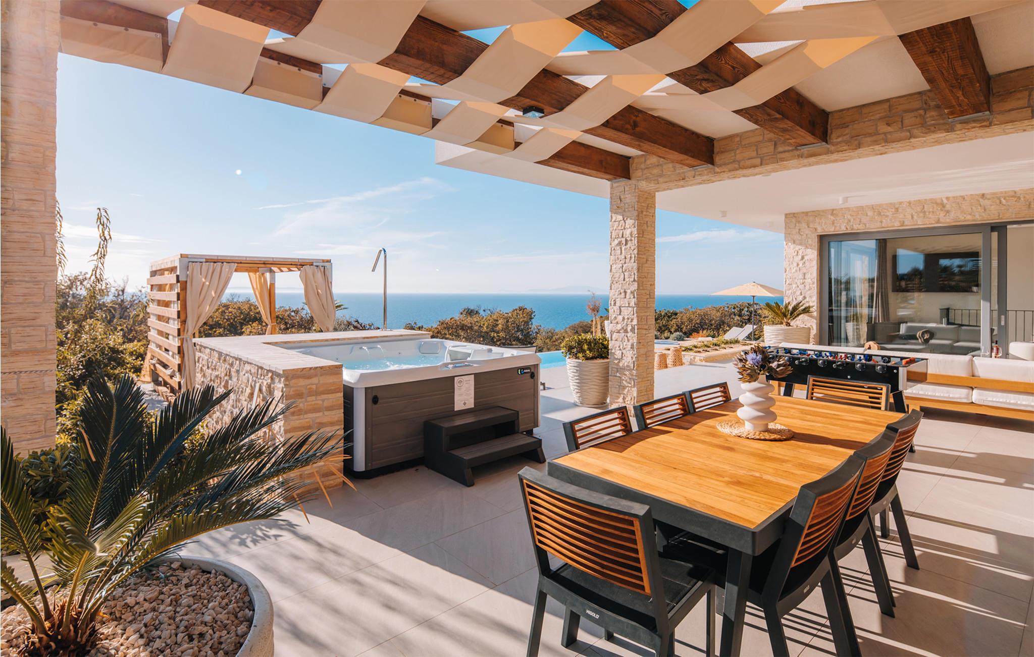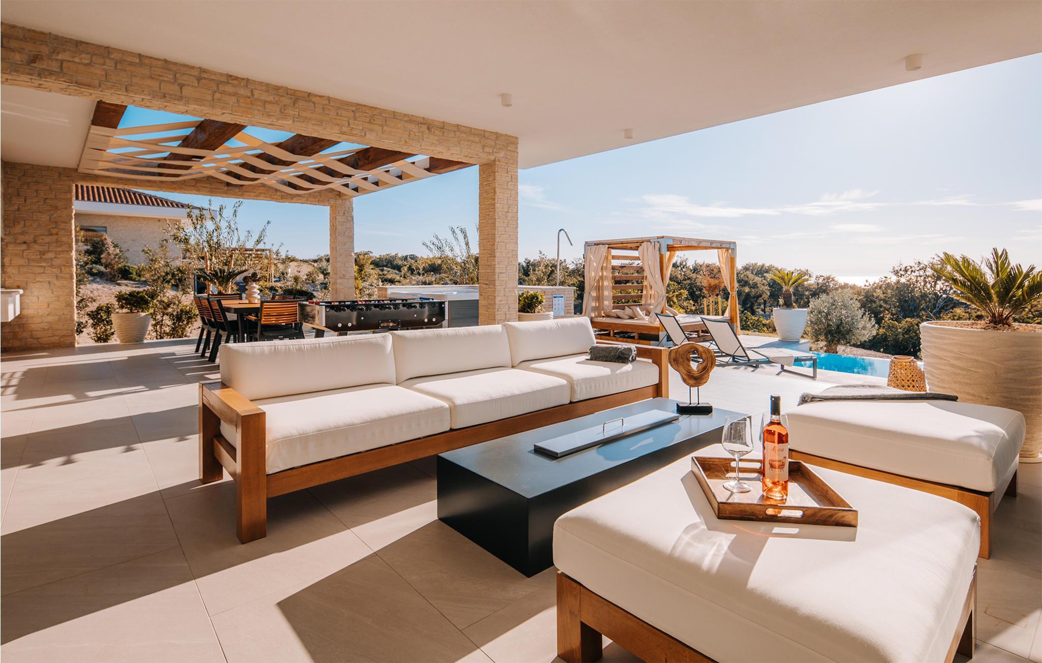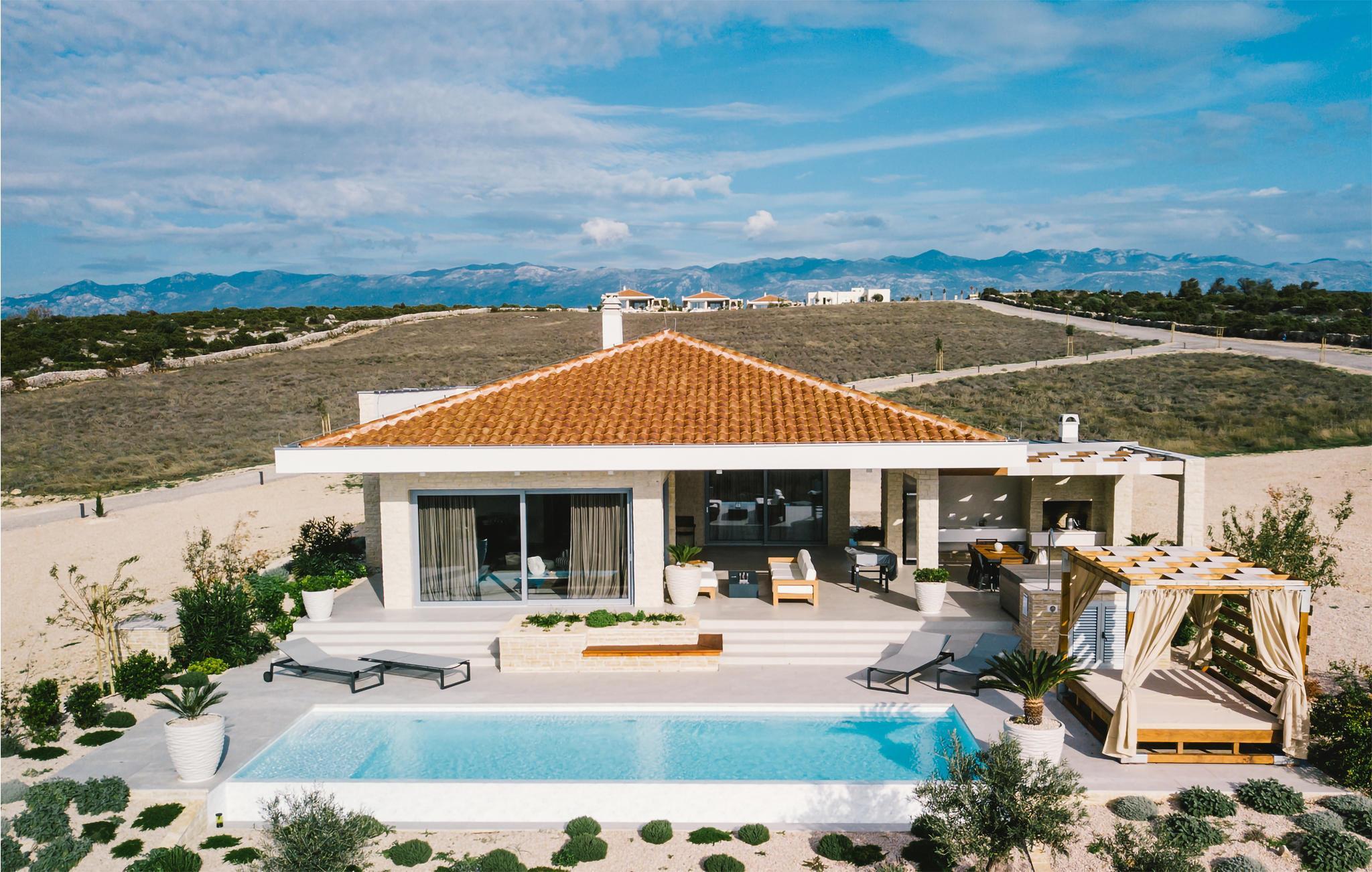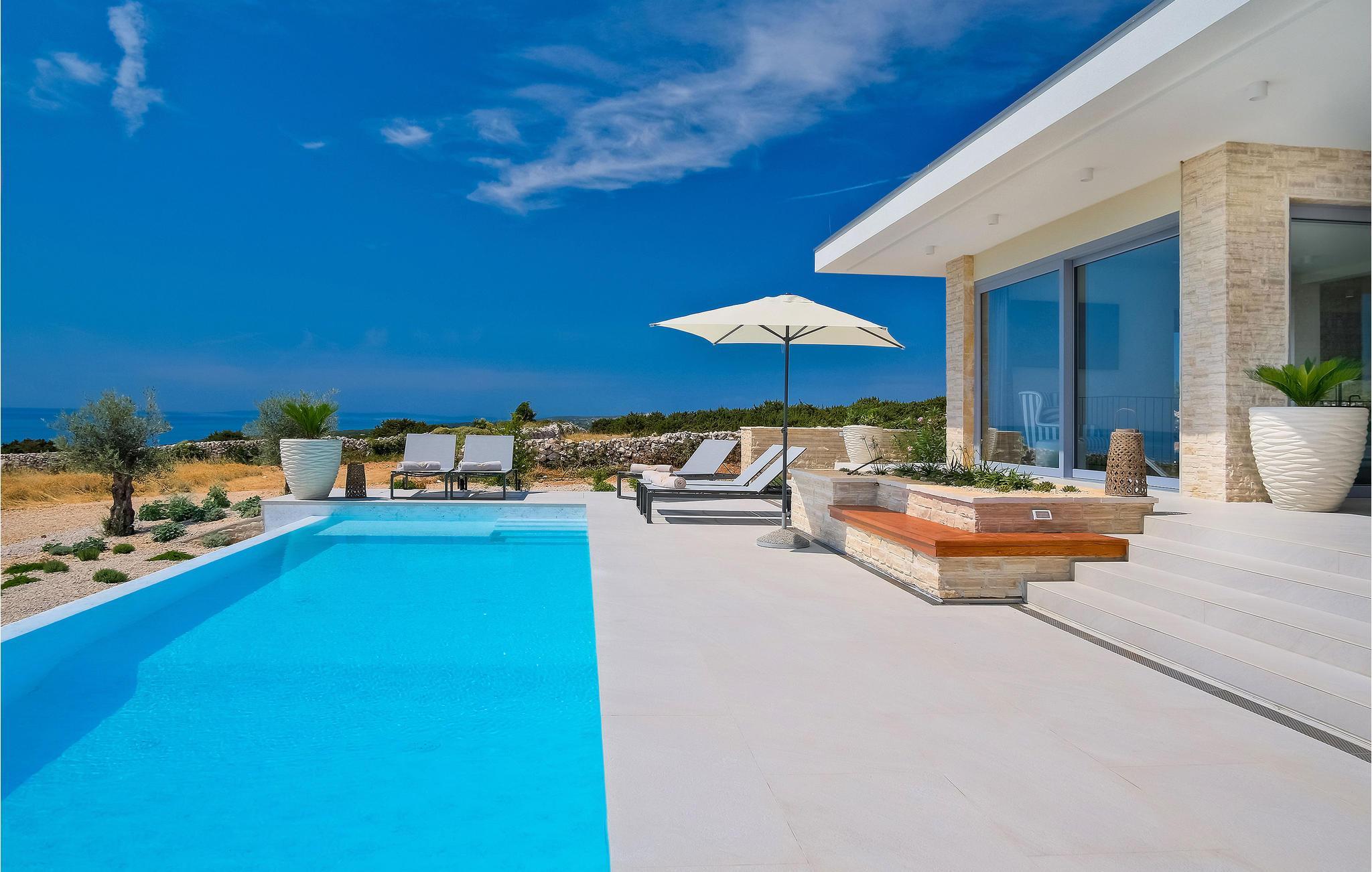 På øya Pag ønsker dette praktfulle huset deg velkommen i en drømmeaktig beliggenhet. Innvendig finner du møblerte rom av høy kvalitet som gir et veldig stilig inntrykk. Overalt imponerer huset med gjennomtenkte løsninger og materialer av høy kvalitet. Tilbered delikatessene dine i det tiltalende kjøkkenet med utsikt over omgivelsene eller slapp av i sofaen med ferielesningen din, hvorfra du kan nyte en vakker utsikt over omgivelsene, og bare noen få skritt skiller deg fra et dykk i utendørsbassenget. Aktivitetsrommet inviterer deg til å spille biljard, og hvis du foretrekker å se på, kan du sette deg godt til rette i sofaen med en avkjølt drink etter eget valg.