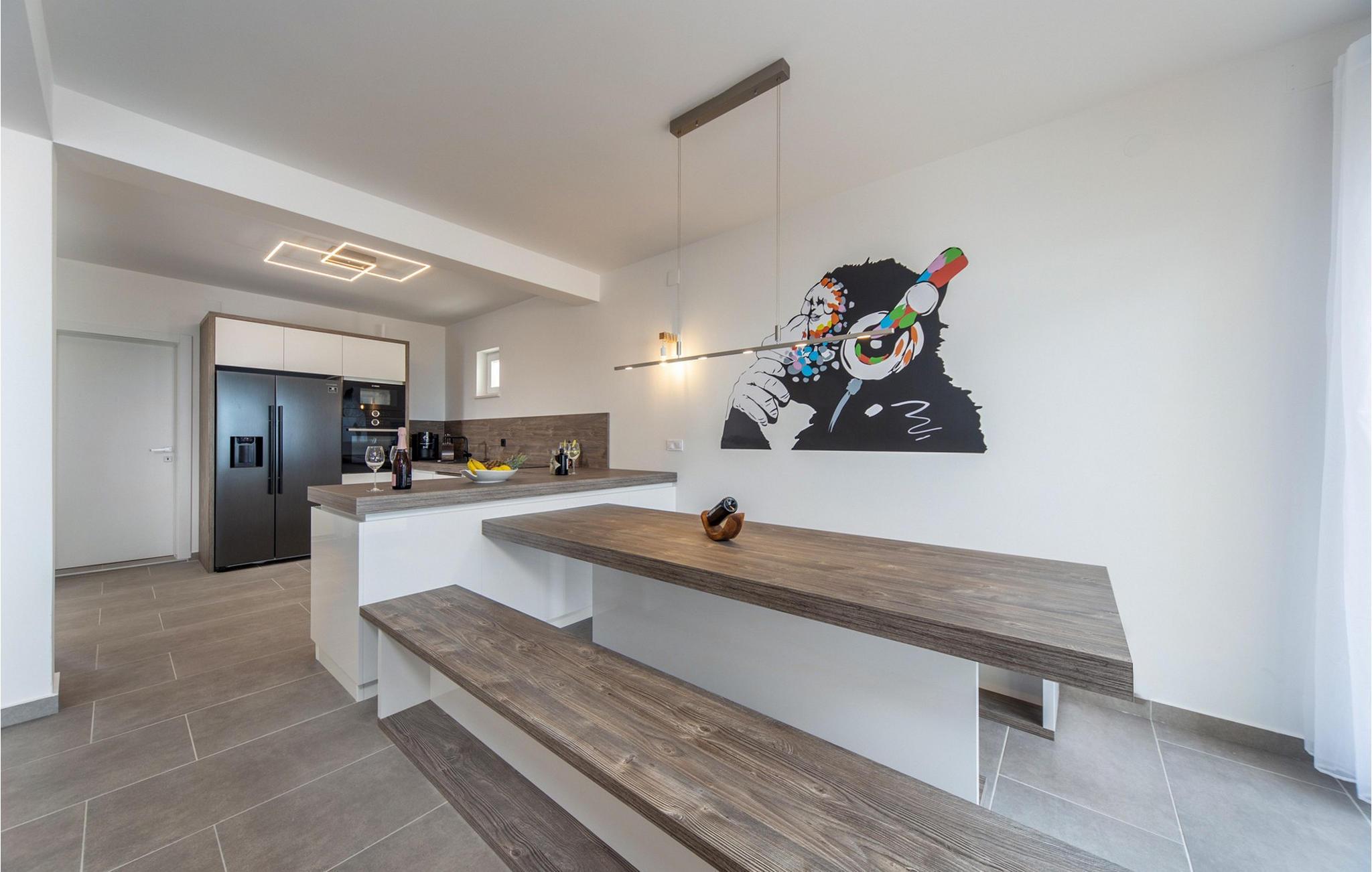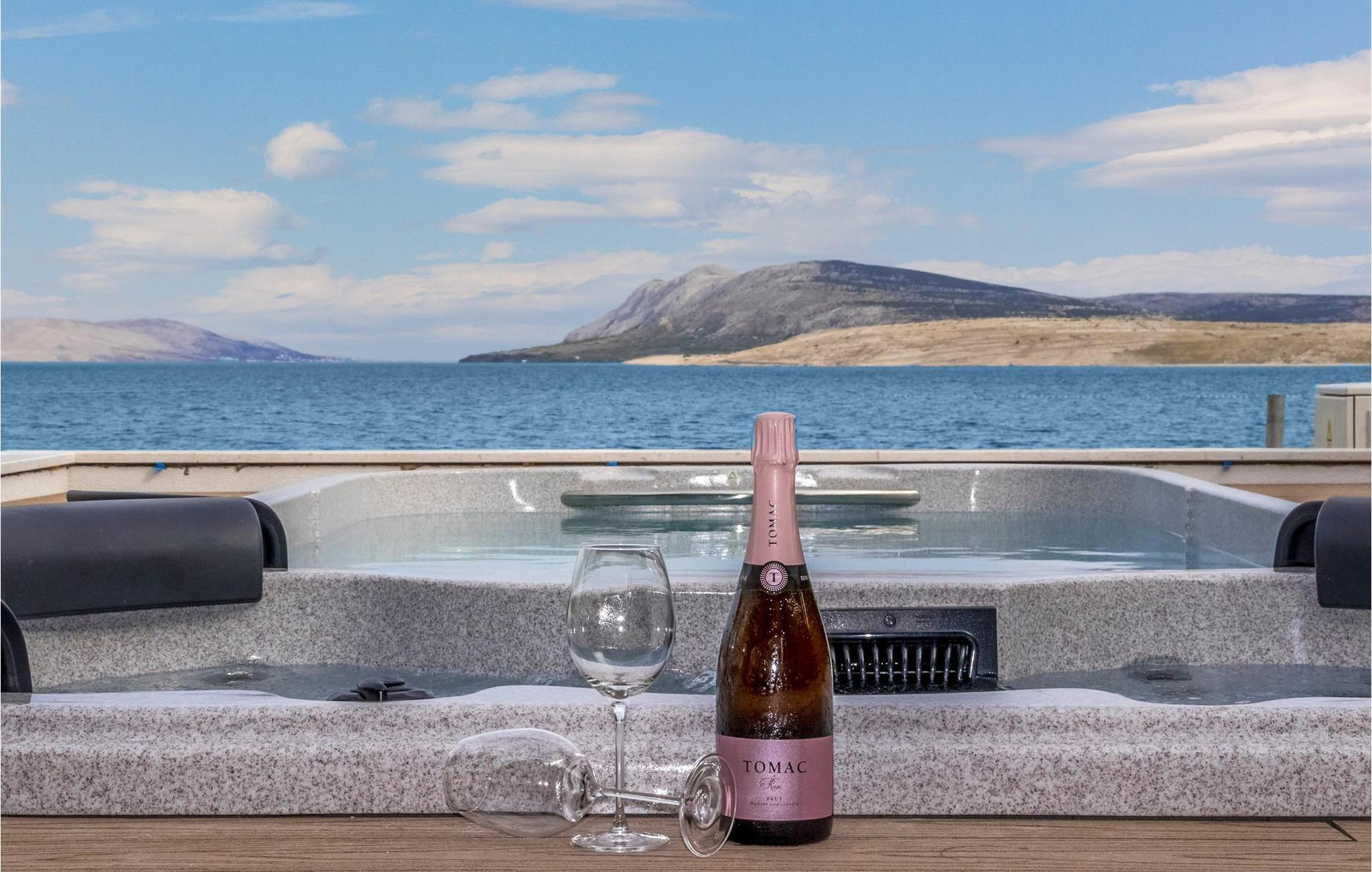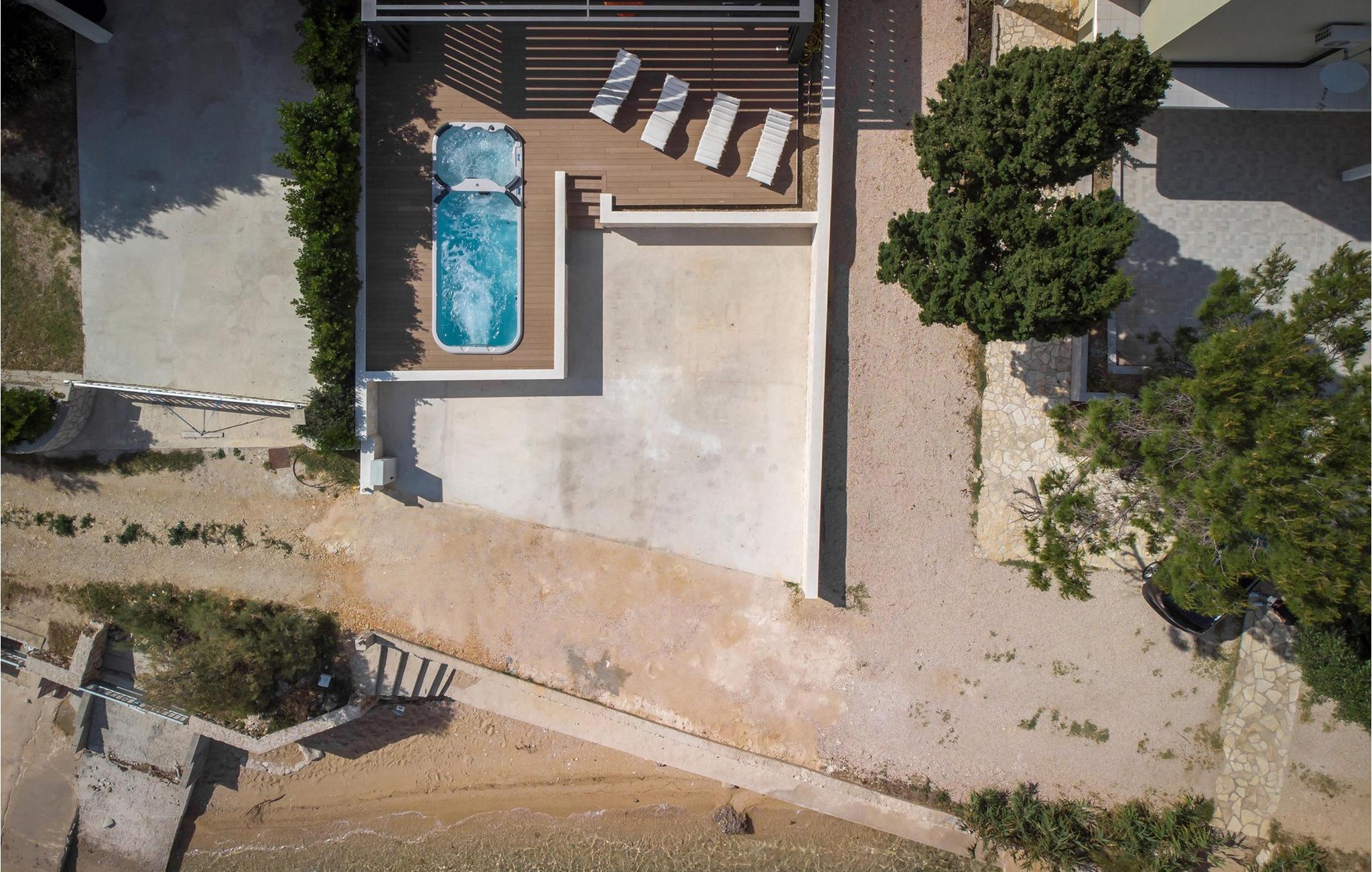 Villa Fux Zr?e er en nybygd, moderne villa som ligger i den eventyrlige bukten Caska, bare 2,5 km fra byen Novalja på øya Pag. Dette sjarmerende huset med et boareal på 230 m2 har plass til ti personer som kan regne med absolutt komfort og privatliv under oppholdet. Boarealet består av fem komfortable, klimatiserte soverom med dobbeltsenger, fem bad og et separat toalett. Villaens første etasje har et moderne og fullt utstyrt kjøkken, en romslig spisestue og en stue. På gårdsplassen til villaen, bare 6 meter fra den vakre stranden, er det et deilig boblebad og solsenger hvor du kan nyte utsikten over stjernehimmelen, det fantastiske blågrønne havet og det spesielle steinlandskapet på øya Pag. Det er også en utendørs grill, et utendørs spisebord, privat parkering, Wi-Fi og alle husholdningsartikler du trenger under oppholdet. Beliggenheten til denne vakre villaen er et ideelt valg for unge mennesker som vil ha det gøy, ettersom den ligger i nærheten av den mest berømte kroatiske stranden Zr?e, også kalt det kroatiske Ibiza. Det som gjør Zr?e-stranden spesiell, i tillegg til det krystallklare havet og de hvite rullesteinene, er de mange strandklubbene der moroa aldri tar slutt. Hver sommer besøker de mest kjente navnene fra den elektroniske scenen dette stedet, som med rette regnes som en av verdens beste festdestinasjoner. Benytt oppholdet på Villa Fux Zr?e til å bli kjent med den vakre øya Pag, hvis spesialiteter det er vanskelig å liste opp. Pag-ost, olivenoljer, vin, salt, en rekke gastronomiske delikatesser, mesterverk av Pag-kniplinger og mange andre fantastiske attraksjoner avslører dette vakre området. Velkommen!