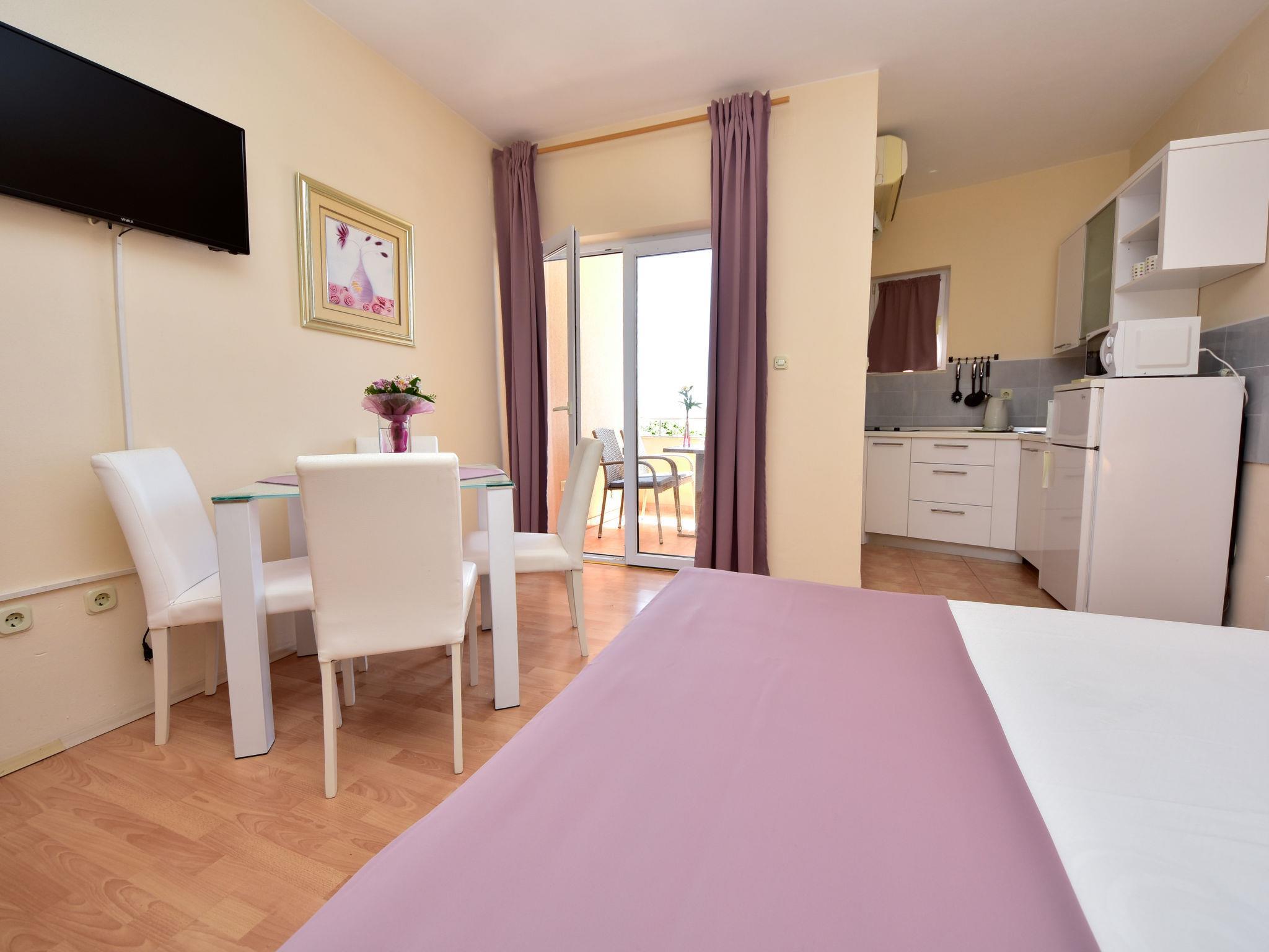 1-room apartment 27 m2, on the upper ground floor. 1 room with 1 x 2 bunk beds, 1 double bed (2 x 90 cm, length 200 cm), dining table, satellite TV and air conditioning. Exit to the terrace. Kitchenette (2 hot plates). Shower/WC. No heating option. Terrace 4 m2, roofed, south facing position. Terrace furniture. Beautiful view of the sea and the countryside. Facilities: iron, hair dryer. Internet (WiFi, free).