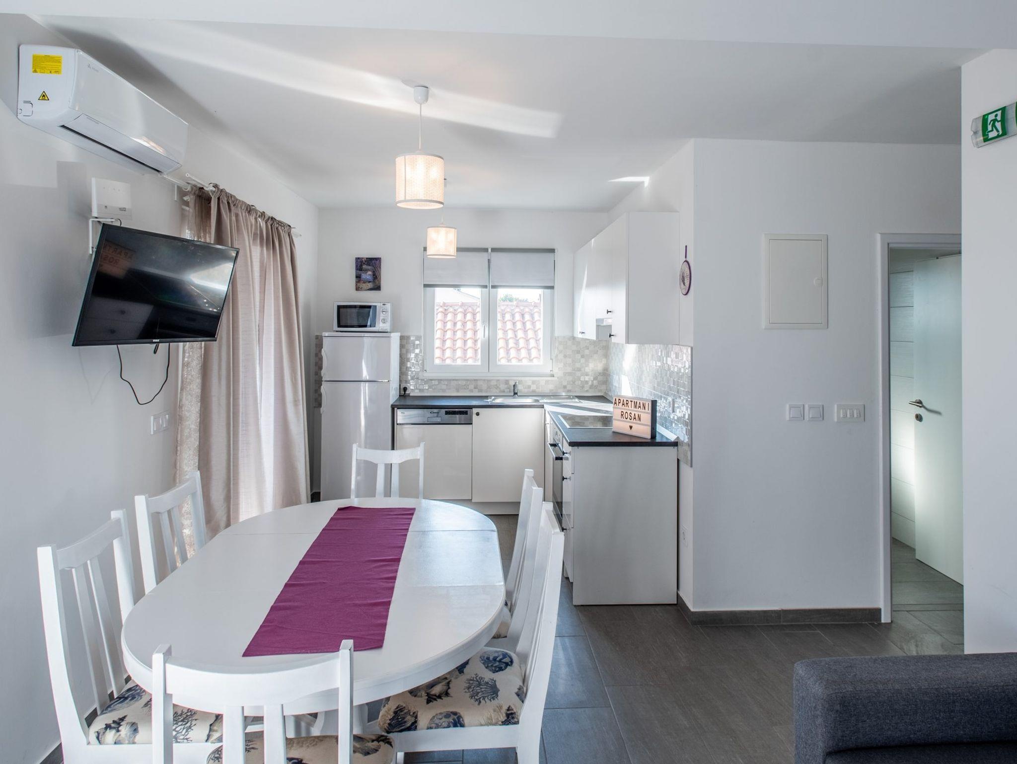Ferienwohnung bietet Platz für 6 Gäste. Die Betten sind in Schlafzimmern, die es 2 gibt, und in Wohnzimmer, innerhalb einer Gesamtfläche von 43m2, angeordnet. Die Gäste haben eine eigene Terrasse zur Verfügung, auf der sie in warmen Sommernächten genießen können. Das Apartment bietet Meerblick. Es ist erlaubt, Speisen auf dem Gemeinschafts-Grill vorzubereiten. IM PREIS INBEGRIFFEN: Kurtaxe, Endreinigung, Klimatisierung, Parkplatz, Internet, Kinderbett, Föhn. VERBINDLICHE ZUSÄTZLICHE KOSTEN: Aufzahlung für Kurzaufenthalte (prozentualer Zuschlag pro Nächtigungsanzahl: 30% - 1, 20% - 2, 10% - 3). Die Verfügbarkeit zusätzlicher Dienstleistungen in Ihrem reservierten Termin und die Preise derselben (falls nicht aufgeführt) müssen im Voraus überprüft werden. Zusätzliche Dienstleistungen die in der Zahlungsaufforderung nicht aufgeführt sind werden direkt beim Vermieter bezahlt, angenommen der Gast nutzt auch diese.