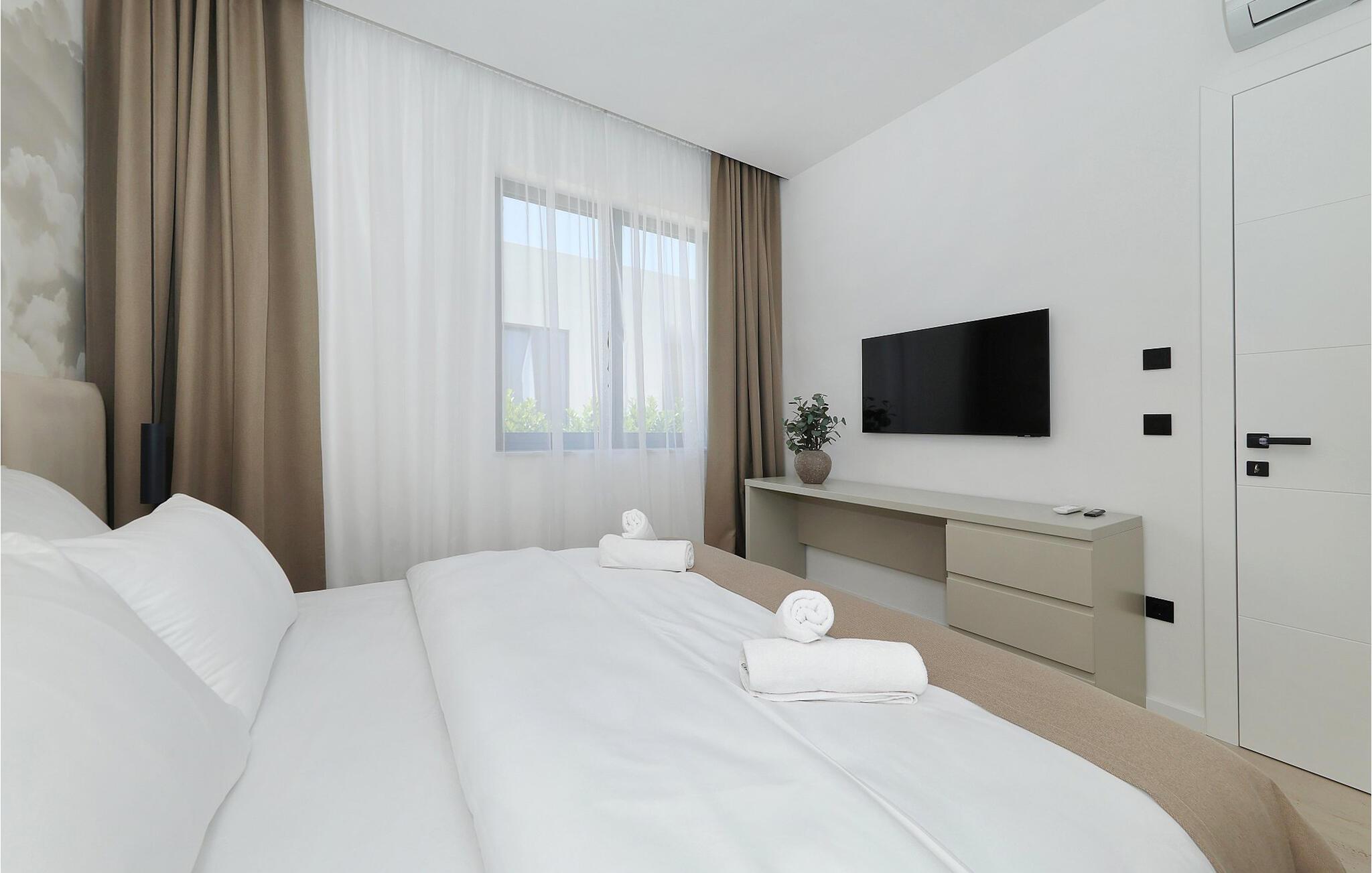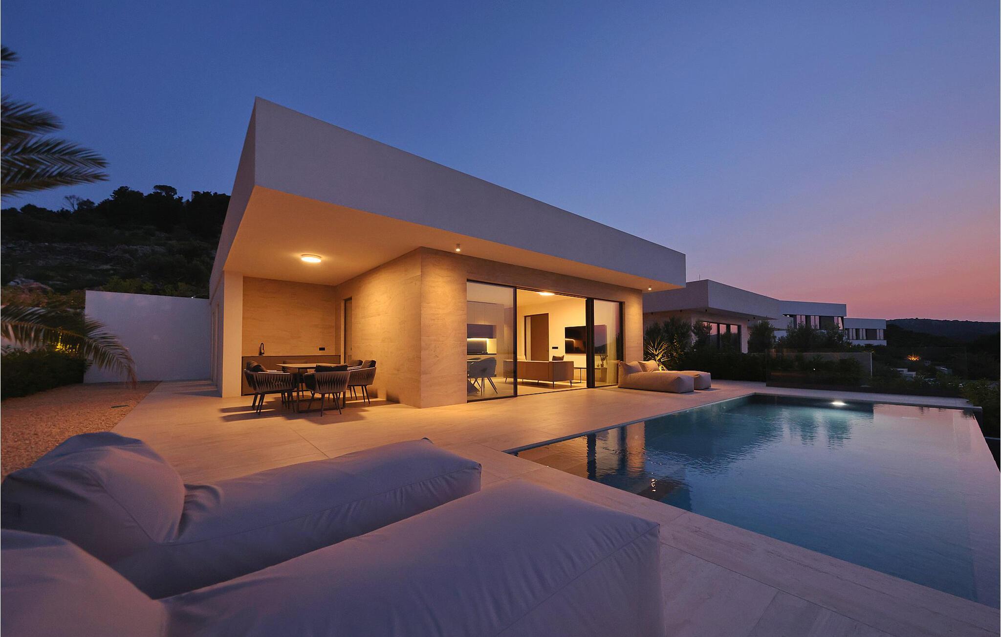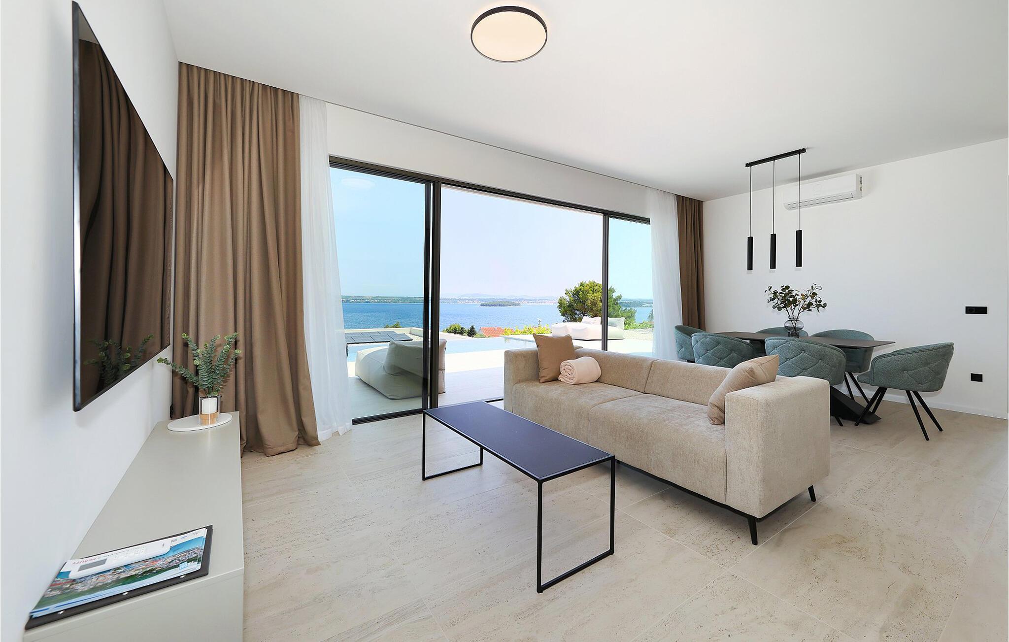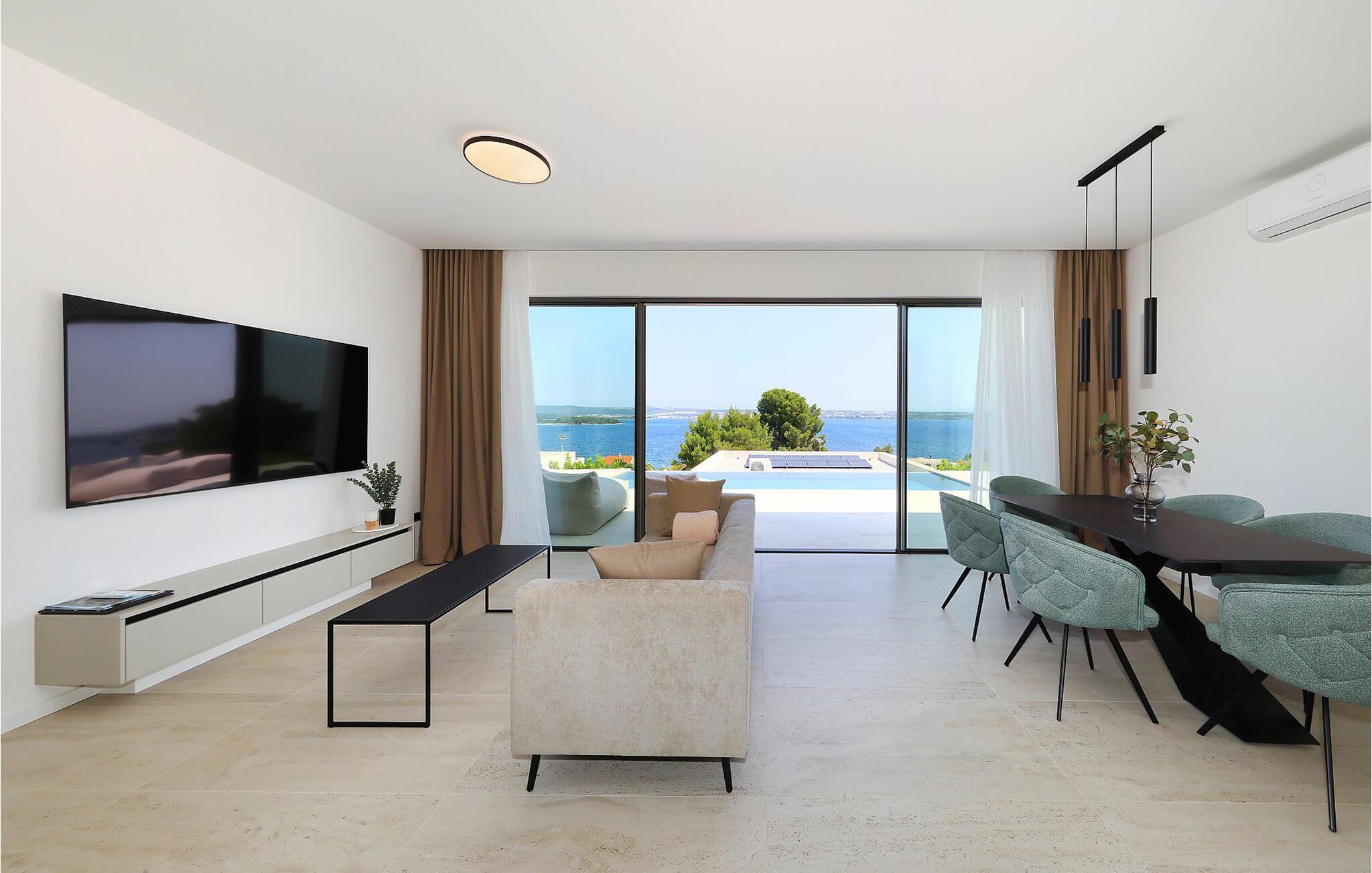 Denne romslige, moderne villaen oppfyller de høyeste standarder og skjemmer deg bort med et lyst og komfortabelt interiør, hvor du kan beundre utsikten over det blå havet gang på gang. Du kan trylle frem kulinariske høydepunkter på det åpne kjøkkenet og slå deg ned ved det stilfulle spisebordet. Etter en lang dag i solen kan du se en film i sofaen eller prate ut i natten over et glass vin.