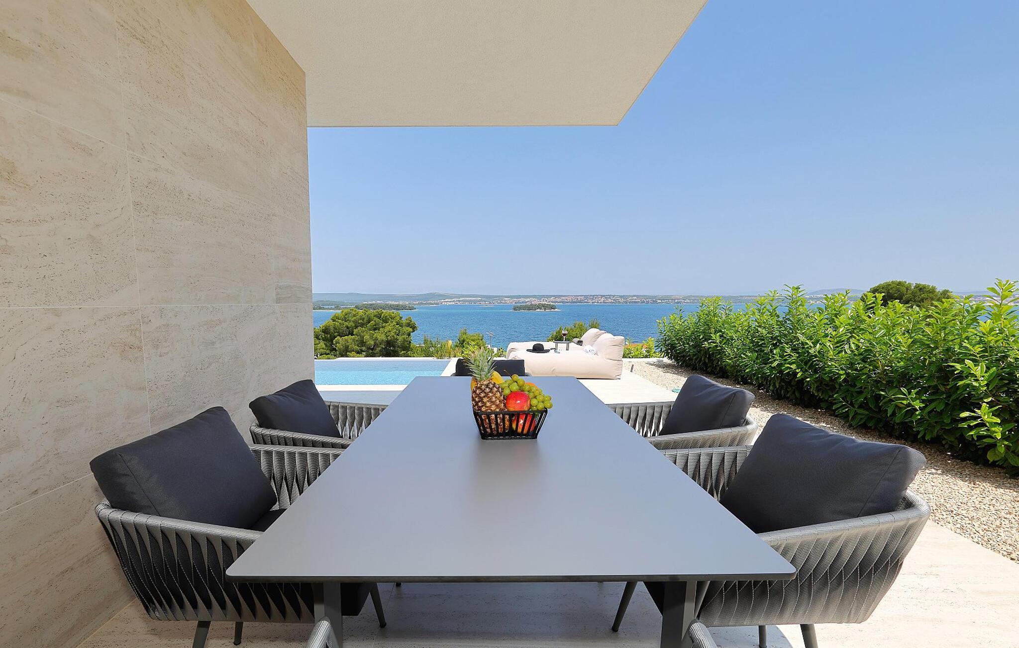 Det elegante uteområdet innbyr til soling i timevis. Start dagen med en deilig frokost i skyggen, og ta en rolig dukkert i evighetsbassenget. Nyt den stemningsfulle belysningen under uforglemmelige grillkvelder og nyt den varme havbrisen.