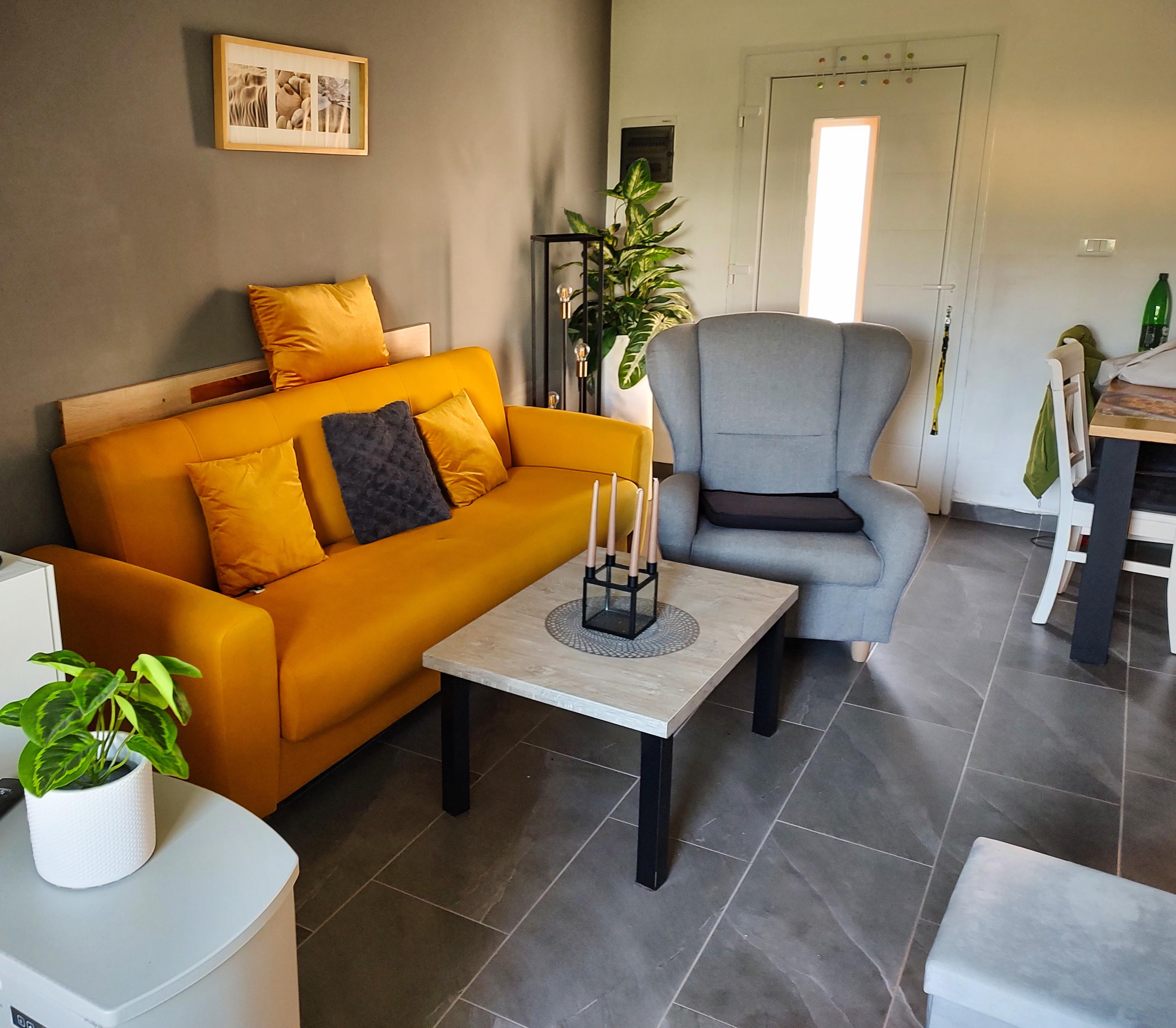 Wenn die Abende doch mal etwas kühl werden sollten, schafft der elektrische Kamin behagliche Wärme auf dem bequemen Sofa.