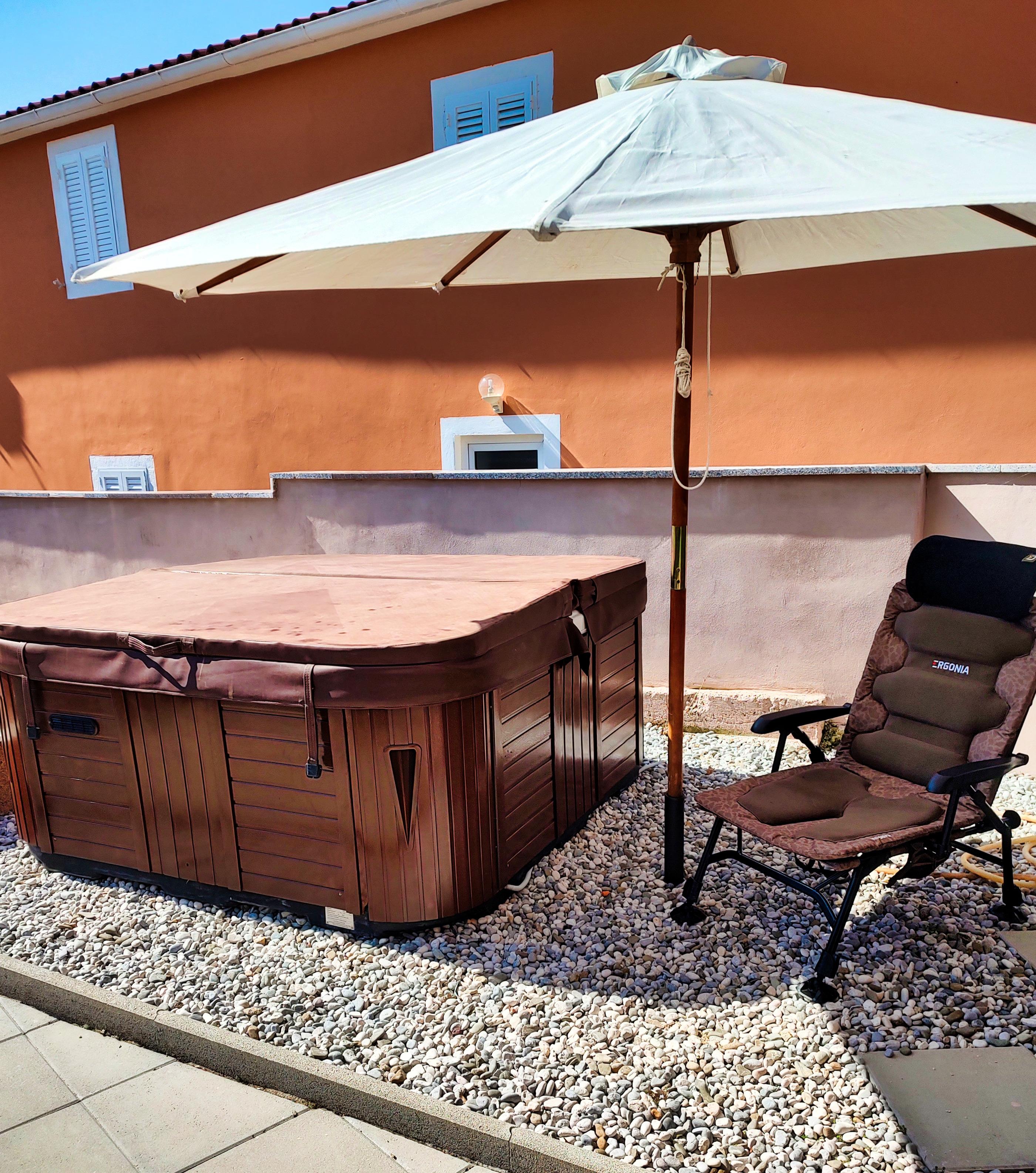 The Jacuzzi offers you in sunny days, with a cocktail in your hand, pleasant cooling and socializing. With only a few steps away from the Jacuzzi, enjoy the sunny hours in the covered seating area with outdoor kitchen and BBQ.