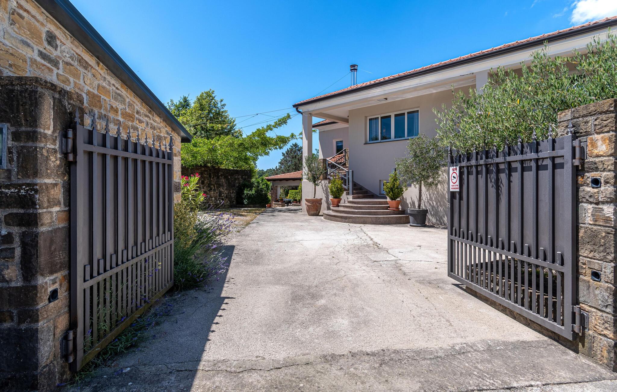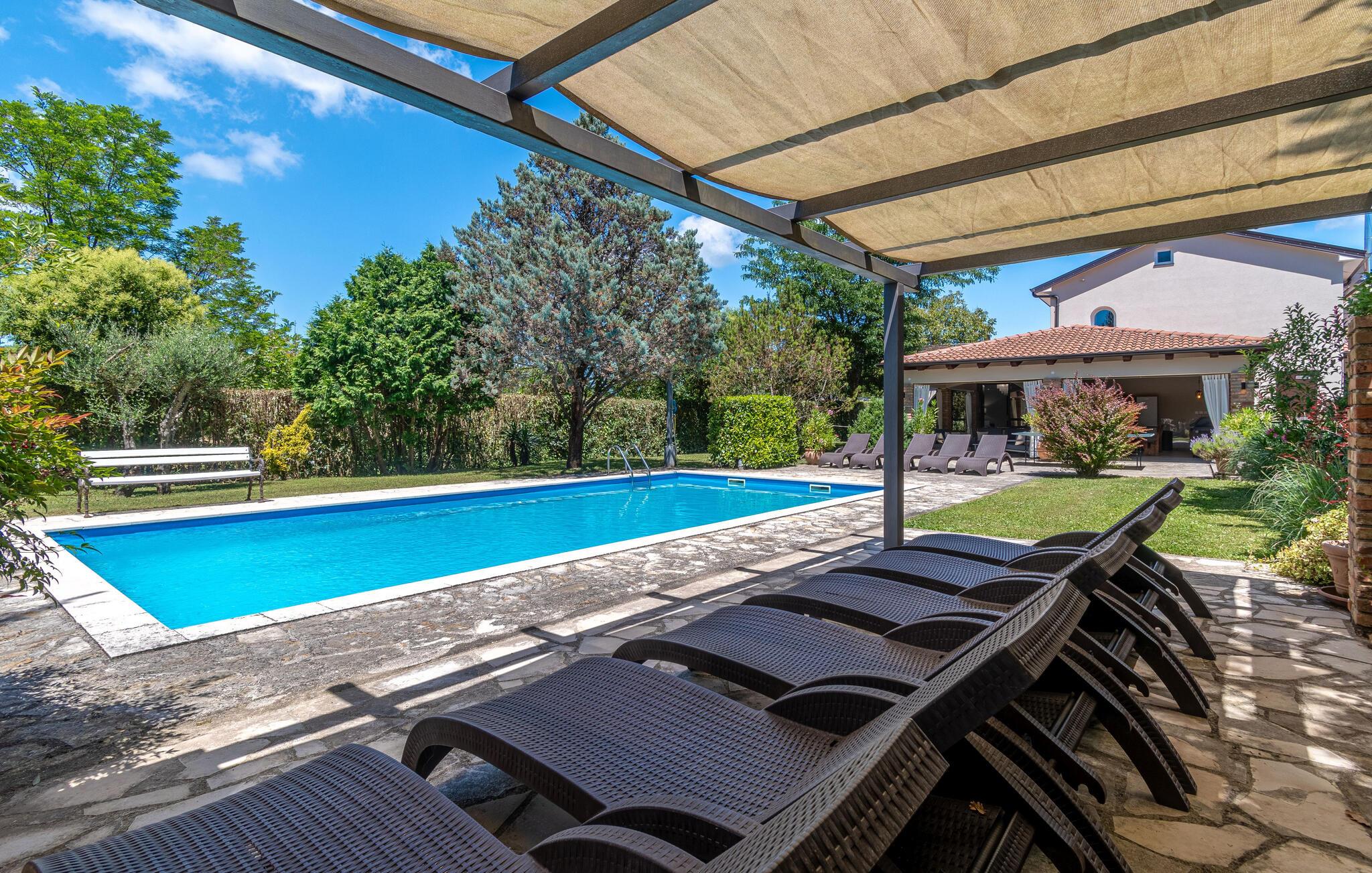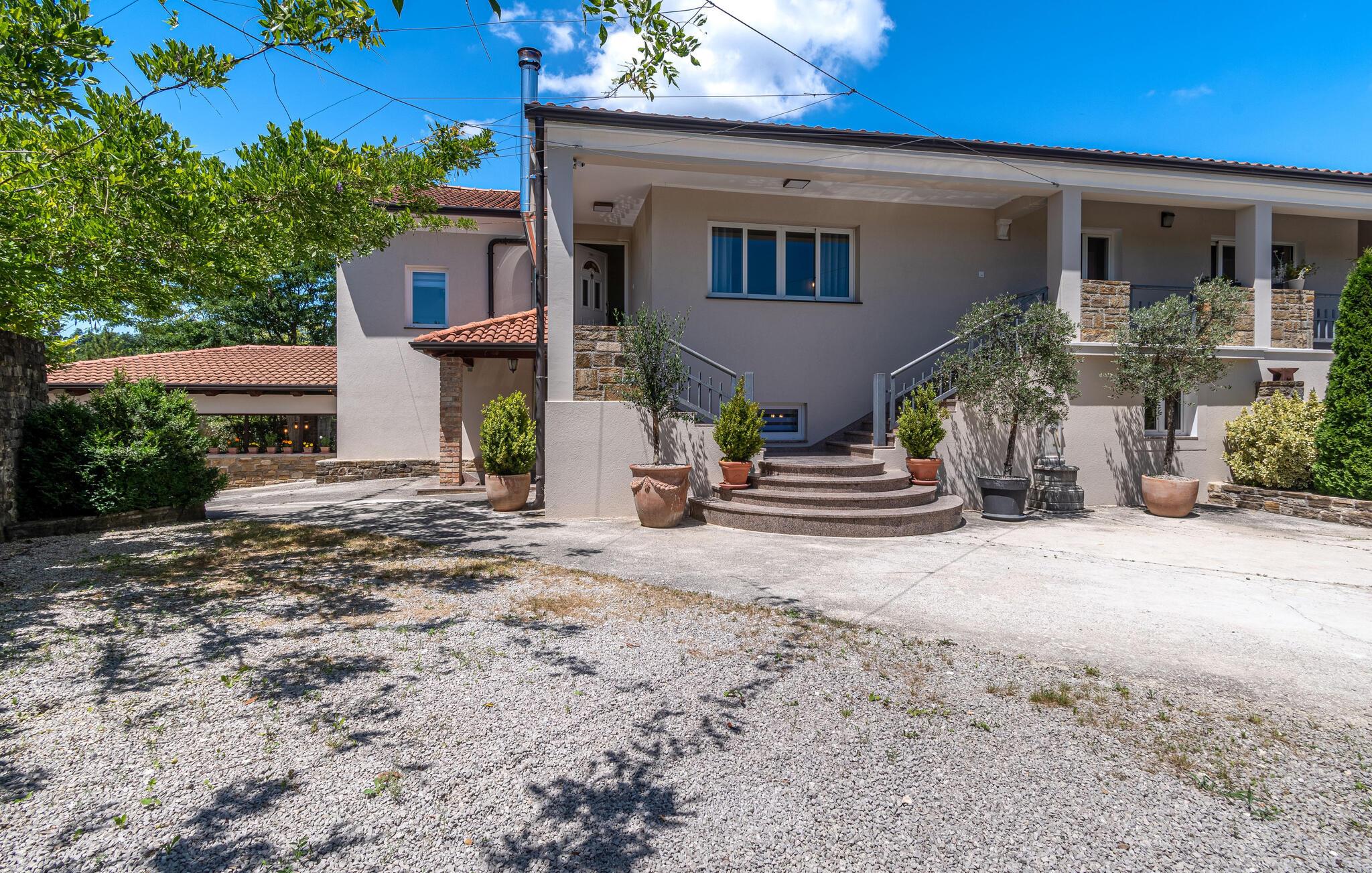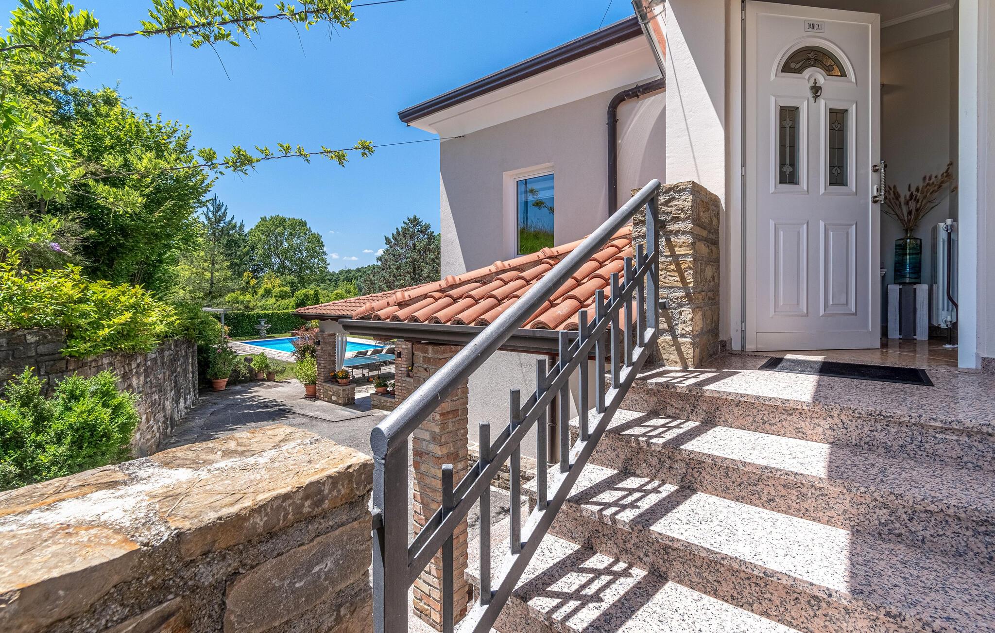 Dette vakre tomannsboligen med basseng og velholdt hage ligger i hjertet av Istria. De to halvdelene av huset er atskilt fra hverandre og kan bare nås utenfra. Alt er pent og komfortabelt innredet. I første etasje er det separate innganger til stuen og det ekstra soverommet med eget bad. I 1. etasje finner du de resterende tre soverommene, badet og kjøkkenet med spisestuen. I hagen er det fasiliteter for volleyball, badminton, fotball og en lekeplass for barn. Det omkringliggende landskapet er grønt og hjem til mange konobas og vingårder, og inviterer deg til å ta fantastiske turer. Smak på det istriske kjøkkenet, spesielt den deilige rå skinken med ost, oliven eller den tradisjonelle suppen, som er en spesialitet i hele Istria. Besøk de historiske og romantiske kystbyene, deres severdigheter og monumenter, nyt det rike nattelivet og dra nytte av mulighetene for forskjellige utflukter. Eieren bor i den andre halvdelen av huset. Det er en kafé ved siden av huset.