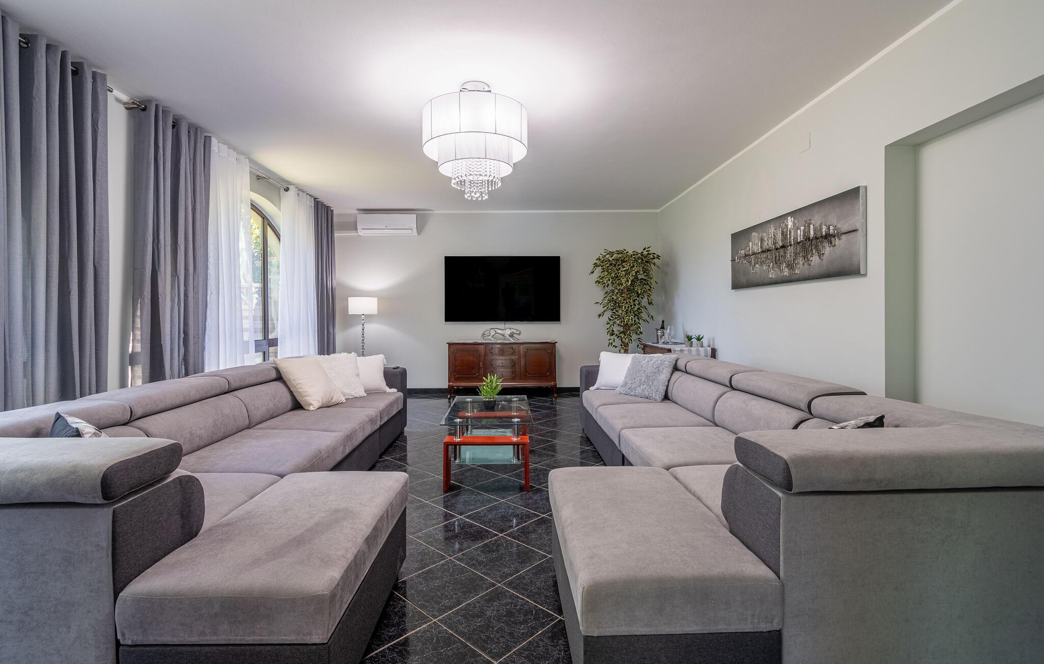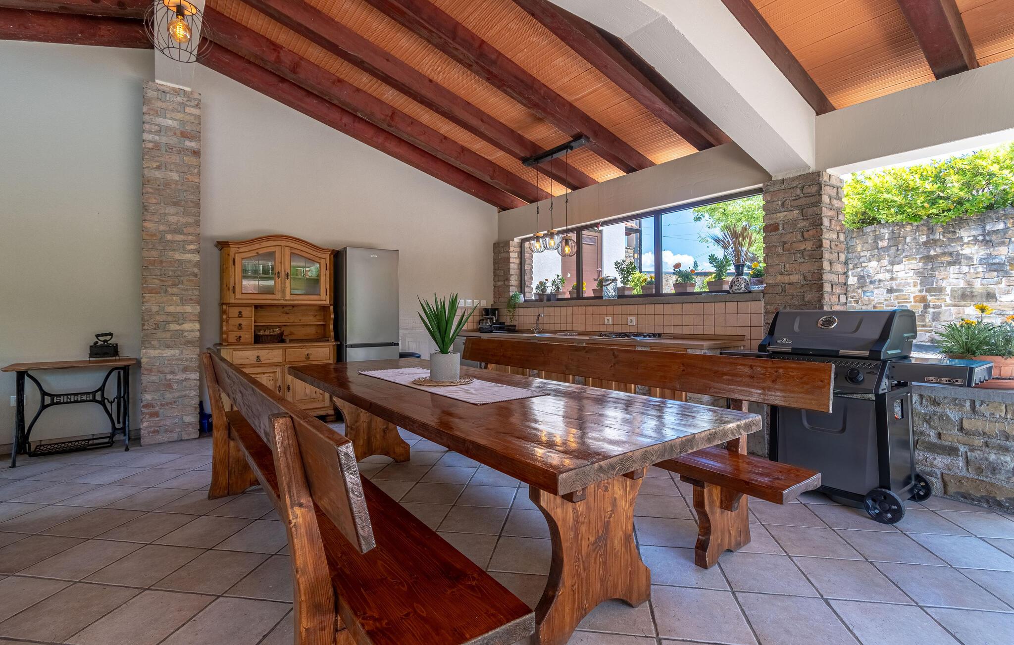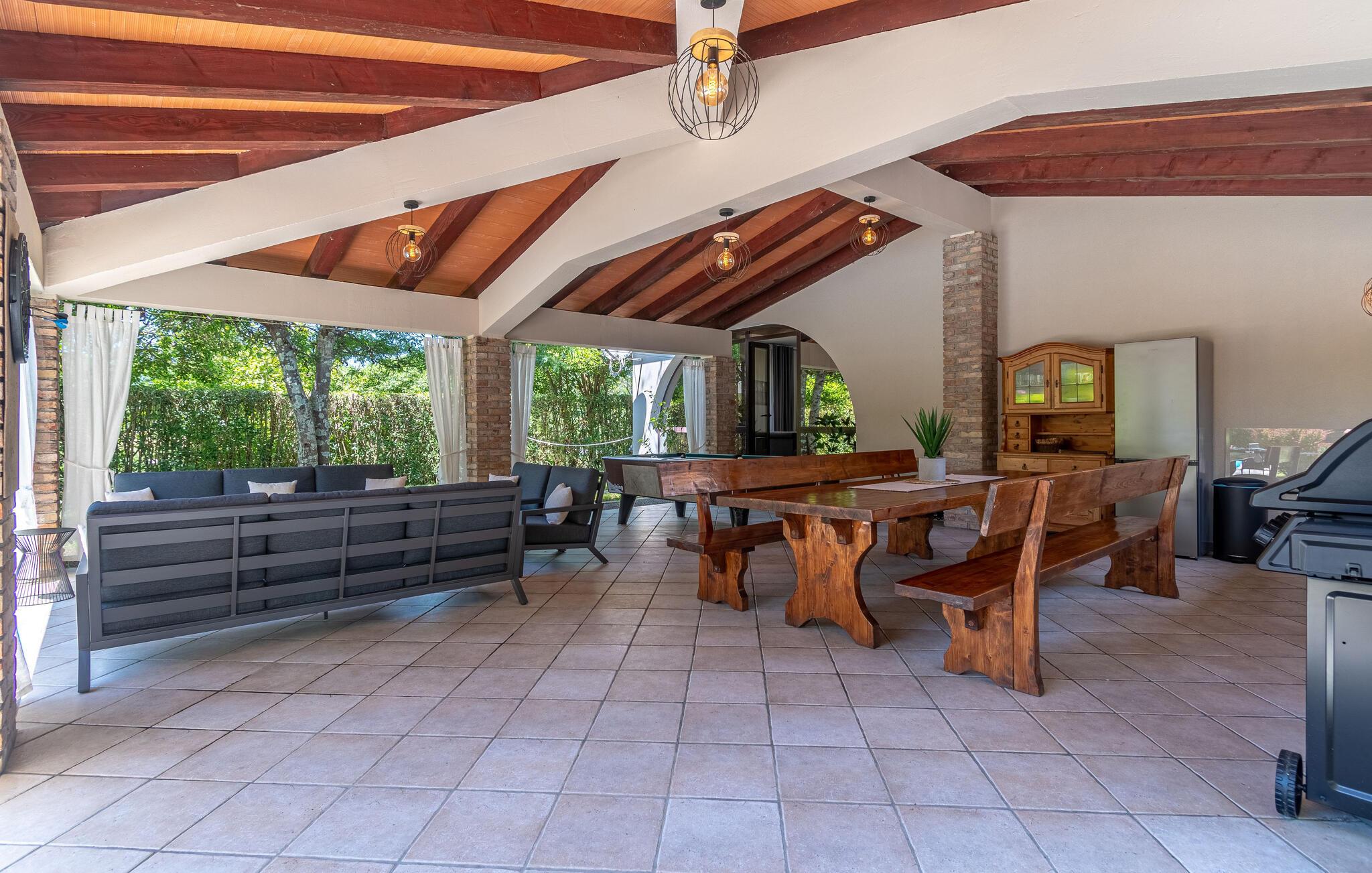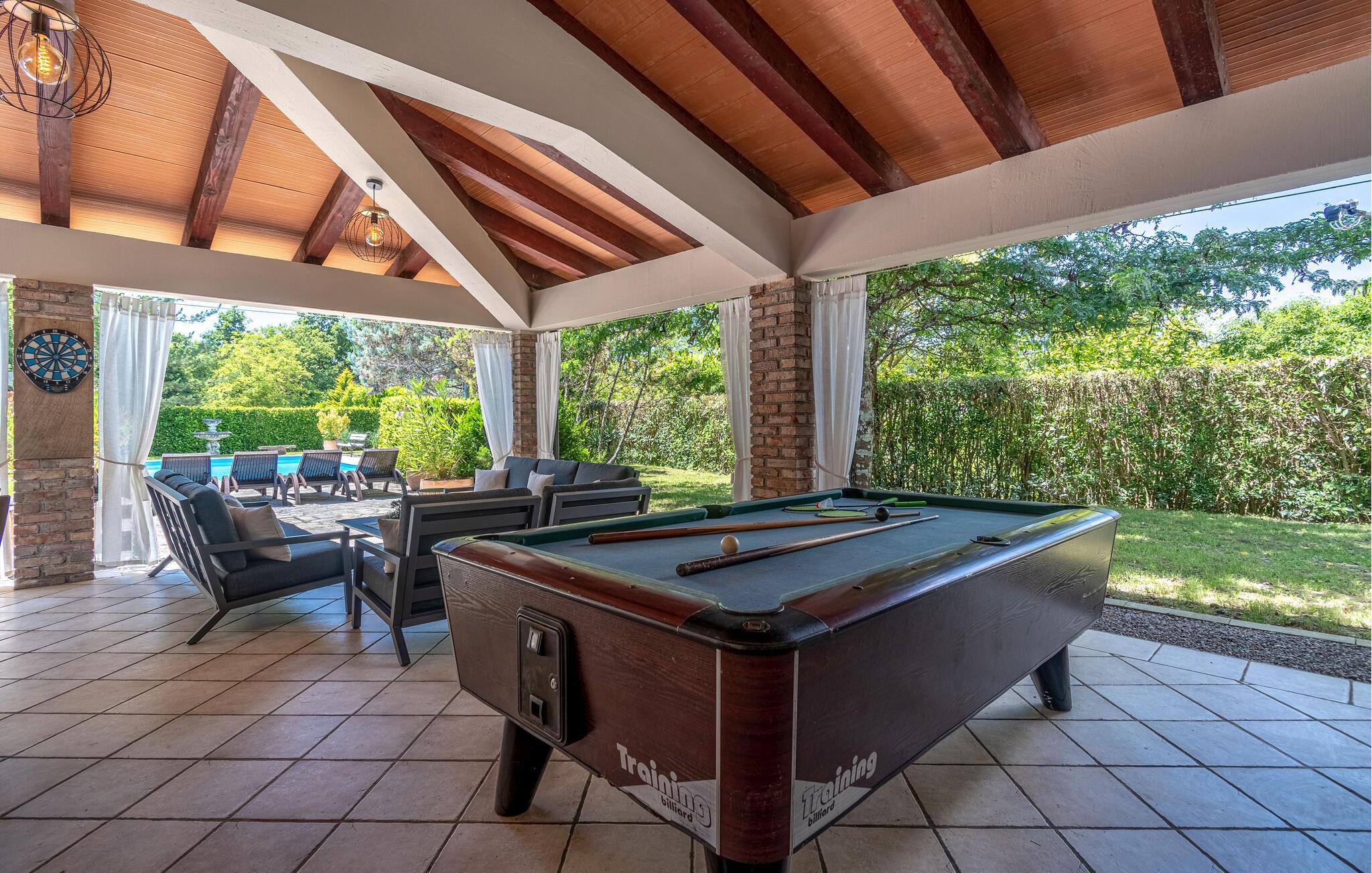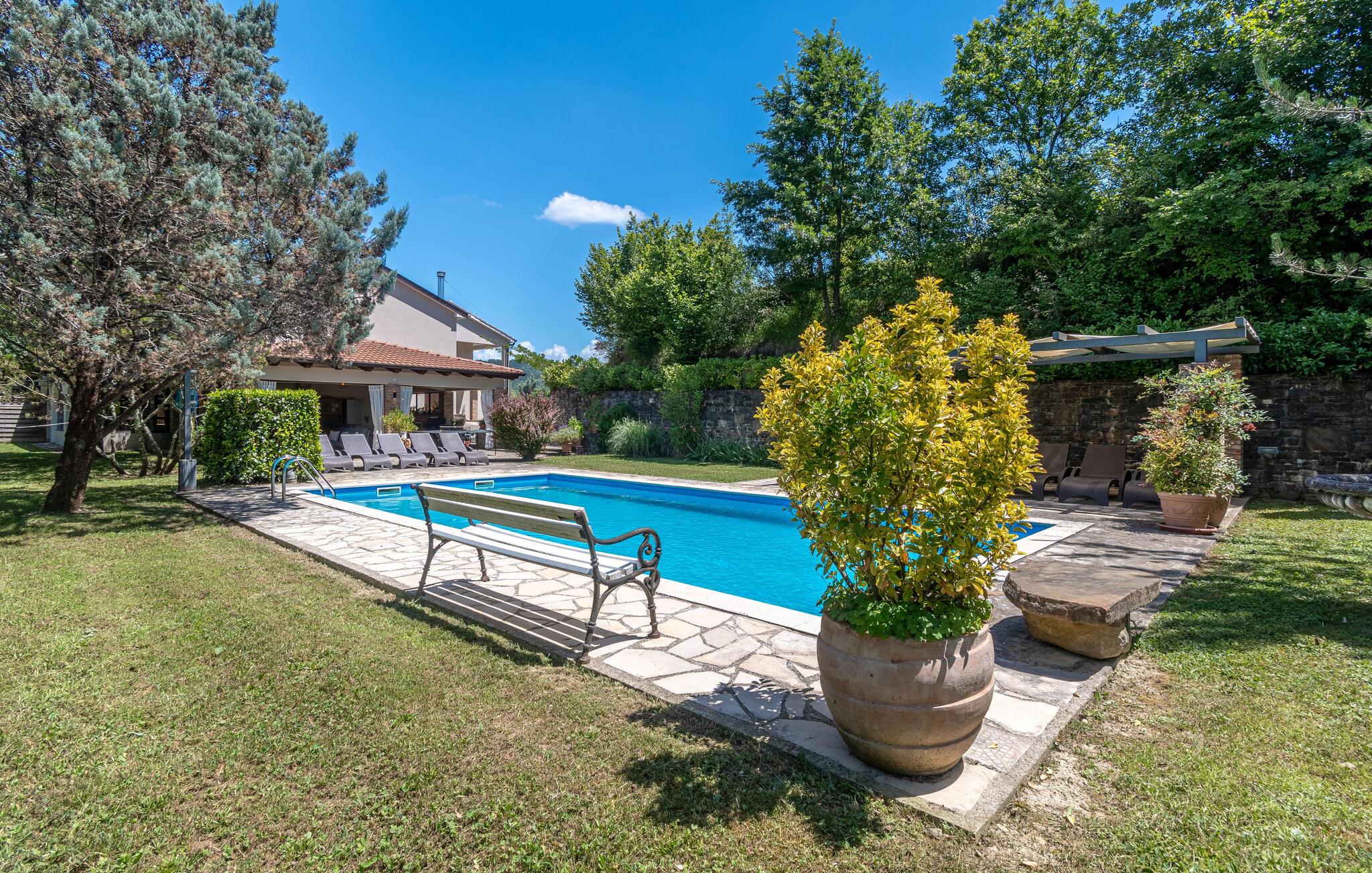 Dette vakre tomannsboligen med basseng og velholdt hage ligger i hjertet av Istria. De to halvdelene av huset er atskilt fra hverandre og kan bare nås utenfra. Alt er pent og komfortabelt innredet. I første etasje er det separate innganger til stuen og det ekstra soverommet med eget bad. I 1. etasje finner du de resterende tre soverommene, badet og kjøkkenet med spisestuen. I hagen er det fasiliteter for volleyball, badminton, fotball og en lekeplass for barn. Det omkringliggende landskapet er grønt og hjem til mange konobas og vingårder, og inviterer deg til å ta fantastiske turer. Smak på det istriske kjøkkenet, spesielt den deilige rå skinken med ost, oliven eller den tradisjonelle suppen, som er en spesialitet i hele Istria. Besøk de historiske og romantiske kystbyene, deres severdigheter og monumenter, nyt det rike nattelivet og dra nytte av mulighetene for forskjellige utflukter. Eieren bor i den andre halvdelen av huset. Det er en kafé ved siden av huset.